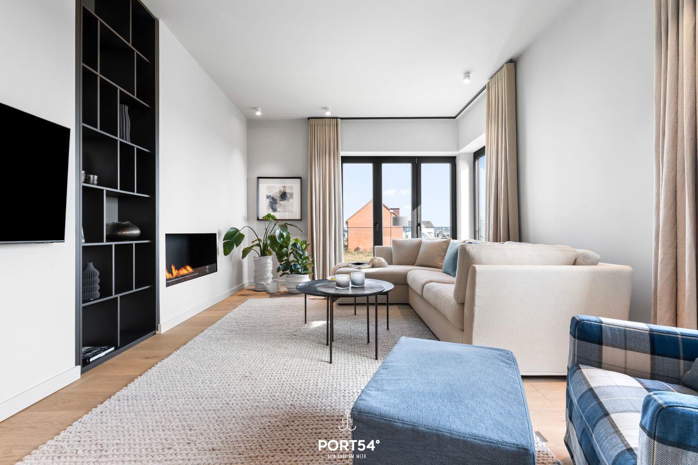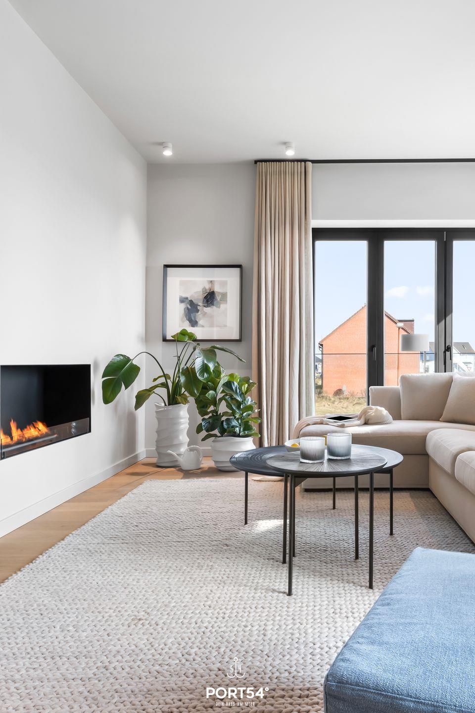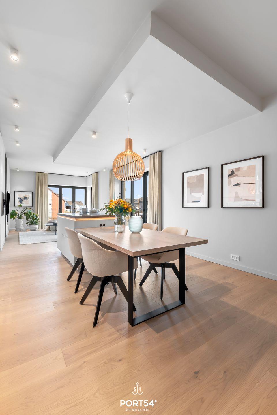 Ein offener Wohnbereich mit großzügiger Sofaecke, Ethanol Kamin und Esstisch lädt zum Verweilen ein und bietet einen perfekten Ort für gesellige Abende. Die voll ausgestattete offene Küche von SieMatic punktet mit modernen Geräten wie einem Induktionsherd, Backofen, Kühlschrank, Spülmaschine und einem Weinkühlschrank. Hier können Sie kreative Gerichte zubereiten oder einfach das Frühstück auf dem Balkon genießen, während Sie die frische Meeresbrise einatmen. Außerdem finden Sie in der Küche einen Quooker, damit lässt sich problemlos heißes Wasser, sowie Sprudelwasser erzeugen.