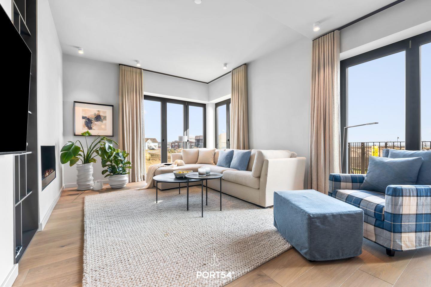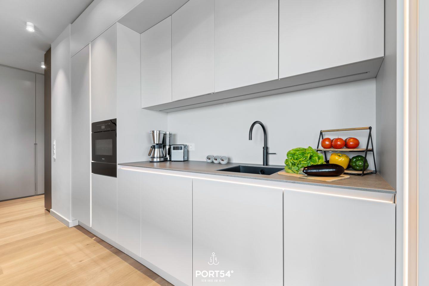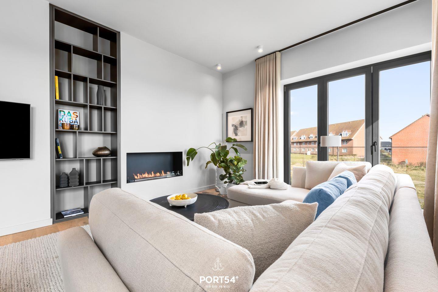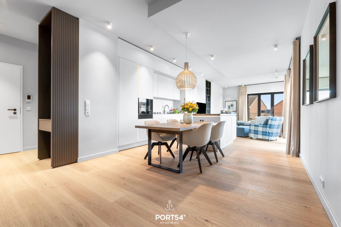 Ein offener Wohnbereich mit großzügiger Sofaecke, Ethanol Kamin und Esstisch lädt zum Verweilen ein und bietet einen perfekten Ort für gesellige Abende. Die voll ausgestattete offene Küche von SieMatic punktet mit modernen Geräten wie einem Induktionsherd, Backofen, Kühlschrank, Spülmaschine und einem Weinkühlschrank. Hier können Sie kreative Gerichte zubereiten oder einfach das Frühstück auf dem Balkon genießen, während Sie die frische Meeresbrise einatmen. Außerdem finden Sie in der Küche einen Quooker, damit lässt sich problemlos heißes Wasser, sowie Sprudelwasser erzeugen.