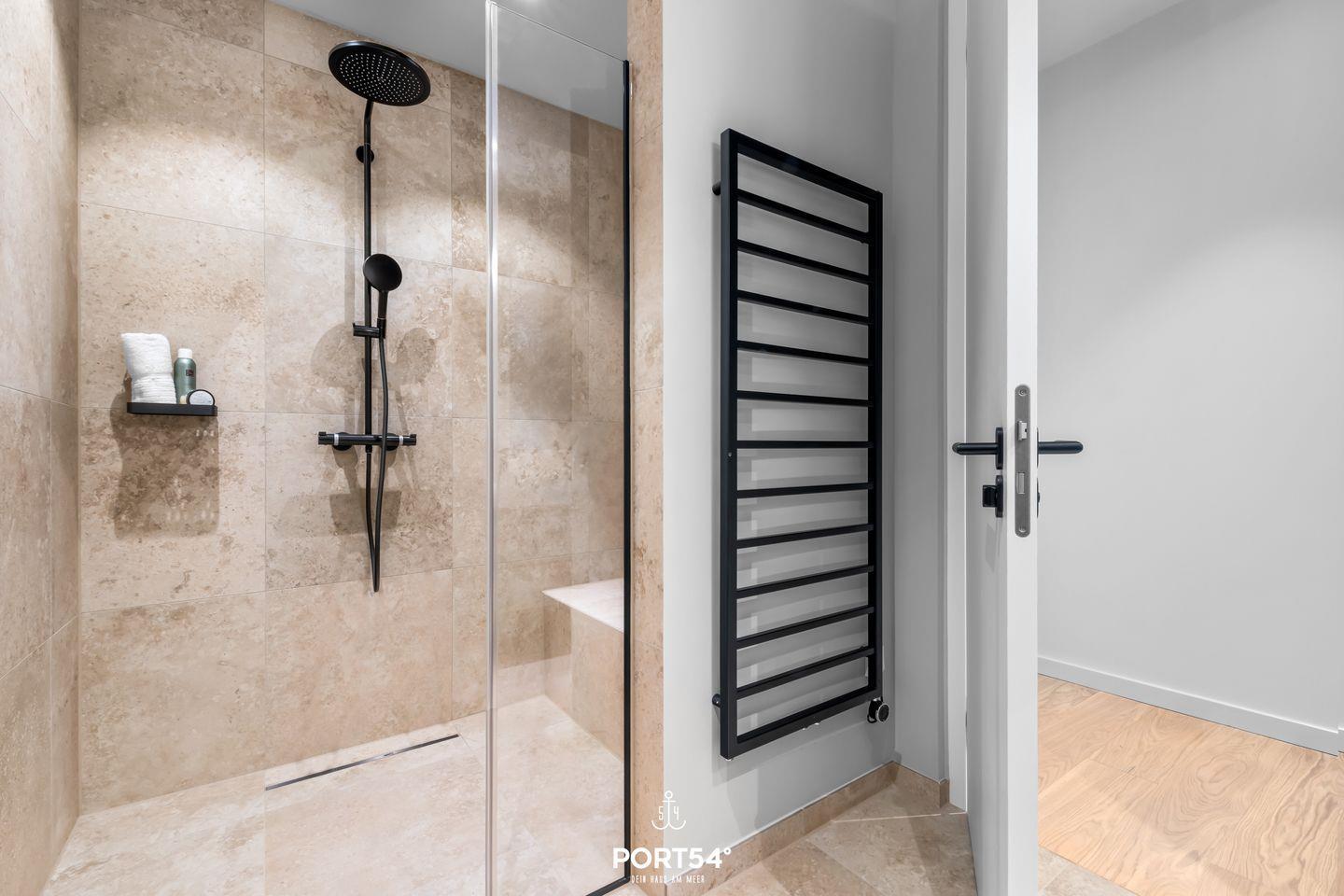 Das Schlafzimmer bietet nicht nur ein gemütliches Doppelboxspringbett der Marke Schramm (180x200cm), sondern ist auch mit einer Fußbodenheizung ausgestattet, die für Wohlfühlatmosphäre sorgt. Das elegante Badezimmer mit einer großzügigen bodengleichen Dusche und integriertem Infrarotpaneel runden das Angebot ab.