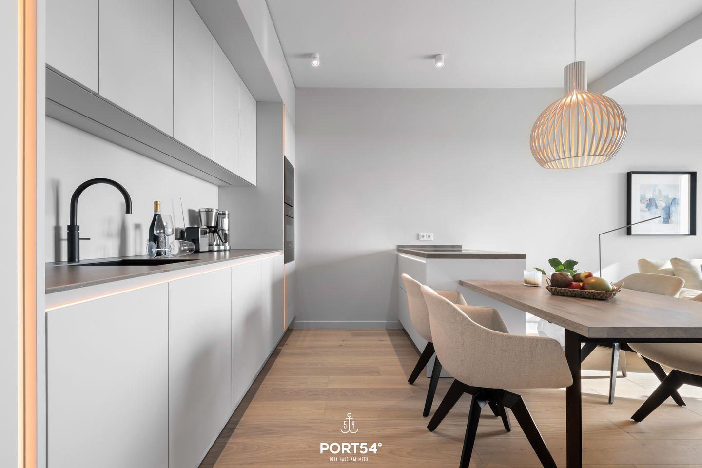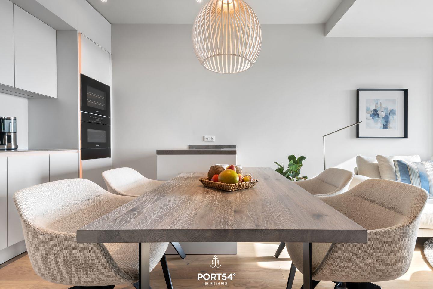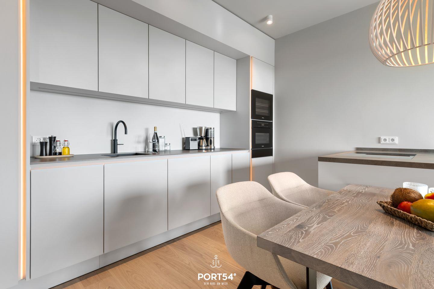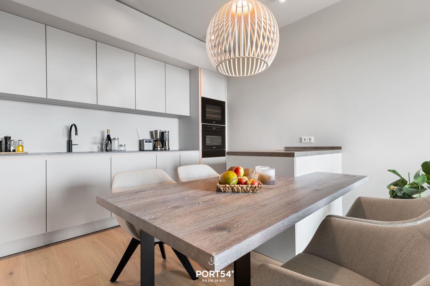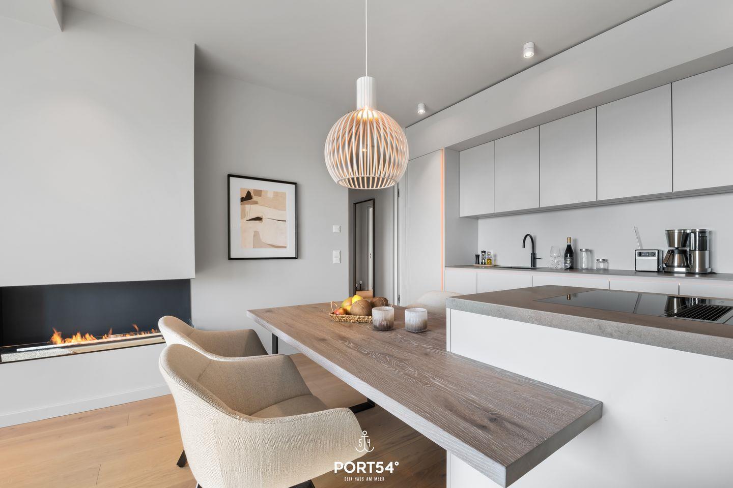 Die offene Küche, die nahtlos in den Wohnbereich übergeht, lässt das Herz jedes Hobbykochs höher schlagen. Sie ist vollständig ausgestattet mit modernen Geräten, einschließlich einem Induktionsherd, einem Weinkühlschrank, Quooker und Backofen mit Wärmeschublade.