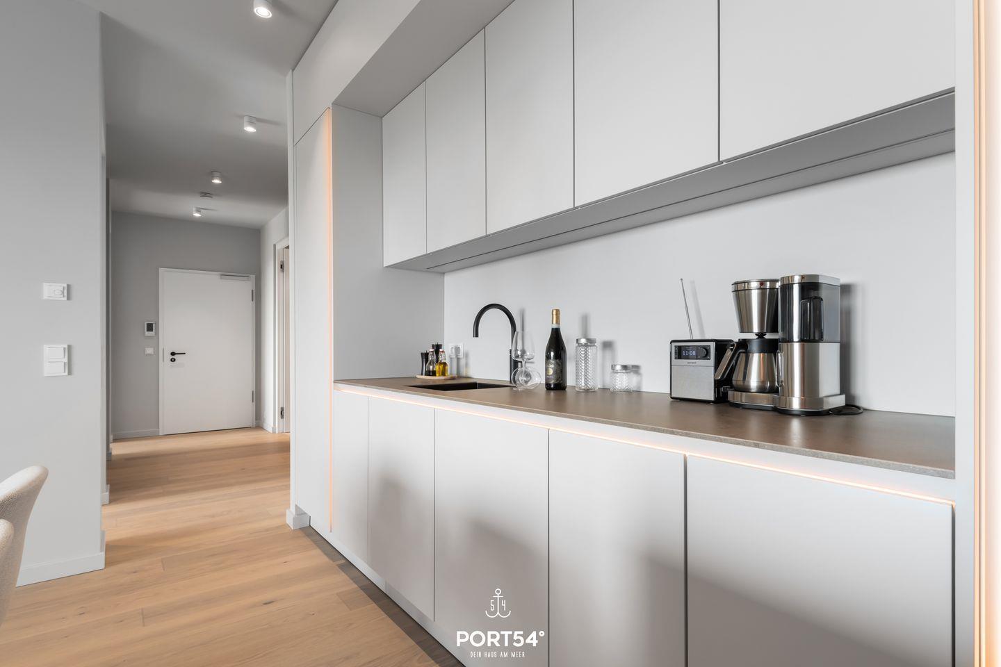Herzstück der Wohnung ist der offene Wohnbereich, der hell und einladend ist. Die moderne Küche von SieMatic ist mit einem Induktionsherd, Backofen, Wärmeschublade und einem Geschirrspüler voll ausgestattet. Außerdem finden Sie in der Küche einen Quooker, damit lässt sich problemlos heißes Wasser, sowie Sprudelwasser erzeugen. Für gemütliche Abende steht Ihnen ein bequemer Sofabereich zur Verfügung, um die Zeit gemeinsam zu verbringen oder einen Film auf dem Smart-TV zu genießen.
