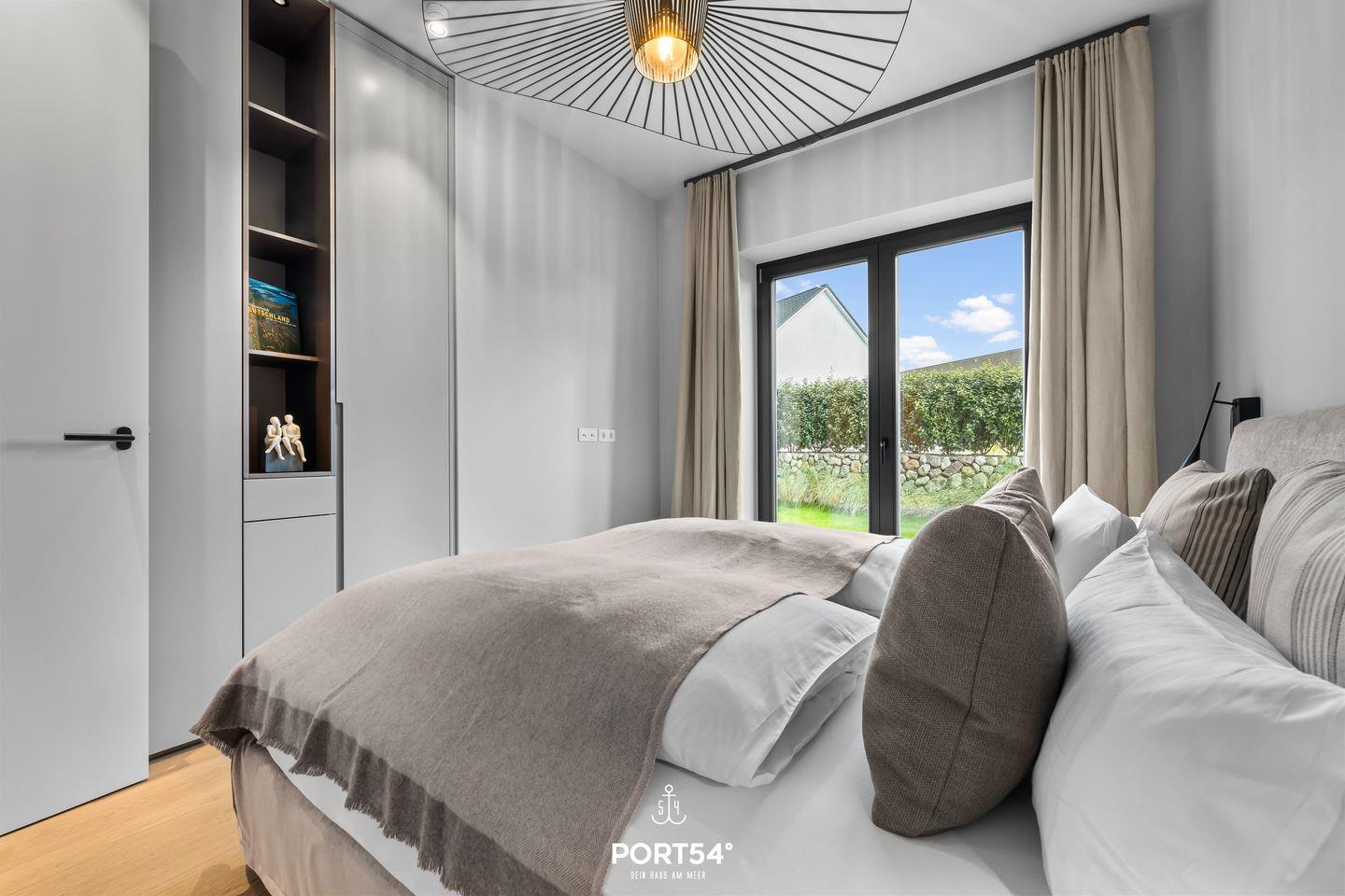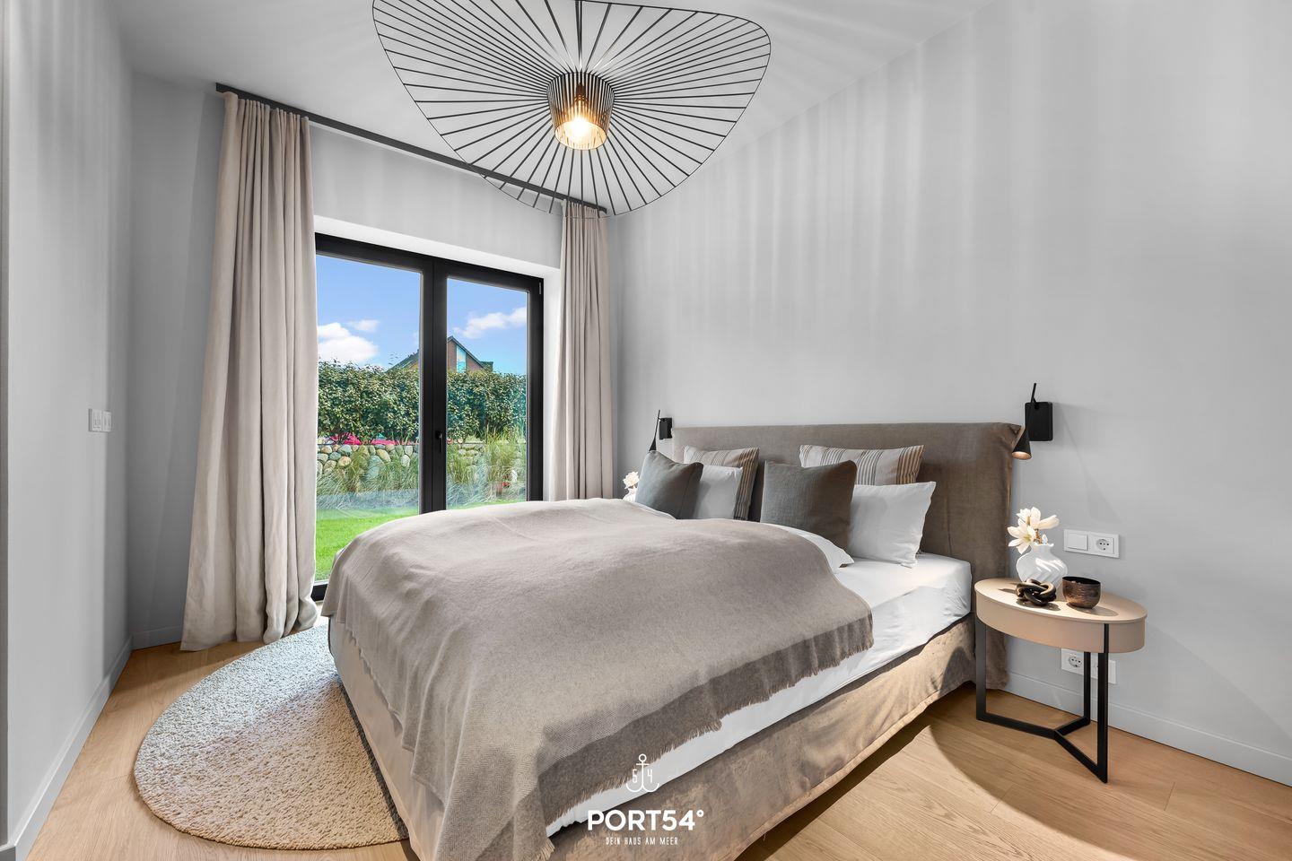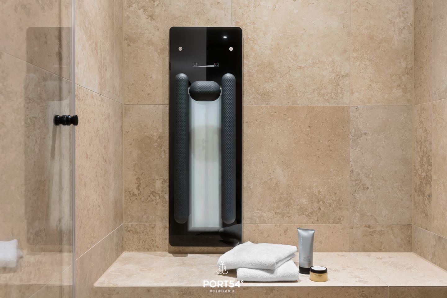 Die Coastal Suite ist mit zwei komfortablen Schlafzimmern ausgestattet, die Ruhe und Entspannung versprechen. Jedes Schlafzimmer, eins ausgestattet mit einem Doppelboxspringbett der Marke Schramm (180x200cm), das andere mit einem Schlafsofa (160x200cm), ist geschmackvoll eingerichtet und bietet den idealen Raum für erholsame Nächte nach einem aufregenden Tag an der frischen Luft. In dem elegant gestalteten Badezimmer mit bodengleicher Dusche und eingebautem Infrarotpaneel kannst du dich einfach mal entspannen.