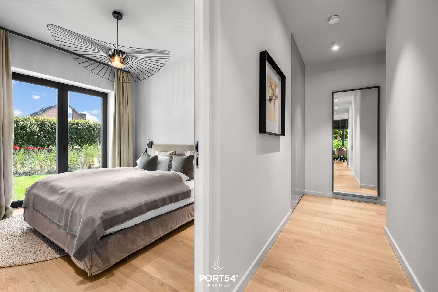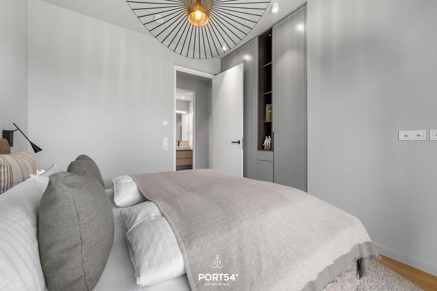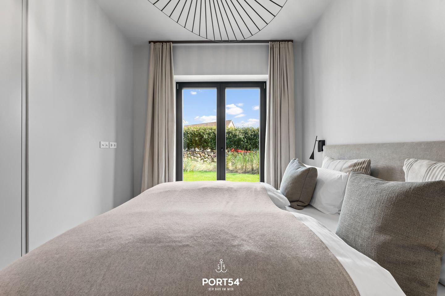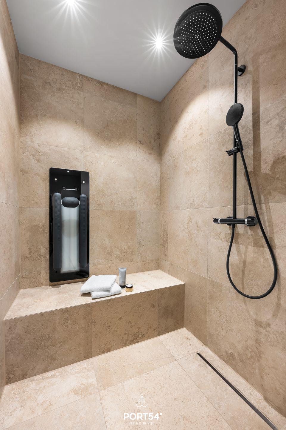 Die Coastal Suite ist mit zwei komfortablen Schlafzimmern ausgestattet, die Ruhe und Entspannung versprechen. Jedes Schlafzimmer, eins ausgestattet mit einem Doppelboxspringbett der Marke Schramm (180x200cm), das andere mit einem Schlafsofa (160x200cm), ist geschmackvoll eingerichtet und bietet den idealen Raum für erholsame Nächte nach einem aufregenden Tag an der frischen Luft. In dem elegant gestalteten Badezimmer mit bodengleicher Dusche und eingebautem Infrarotpaneel kannst du dich einfach mal entspannen.