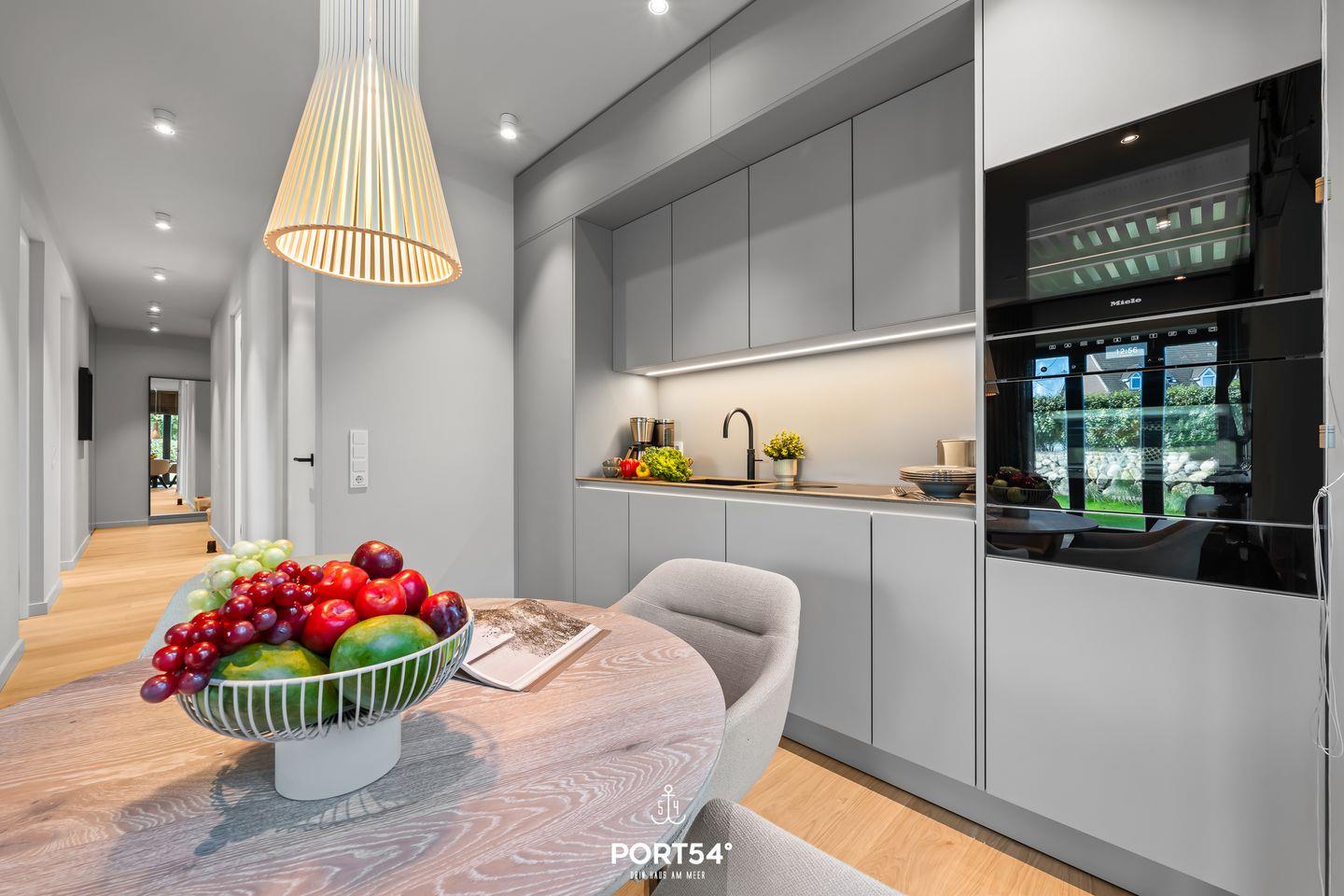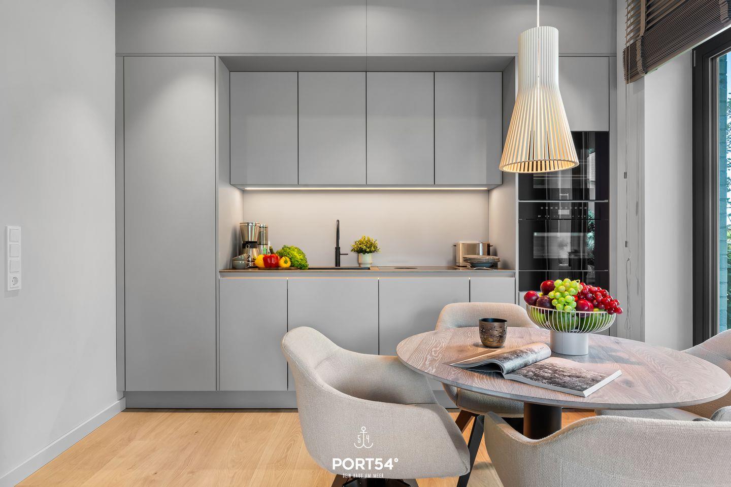 Herzstück der Wohnung ist der offene Wohnbereich, der hell und einladend ist. Die moderne Küche von SieMatic ist mit einem Induktionsherd, Backofen, Wärmeschublade und einem Geschirrspüler voll ausgestattet. Außerdem findest du in der Küche einen Quooker, mit dem sich problemlos heißes Wasser sowie Sprudelwasser erzeugen lassen. Für gemütliche Abende steht dir ein bequemer Sofabereich zur Verfügung, um die Zeit gemeinsam zu verbringen oder einen Film auf dem Smart-TV zu genießen.