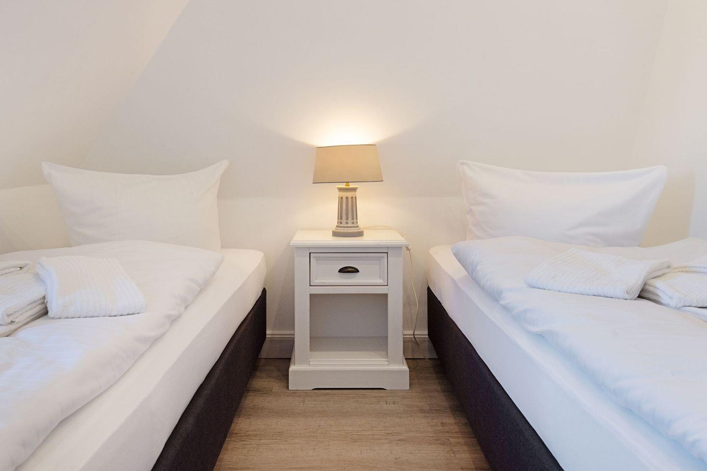 Das Friesennest verfügt über ein gemütliches Schlafzimmer mit zwei komfortablen Einzelbetten (diese lassen sich auch zusammenschieben), das für eine erholsame Nachtruhe sorgt. Der offene Wohnbereich ist die perfekte Auszeit, wenn die Seele nach Entspannung verlangt. Hier können Sie es sich auf der Couch bequem machen, die zur Sofaecke gehört, während Sie Ihre Lieblingssendungen auf dem Fernseher genießen. Ein Esstisch lädt zu gemeinsamen Mahlzeiten und geselligen Abenden ein.
