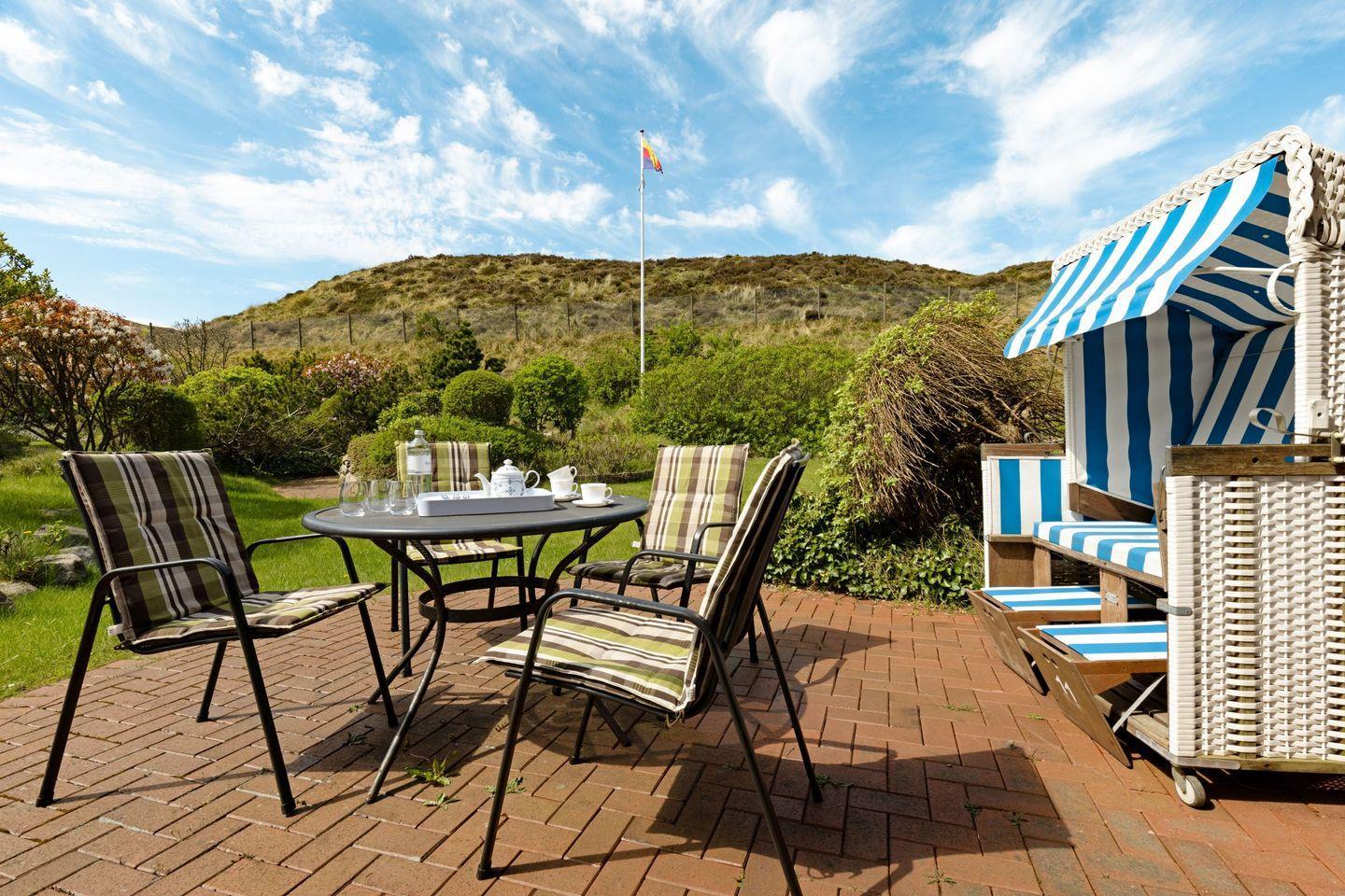 Auf der möblierten Terrasse genießen Sie die frische Nordseeluft und den Blick ins Grüne. Gartenmöbel und Strandkorb stehen Ihnen saisonal zur Verfügung.