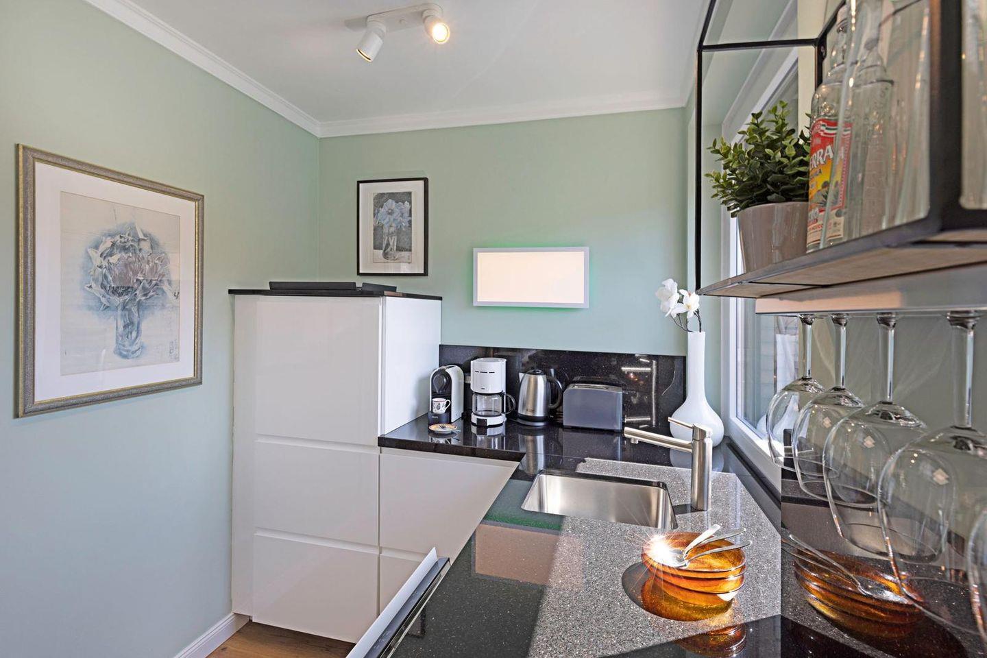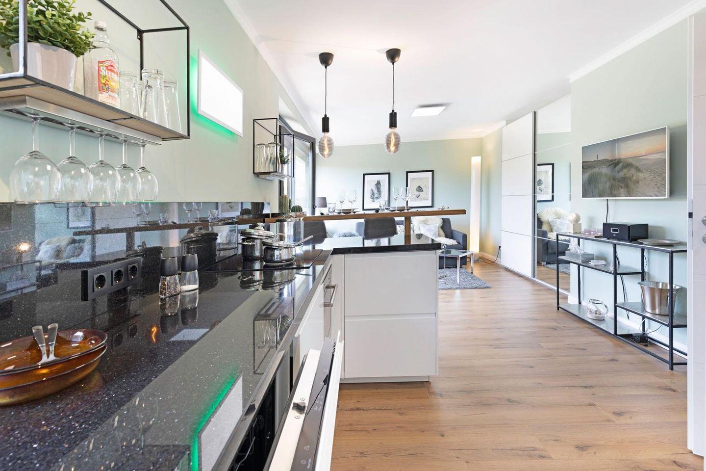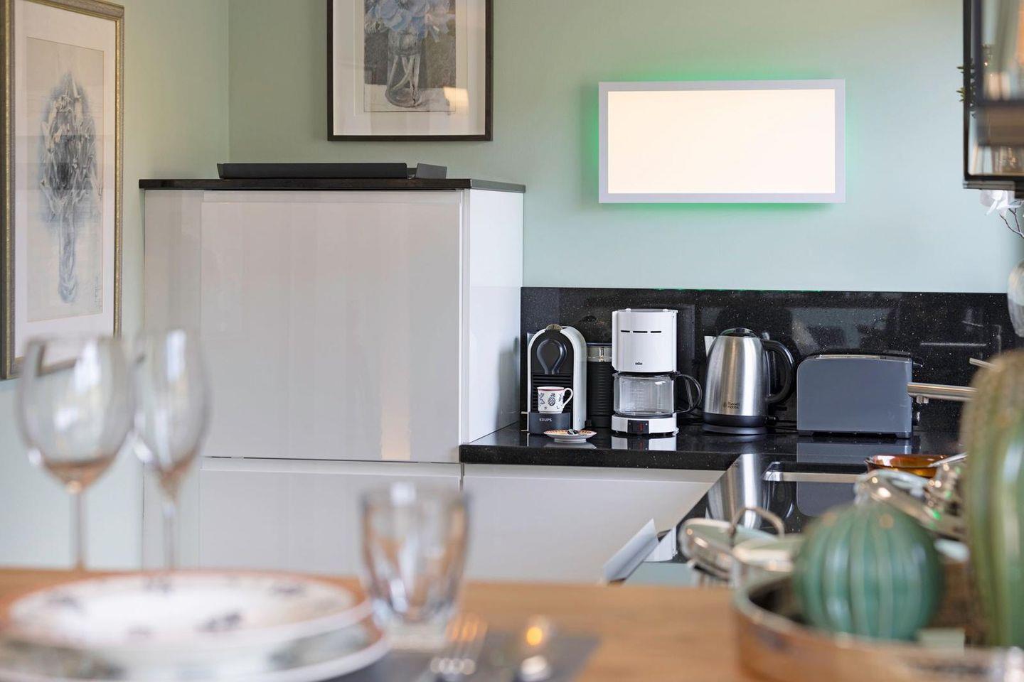 Die offene Küche ist direkt in den Wohnbereich integriert und funktional ausgestattet. Zur Verfügung stehen Ceranherd, Backofen, Mikrowelle, Kühlschrank mit Gefrierfach, Spülmaschine, Wasserkocher, Toaster, Kaffeemaschine sowie eine Nespresso-Espressomaschine. Geschirr, Besteck und Küchenutensilien sind vollständig vorhanden; auch an praktische Details wie Abfalleimer und Staubsauger wurde gedacht.