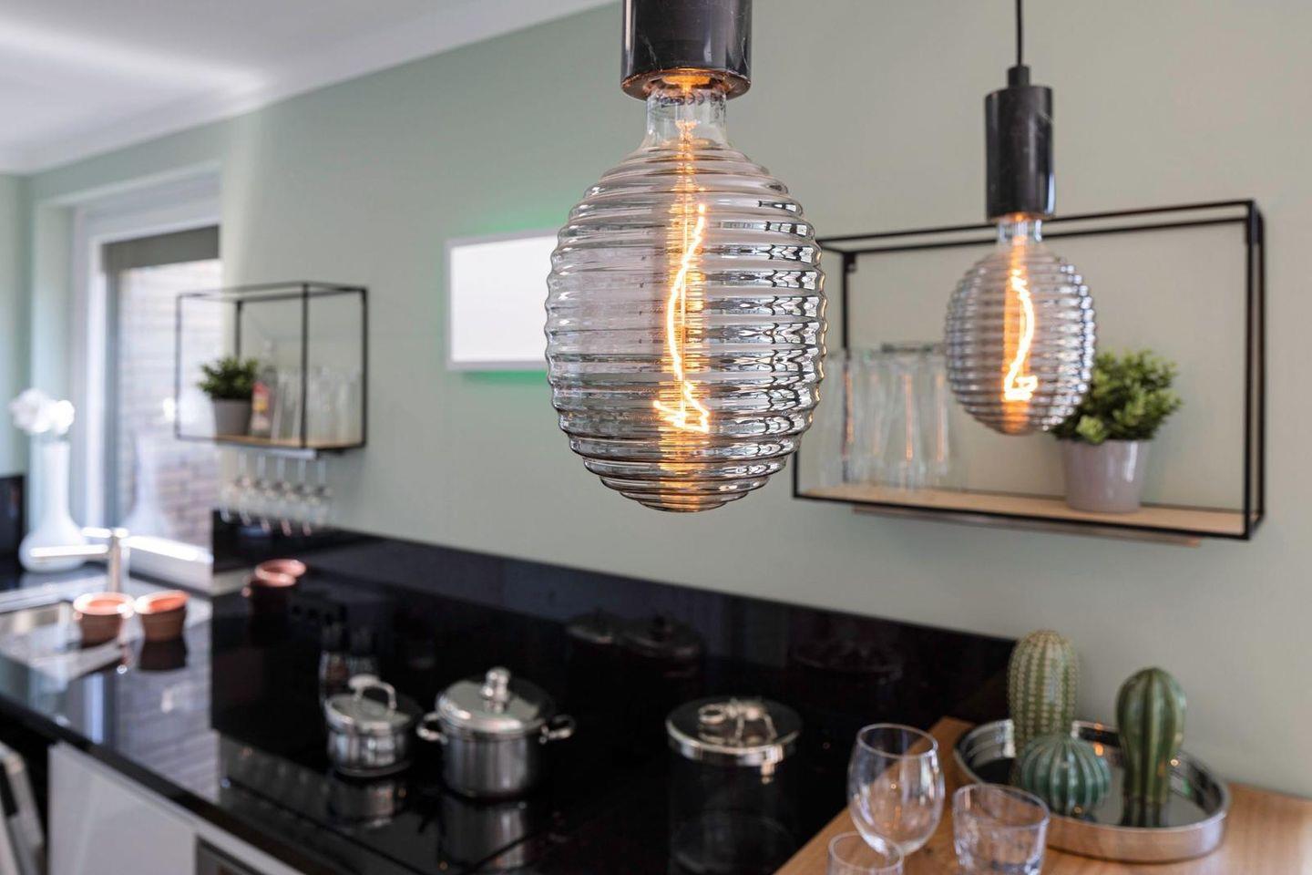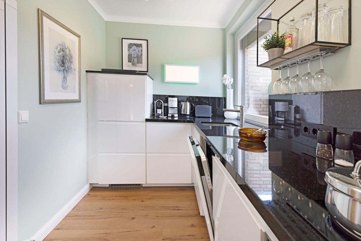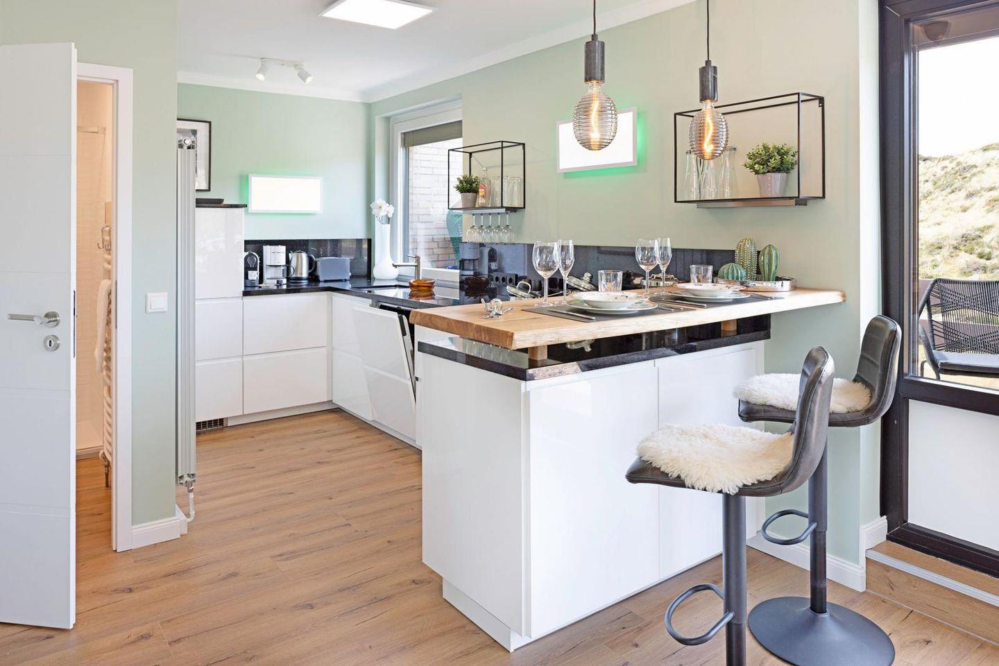 Die offene Küche ist direkt in den Wohnbereich integriert und funktional ausgestattet. Zur Verfügung stehen Ceranherd, Backofen, Mikrowelle, Kühlschrank mit Gefrierfach, Spülmaschine, Wasserkocher, Toaster, Kaffeemaschine sowie eine Nespresso-Espressomaschine. Geschirr, Besteck und Küchenutensilien sind vollständig vorhanden; auch an praktische Details wie Abfalleimer und Staubsauger wurde gedacht.