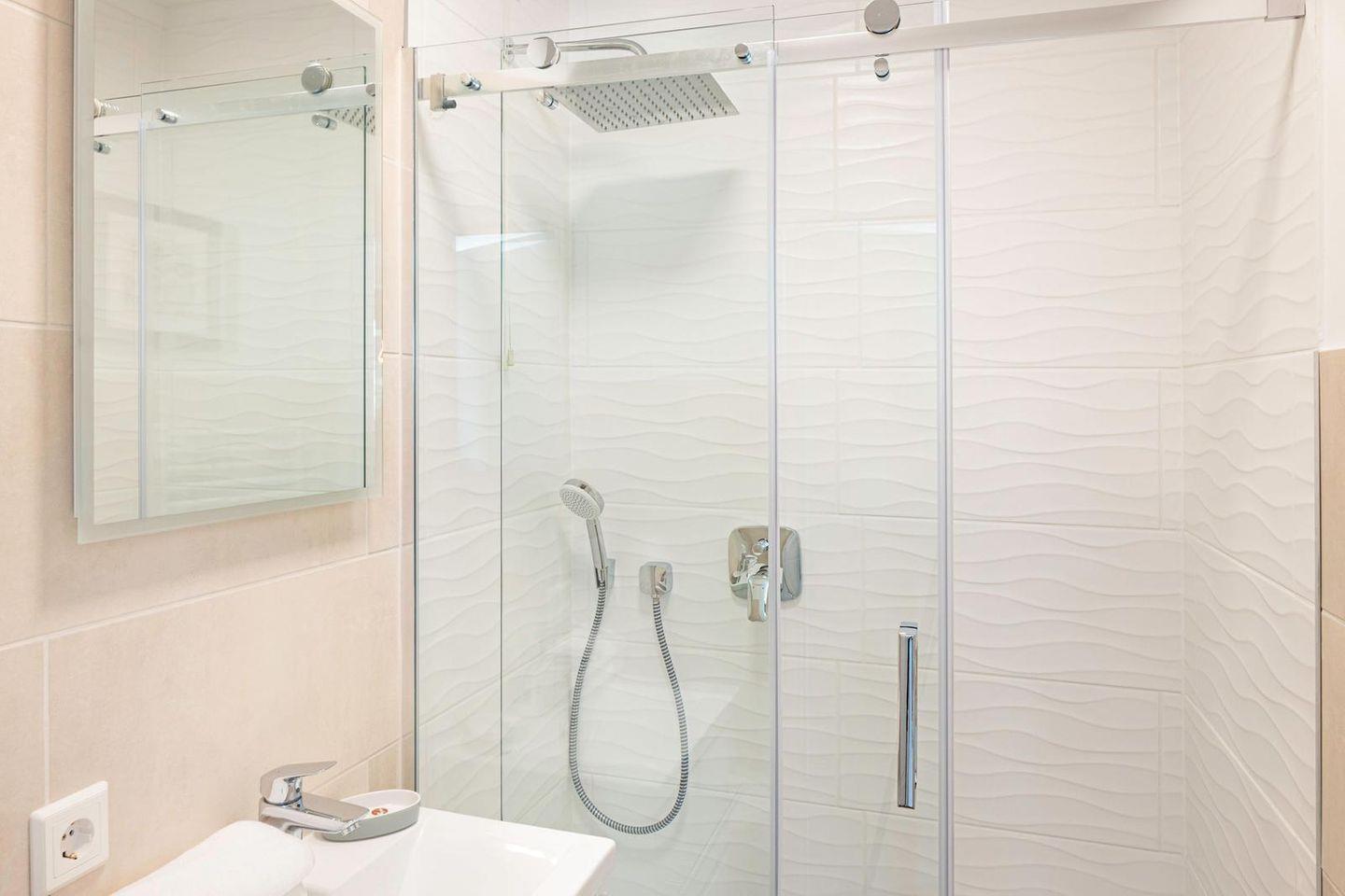Das Badezimmer ist mit Dusche, WC und Waschbecken ausgestattet. Haartrockner, Spiegel und Kosmetikspiegel ergänzen die Ausstattung. Für längere Aufenthalte stehen Waschmaschine und Trockner zur gemeinschaftlichen Nutzung gegen Gebühr zur Verfügung, außerdem gibt es einen Wäscheständer.