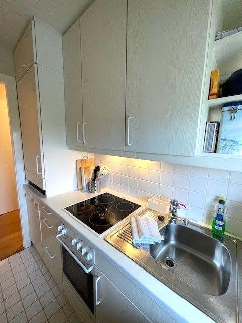 Die kleine Küche ist mit einem Ceranfeld, einem Backofen, einem Geschirrspüler und einer Filterkaffeemaschine eingerichtet.