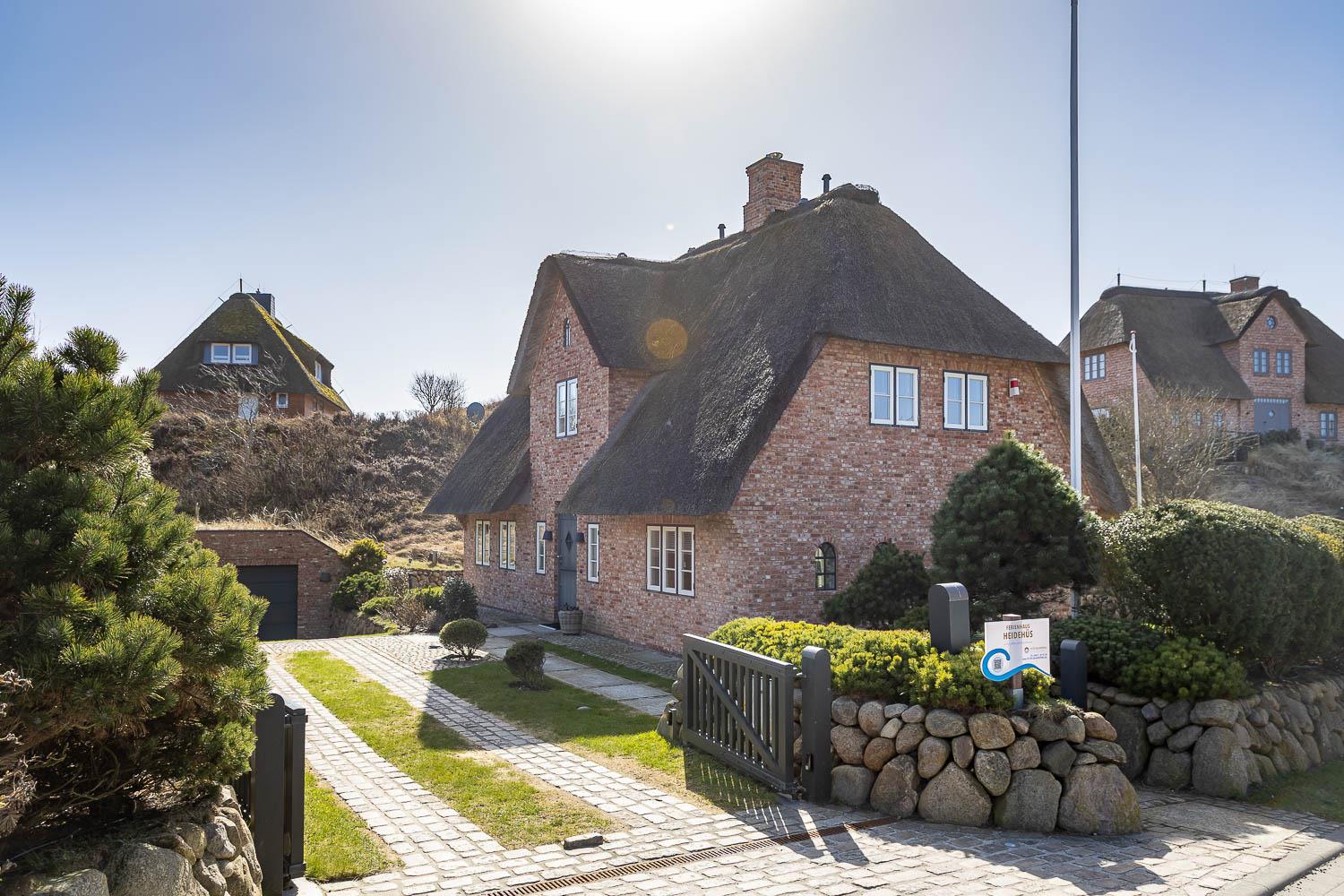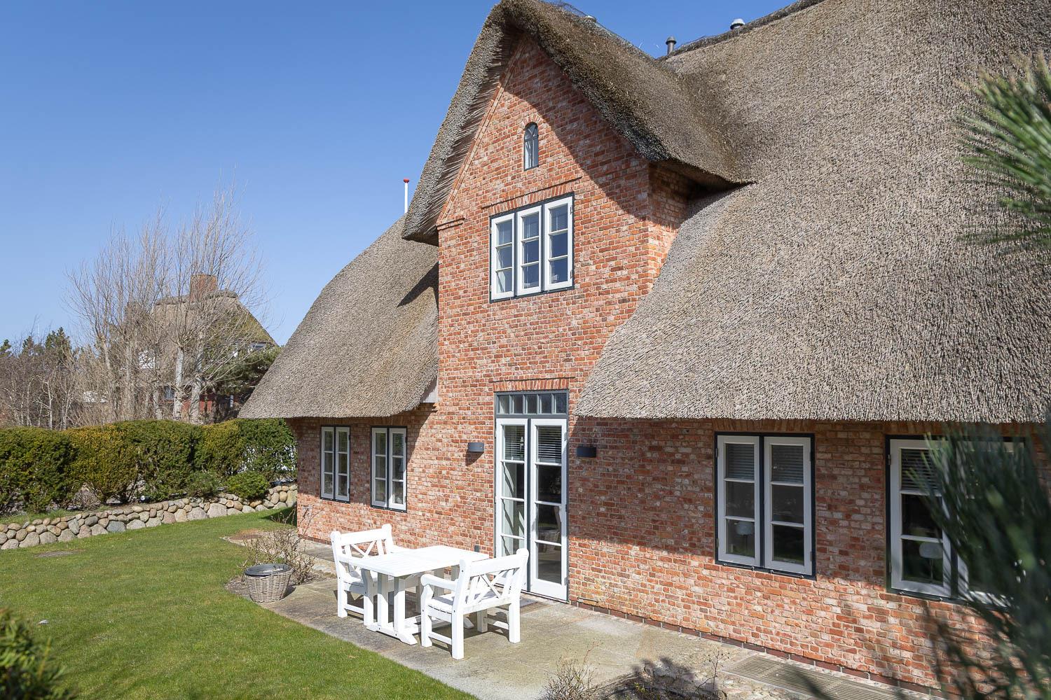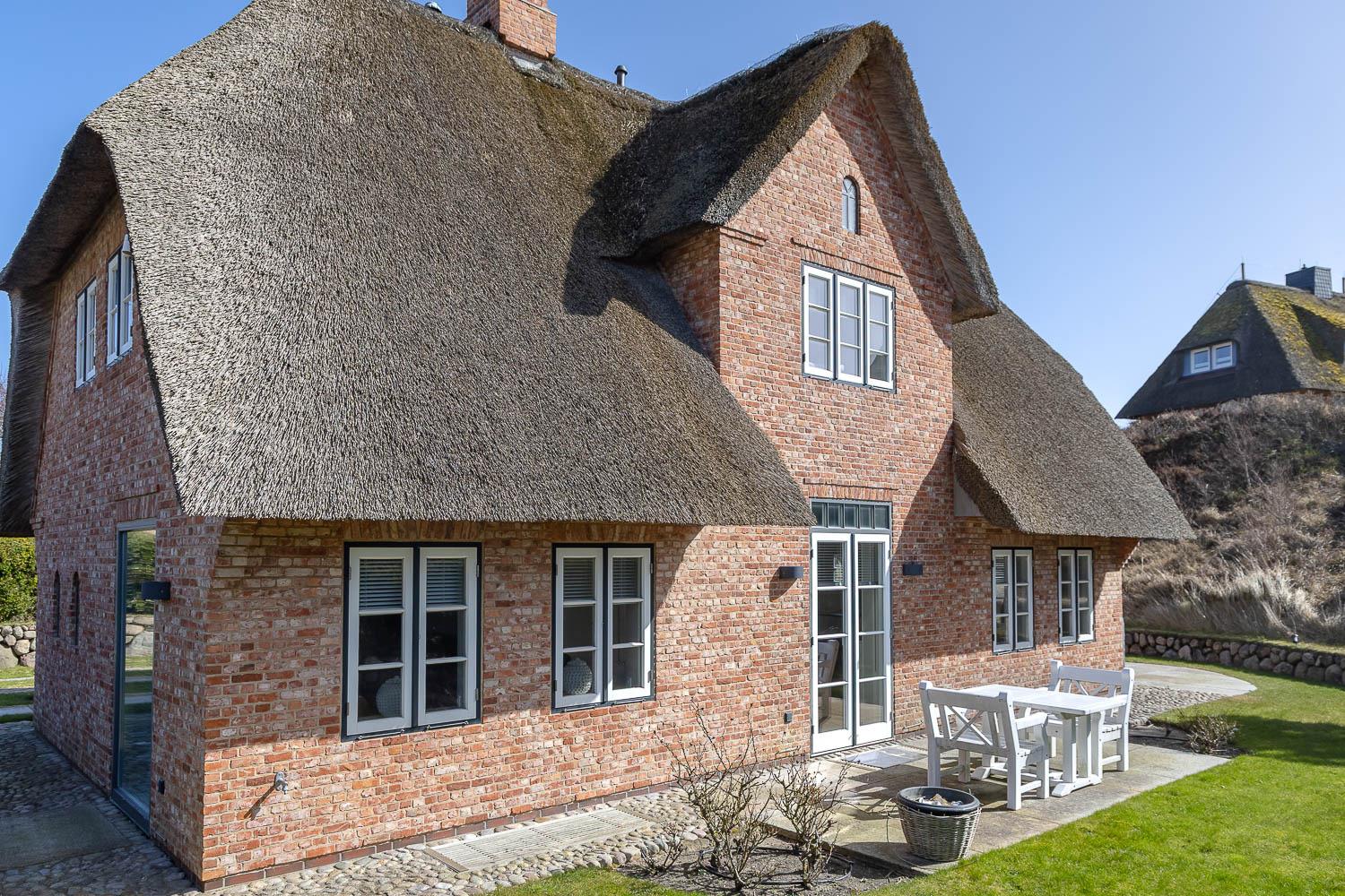 Exklusives Ferienhaus unter Reet in ruhiger Lage eingebettet in die Mellhörner Dünenlandschaft für bis zu 8 Personen. Das Haus besticht durch seine hochwertige Ausstattung und lichtdurchfluteten Räume. Das Erdgeschoss überzeugt mit einem wundervollen Wohn-Essbereich mit einer bestens ausgestatteten Küche sowie ein separates Gäste WC ist ebenfalls vorhanden. Im Obergeschoss befinden sich zwei großzügige Doppelschlafzimmer jeweils mit Fernseher, sowie ein geräumiges Duschbad . Zwei weitere Doppelschlafzimmer finden Sie im Untergeschoss jeweils mit Bad en Suite. Ein Hauswirtschaftsraum mit Waschmaschine und Trockner ist ebenfalls vorhanden. Genießen Sie die Ruhe auf den beiden dazugehörigen Terrassen.[nbsp] Pkw - Stellplatz und Garage steht am Haus den Gästen zur Verfügung.