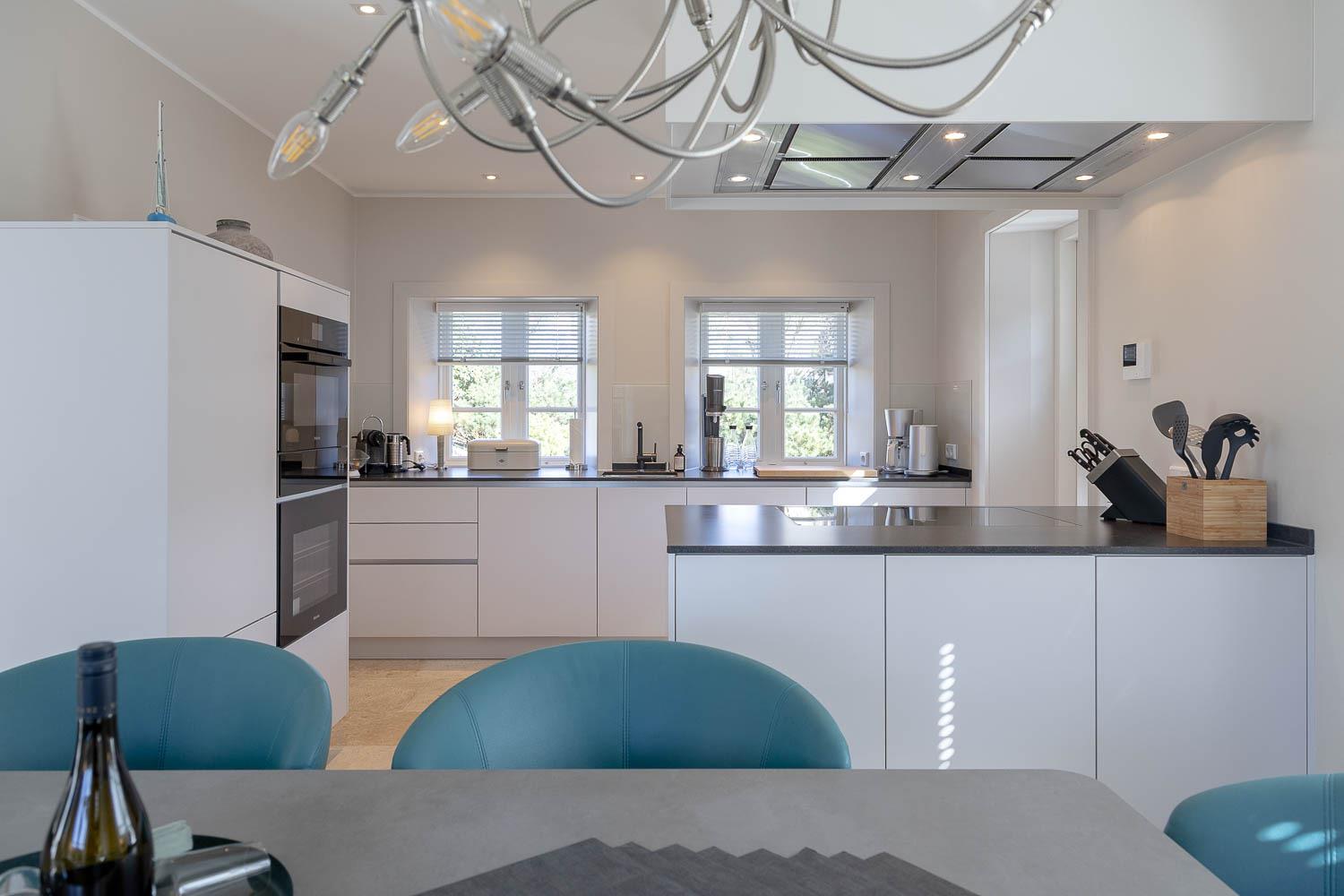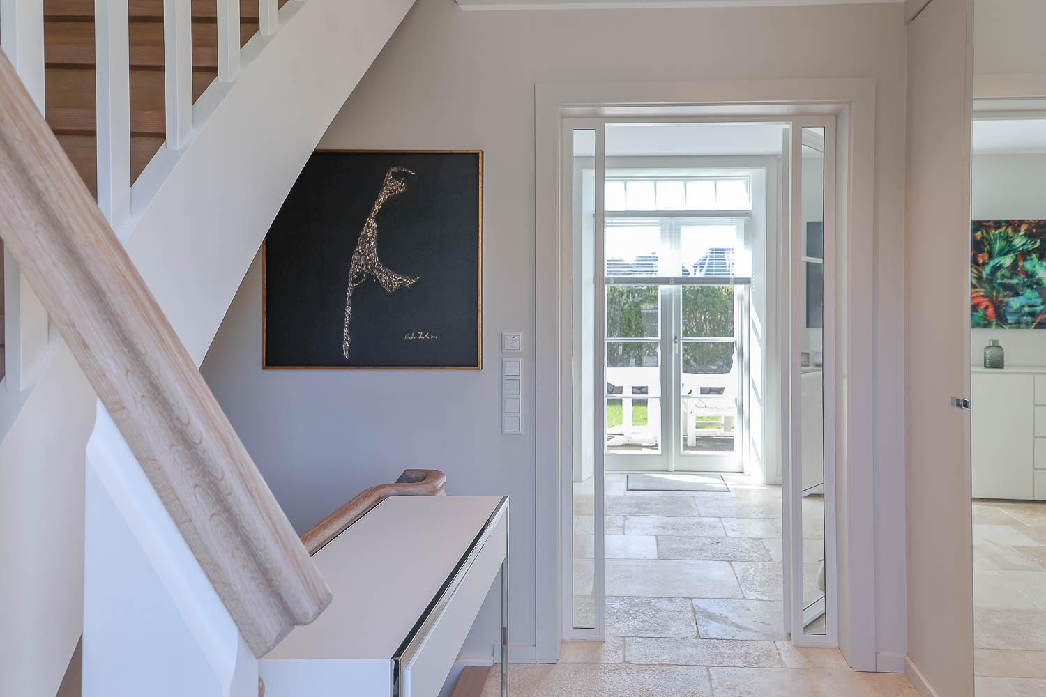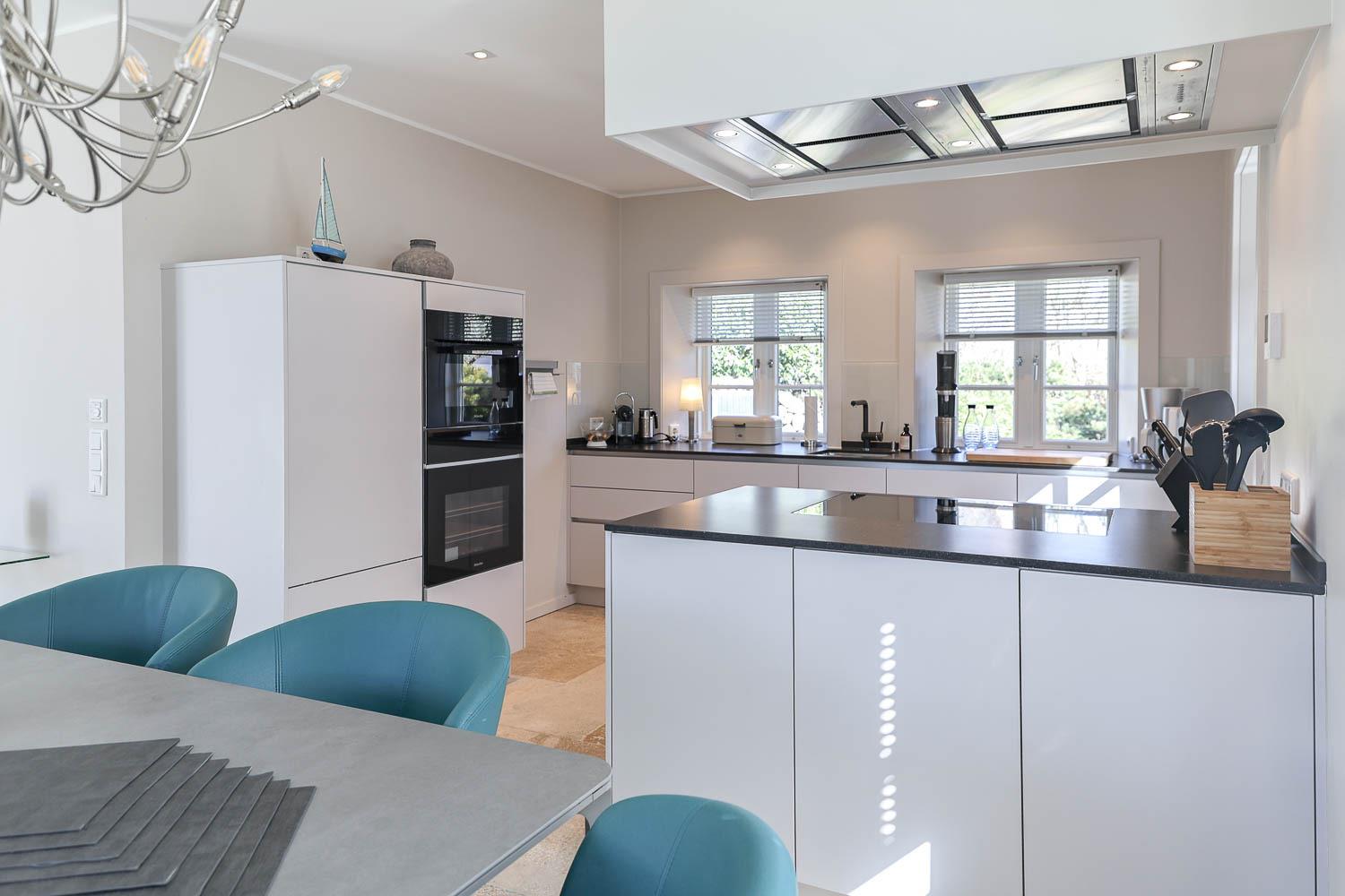 Exklusives Ferienhaus unter Reet in ruhiger Lage eingebettet in die Mellhörner Dünenlandschaft für bis zu 8 Personen. Das Haus besticht durch seine hochwertige Ausstattung und lichtdurchfluteten Räume. Das Erdgeschoss überzeugt mit einem wundervollen Wohn-Essbereich mit einer bestens ausgestatteten Küche sowie ein separates Gäste WC ist ebenfalls vorhanden. Im Obergeschoss befinden sich zwei großzügige Doppelschlafzimmer jeweils mit Fernseher, sowie ein geräumiges Duschbad . Zwei weitere Doppelschlafzimmer finden Sie im Untergeschoss jeweils mit Bad en Suite. Ein Hauswirtschaftsraum mit Waschmaschine und Trockner ist ebenfalls vorhanden. Genießen Sie die Ruhe auf den beiden dazugehörigen Terrassen.[nbsp] Pkw - Stellplatz und Garage steht am Haus den Gästen zur Verfügung.