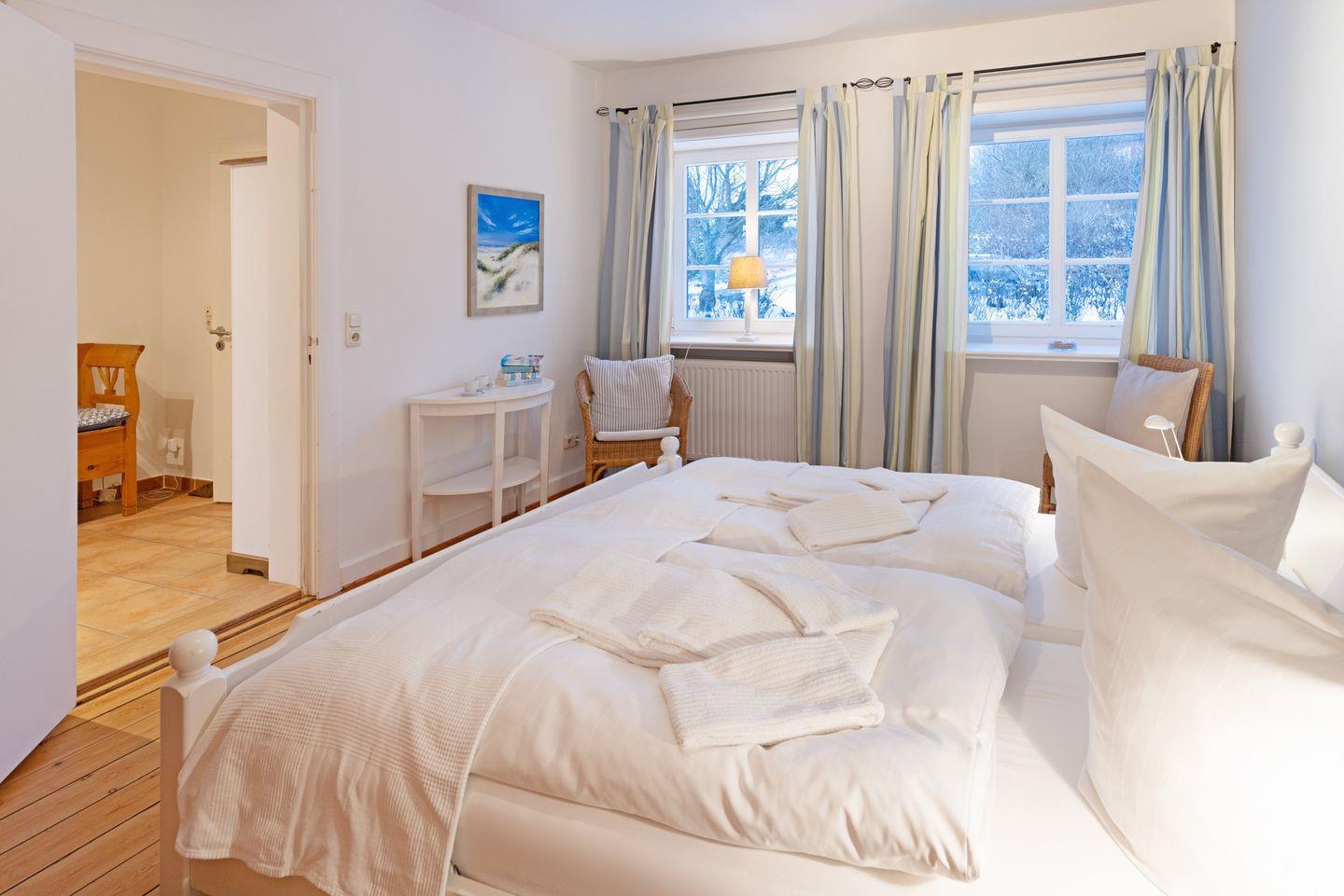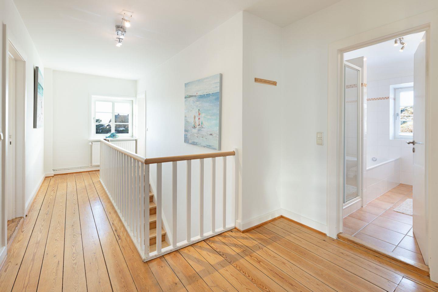 Die weiteren Schlafzimmer (zwei mit Doppelbetten, zwei mit jeweils zwei Einzelbetten) und das zweite Badezimmer mit Duschwanne befinden sich 1. Stock.