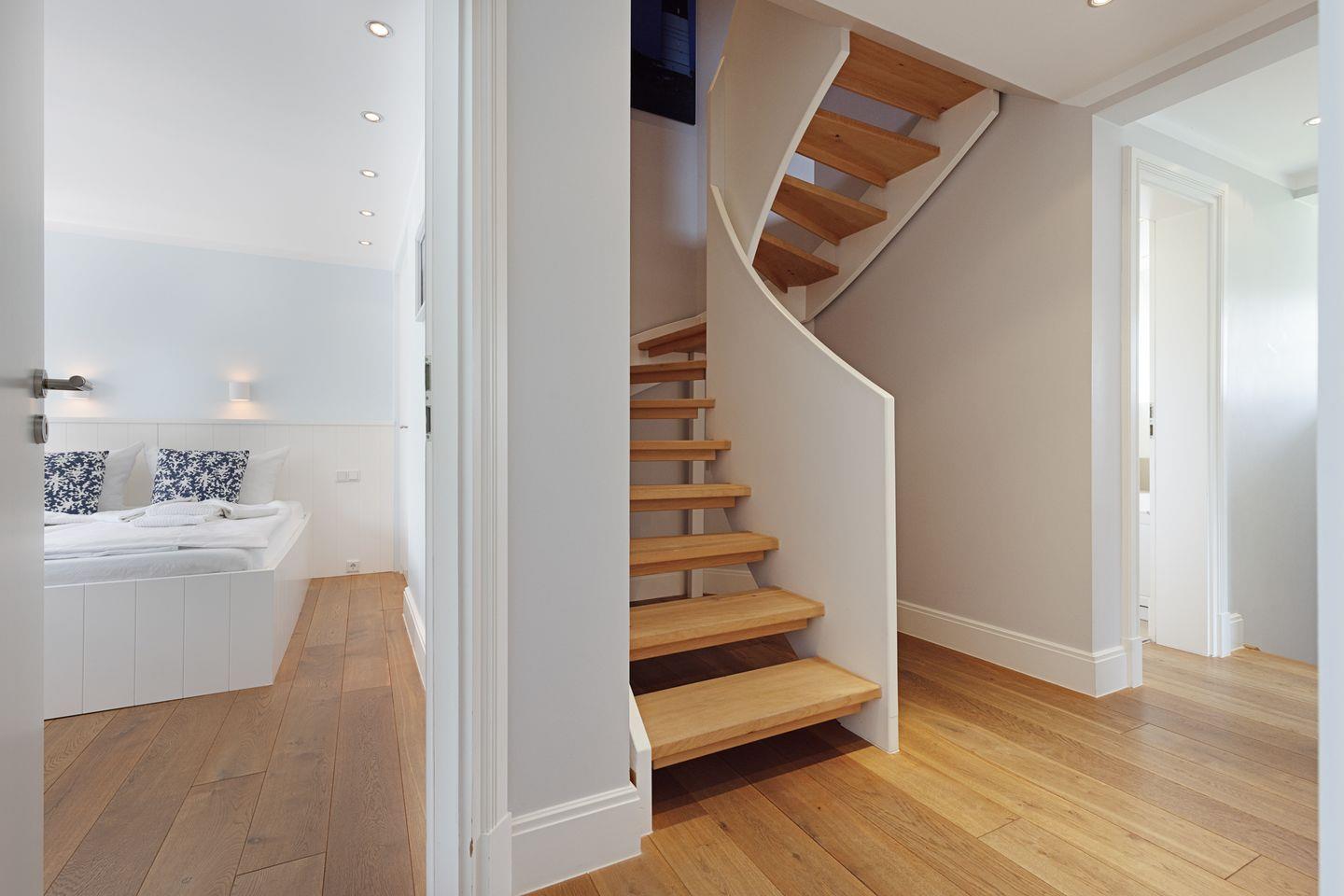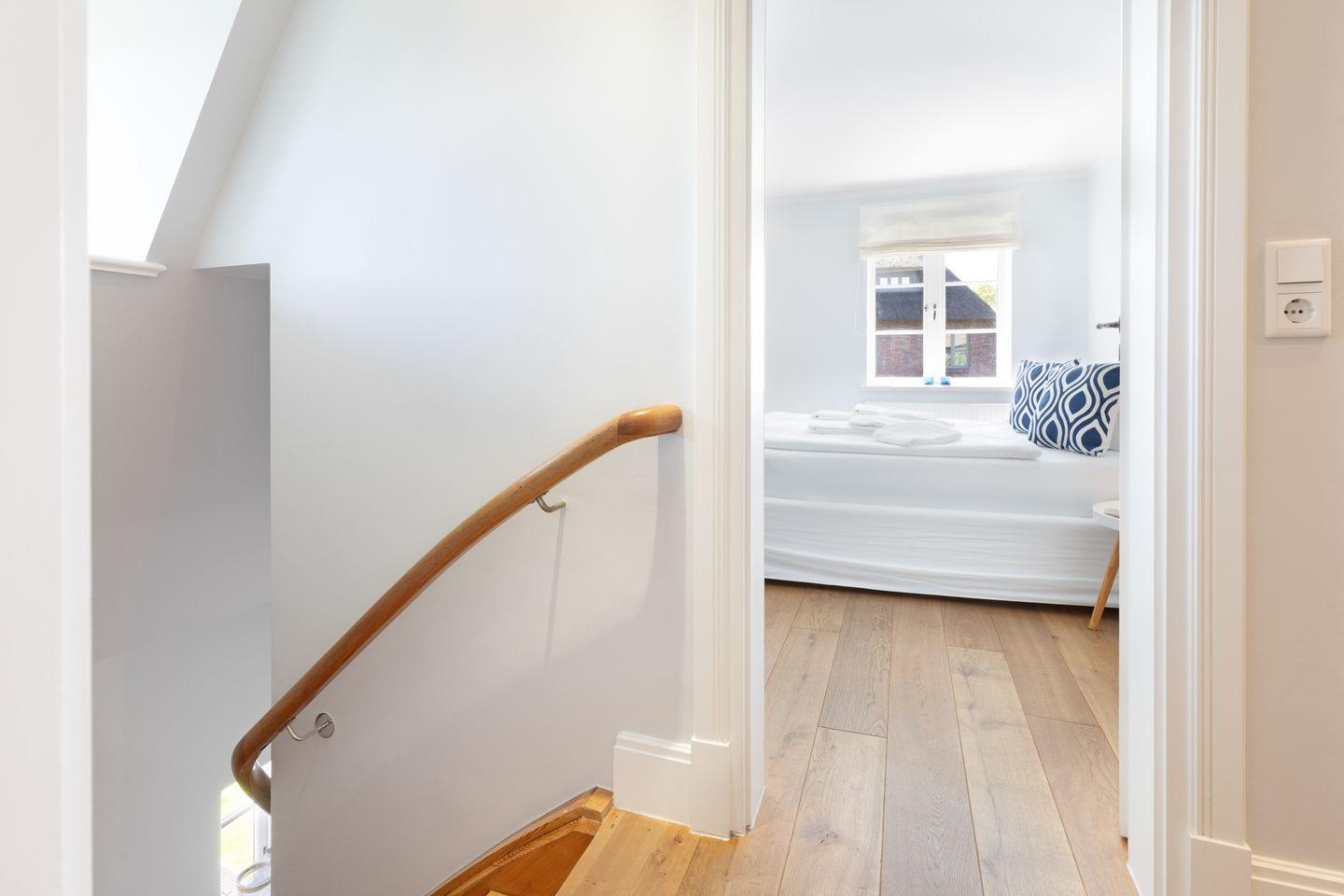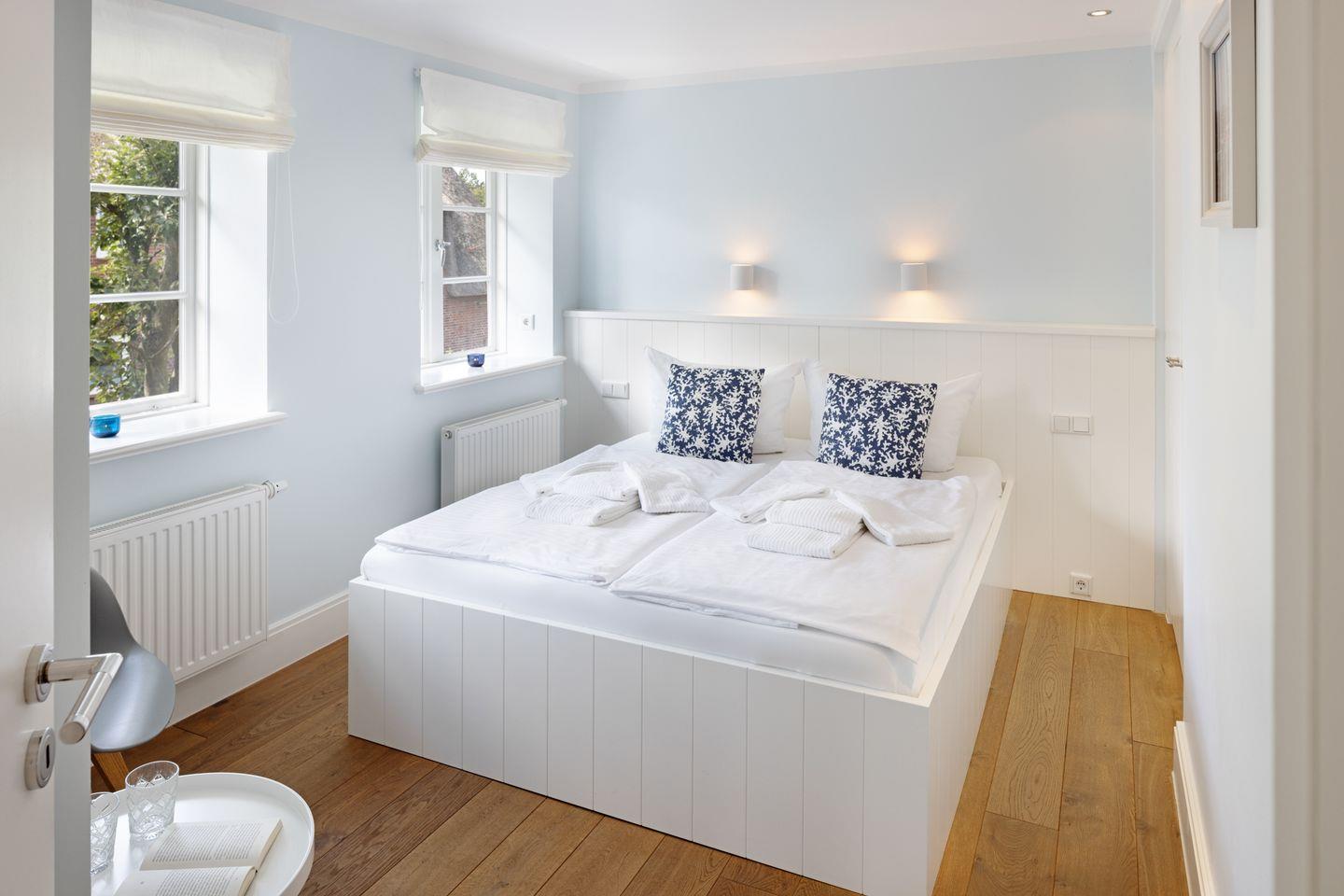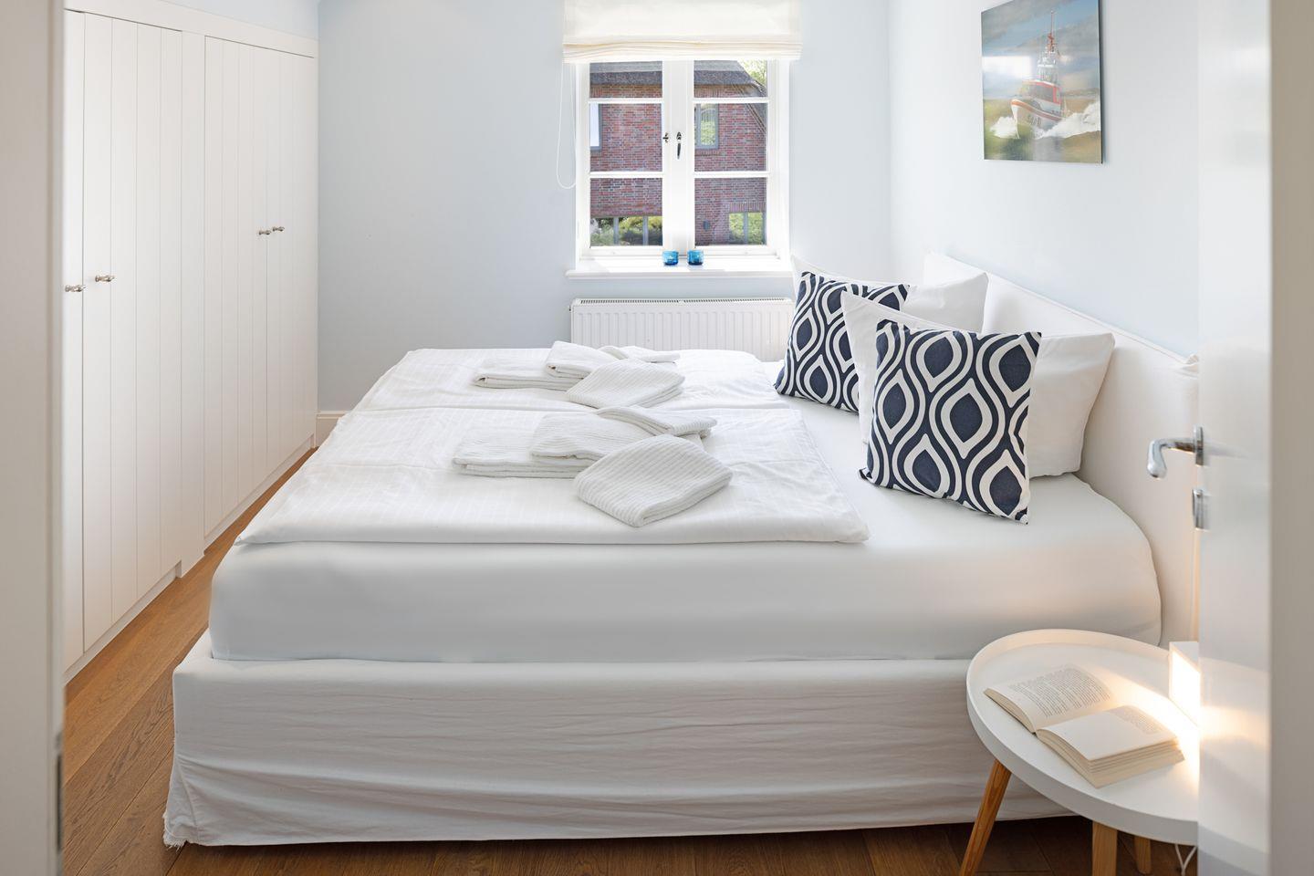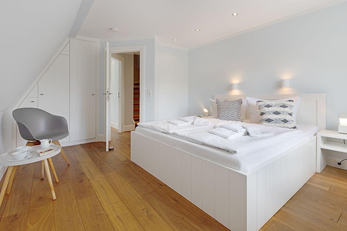 Nordisch moderne Behaglichkeit erwartet sie auch in den geräumigen Schlafzimmern und Bädern im Obergeschoss mit Blick auf die reetgedeckte Nachbarschaft. Zwei Schlafzimmer verfügen über Smart TVs. Der Saunabereich im Untergeschoß lädt sie zum Erholen ein.