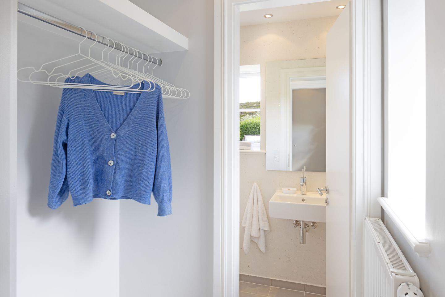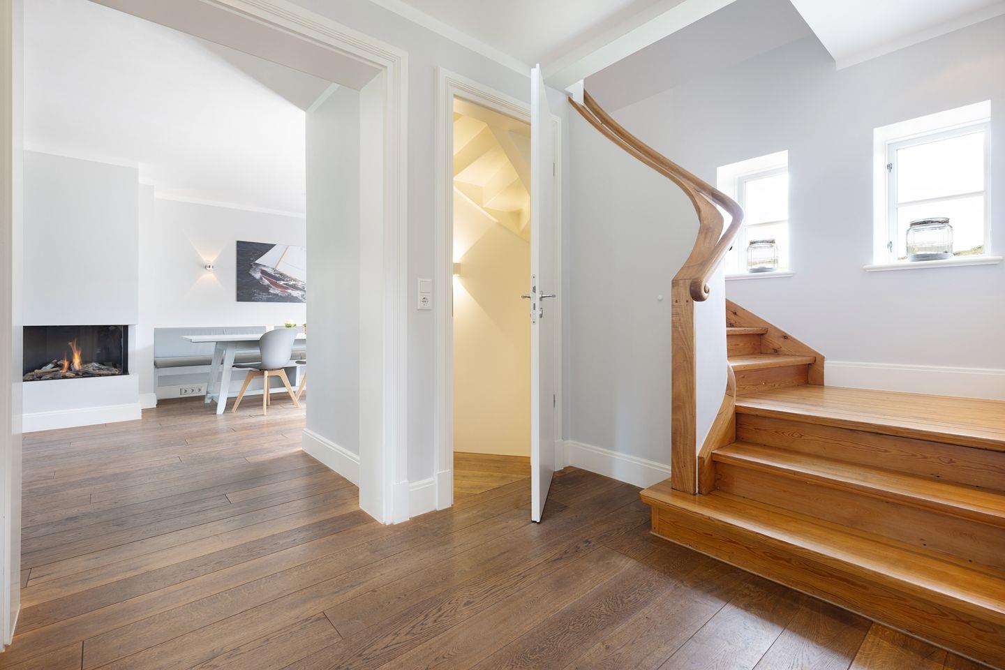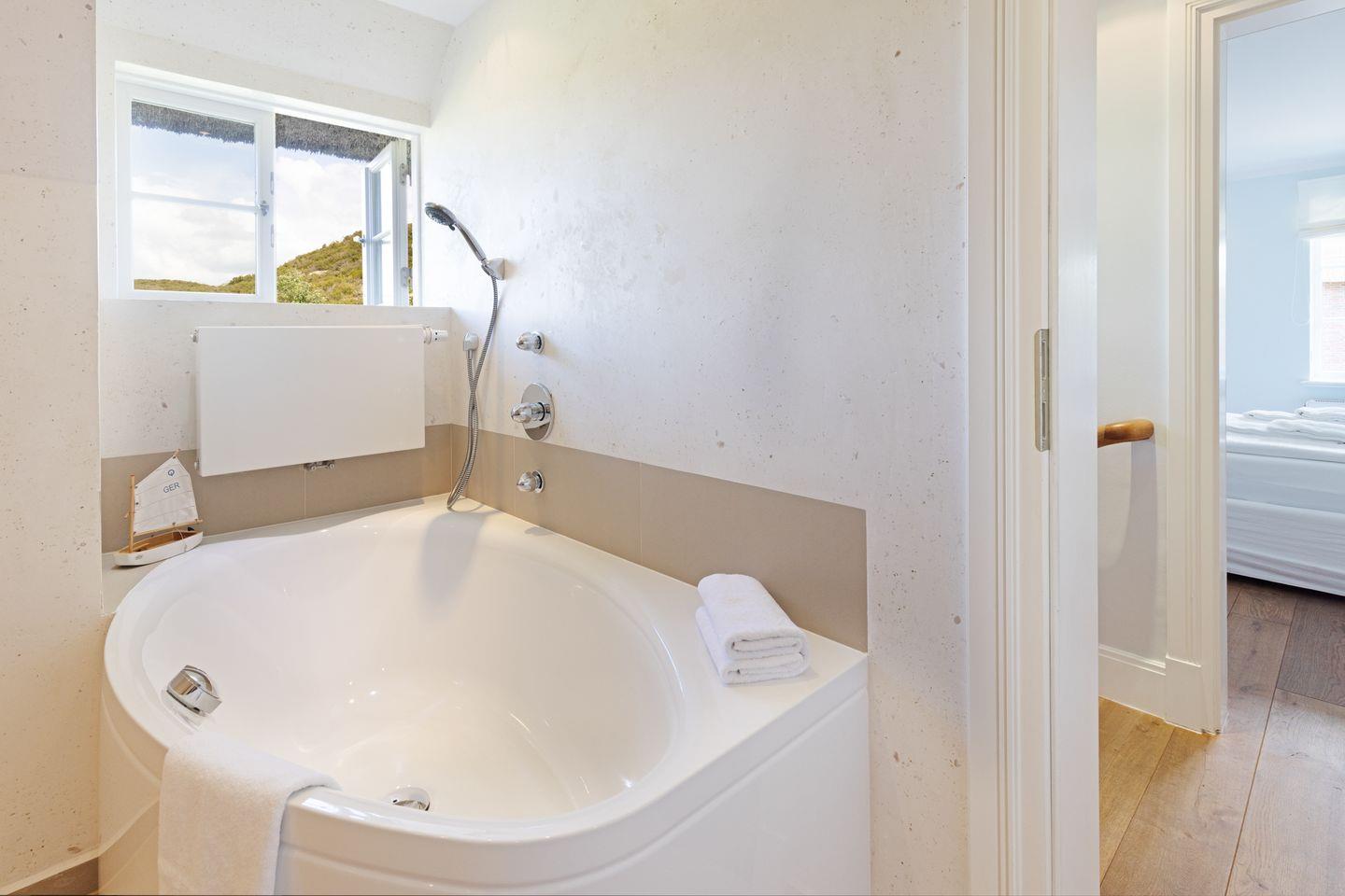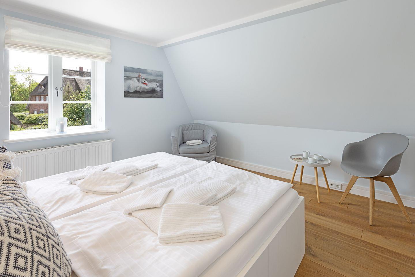 Nordisch moderne Behaglichkeit erwartet sie auch in den geräumigen Schlafzimmern und Bädern im Obergeschoss mit Blick auf die reetgedeckte Nachbarschaft. Zwei Schlafzimmer verfügen über Smart TVs. Der Saunabereich im Untergeschoß lädt sie zum Erholen ein.