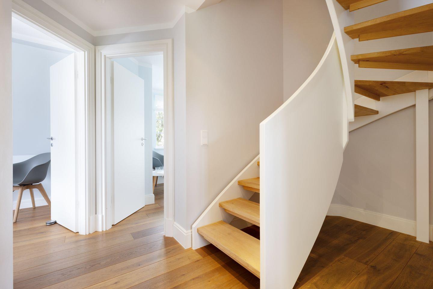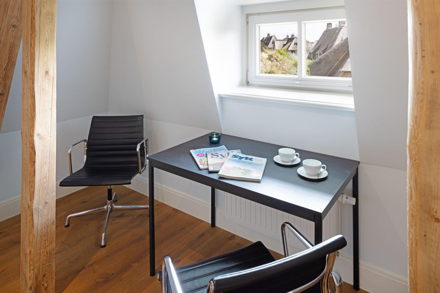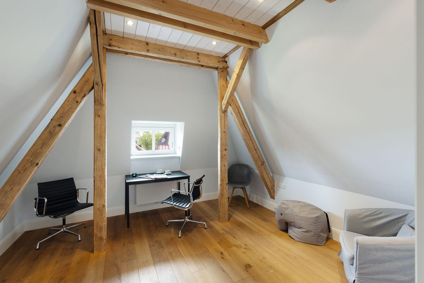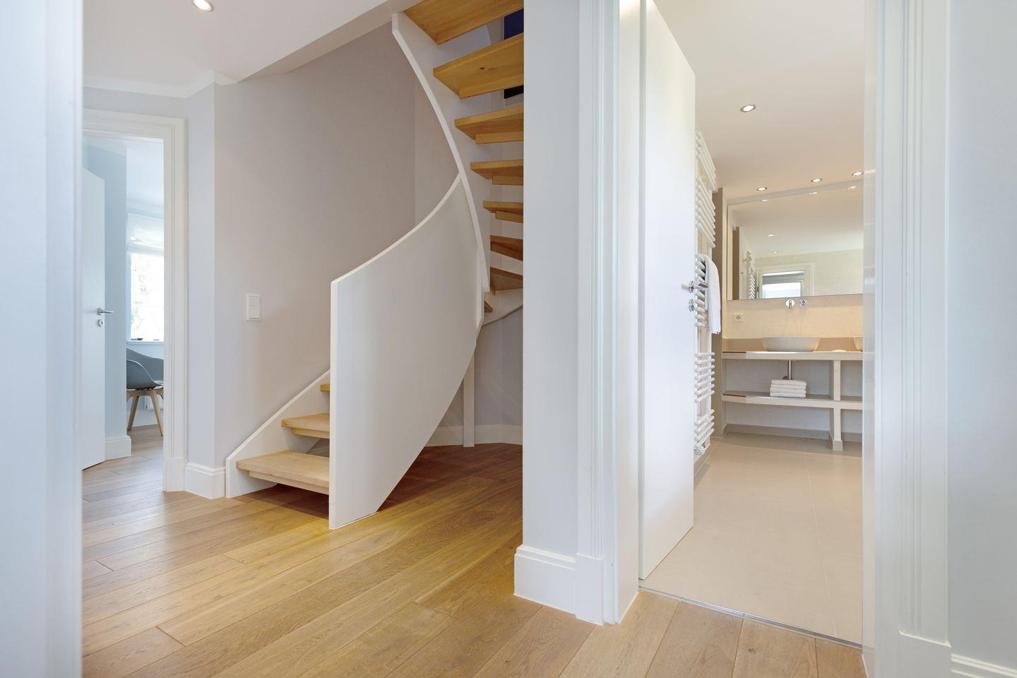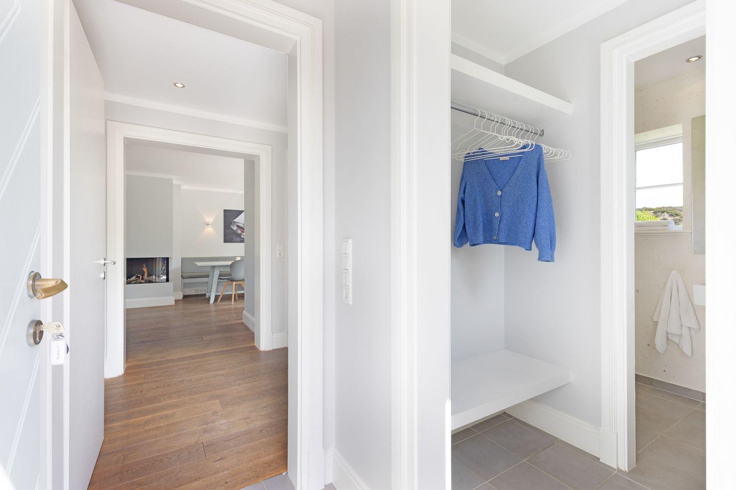 Nordisch moderne Behaglichkeit erwartet sie auch in den geräumigen Schlafzimmern und Bädern im Obergeschoss mit Blick auf die reetgedeckte Nachbarschaft. Zwei Schlafzimmer verfügen über Smart TVs. Der Saunabereich im Untergeschoß lädt sie zum Erholen ein.