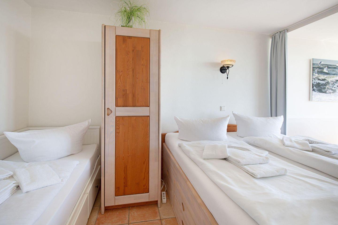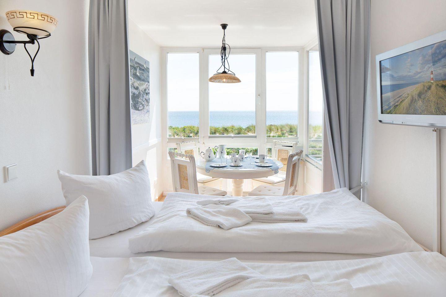 Der Schlafraum ist durch Türen vom Wohnzimmer und durch einen lichtundurchlässigen Vorhang vom Essbereich getrennt. Der Essbereich liegt in einem Erker mit direktem 180° Blick über die Nordsee.