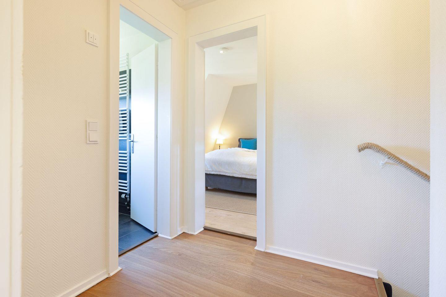 In der oberen Etage befinden sich zwei Schlafzimmer mit Doppelbetten und ein Zimmer mit einem Einzelbett sowie ein Wannenbad.