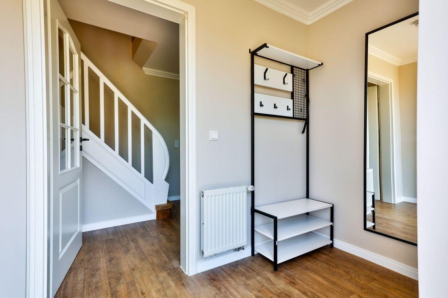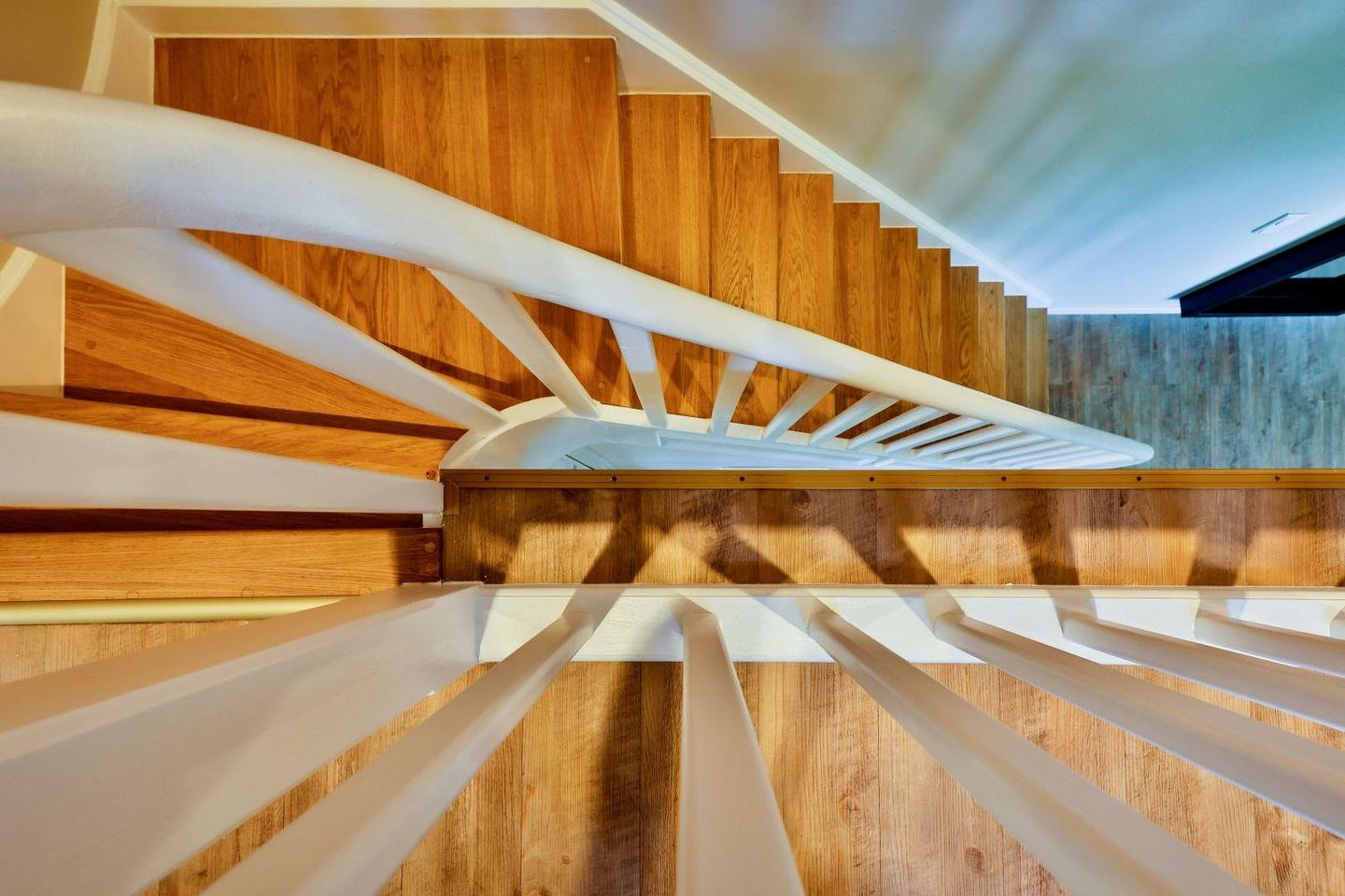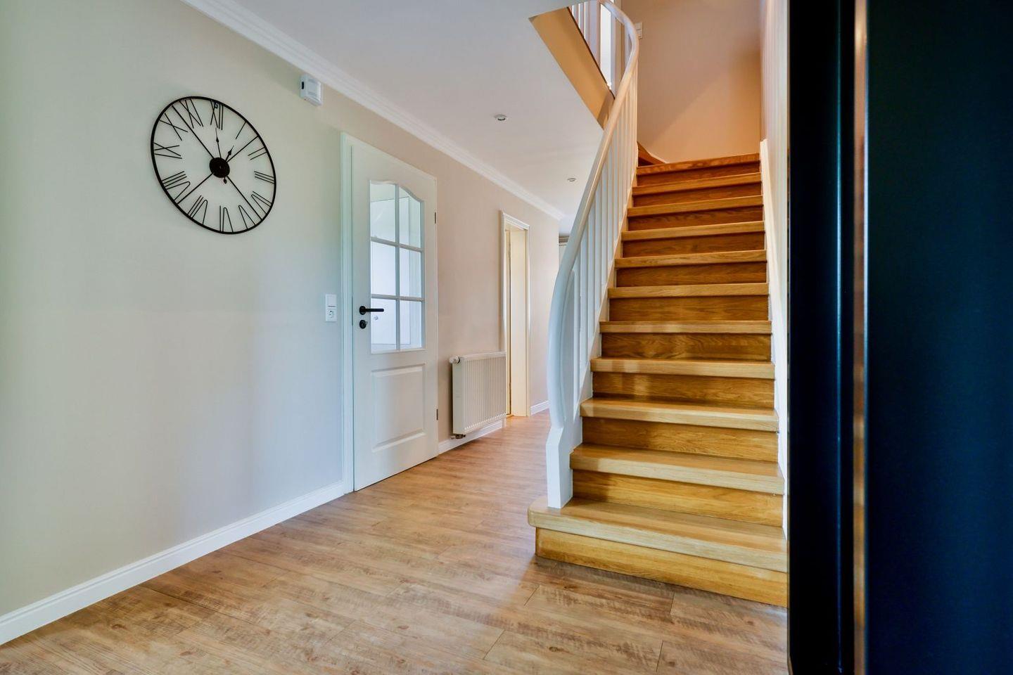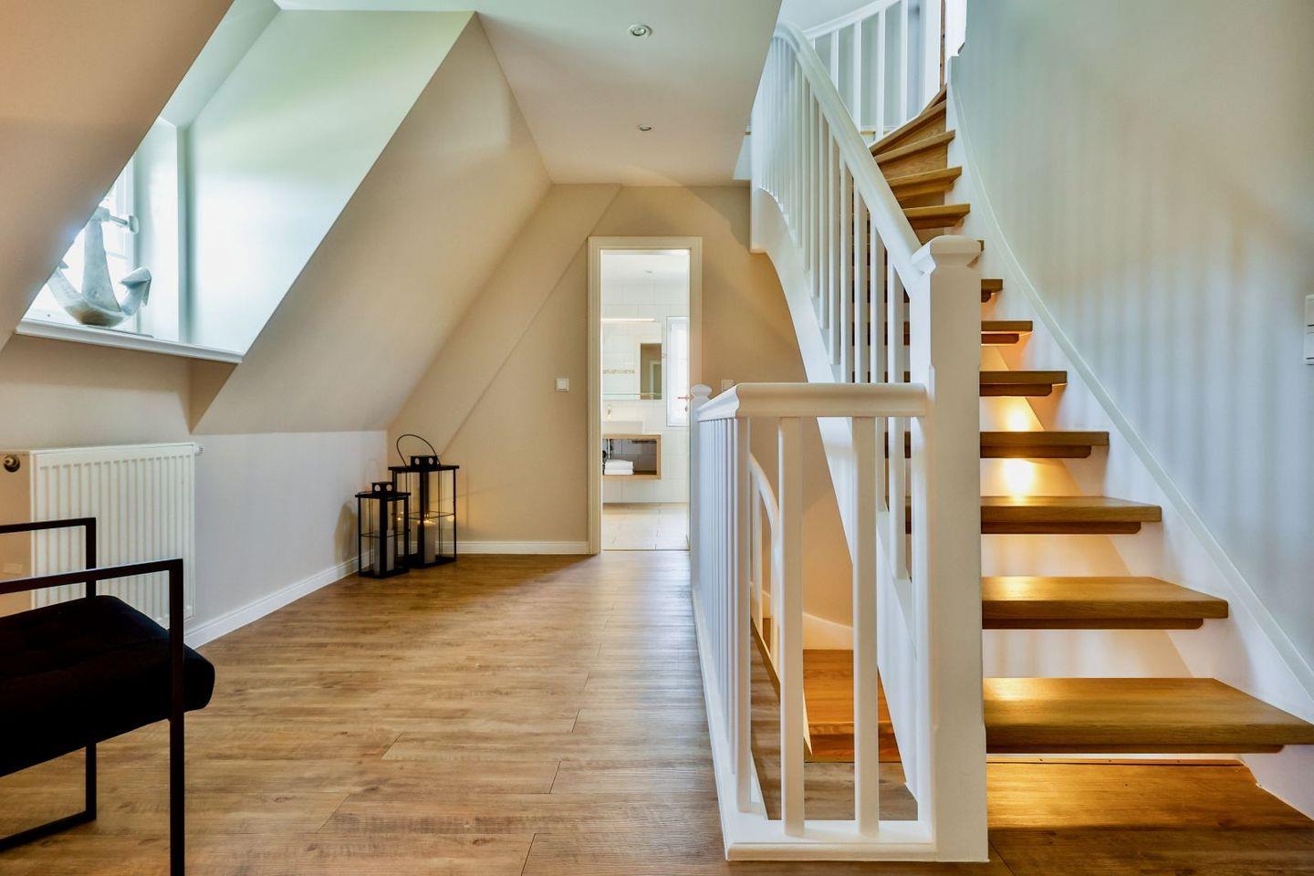 (geschlossene Treppe) befinden sich zwei große Schlafzimmer mit Boxspring-Betten, ein eigener Bereich für die Möglichkeit zum Home-Office sowie ein großes Bad mit Dusche und Badewanne. Im 2.Stock (offene, stark ansteigende Treppe) befindet sich das dritte Schlafzimmer mit zwei Einzelbetten und einem separaten Duschbad. Der großzügige Garten hält Sonnenliegen und eine Sauna bereit.