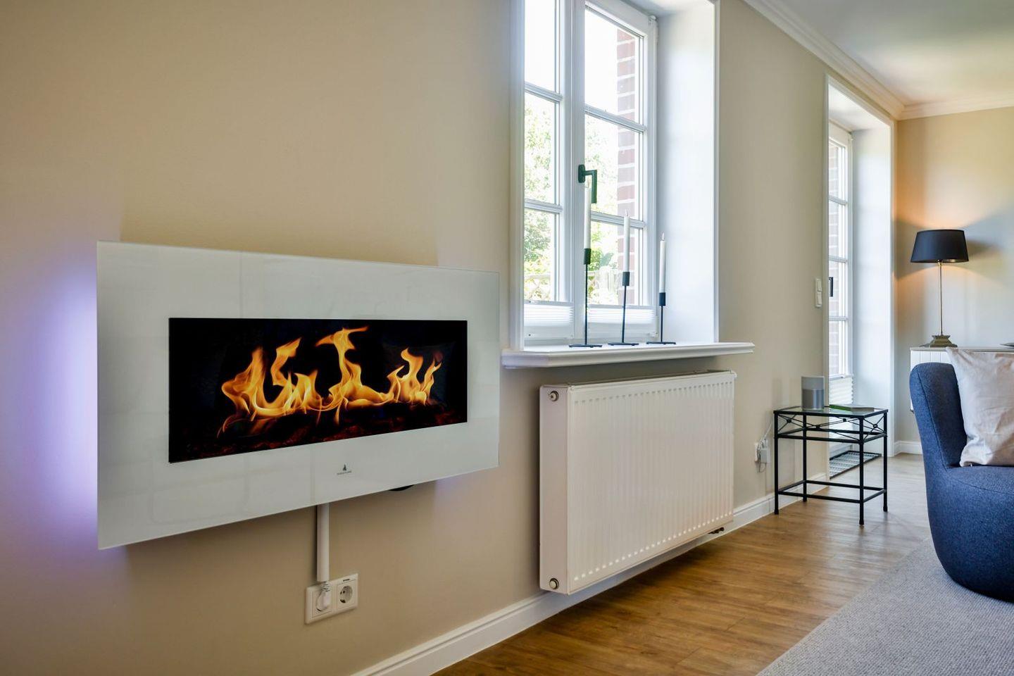Im Erdgeschoss befindet sich die Küche, eine Dusche mit Toilette und der Wohn-Essbereich mit Elektrokamin auf.