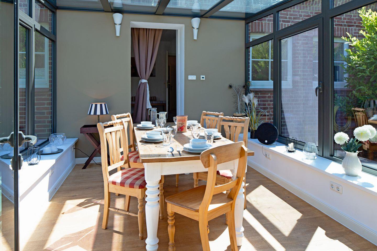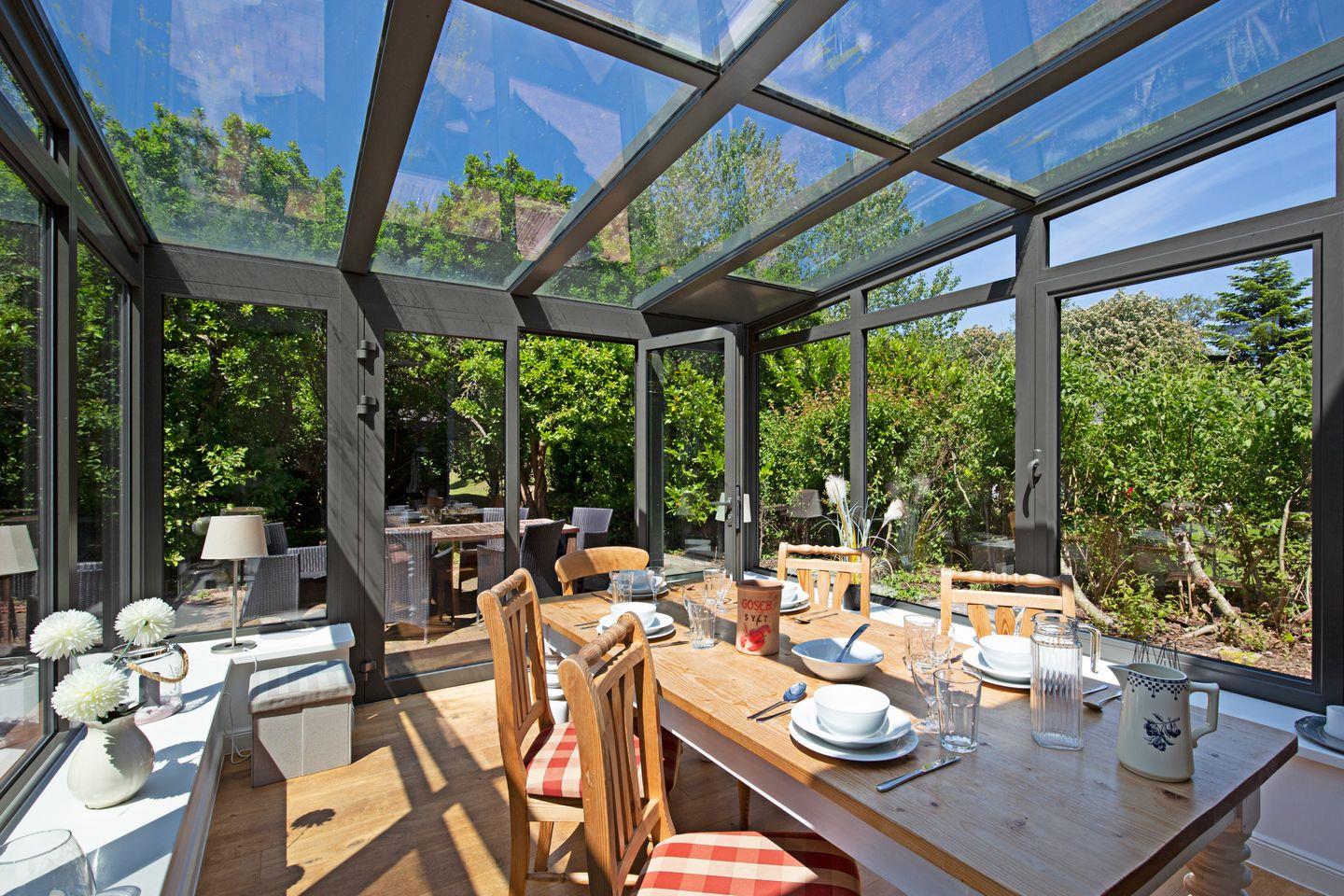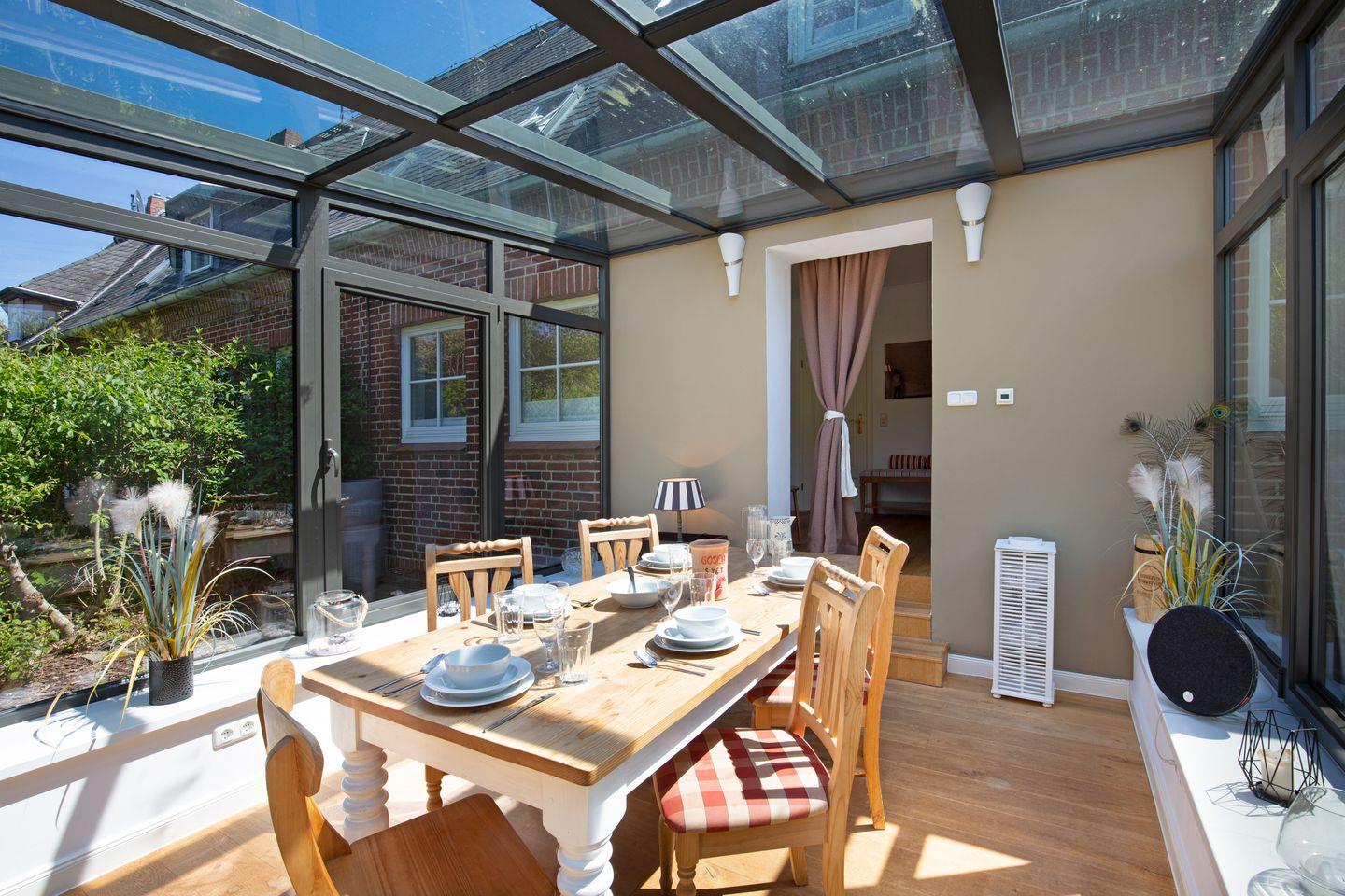 Von der offenen Küche aus erreichen Sie den lichtdurchfluteten Wintergarten.