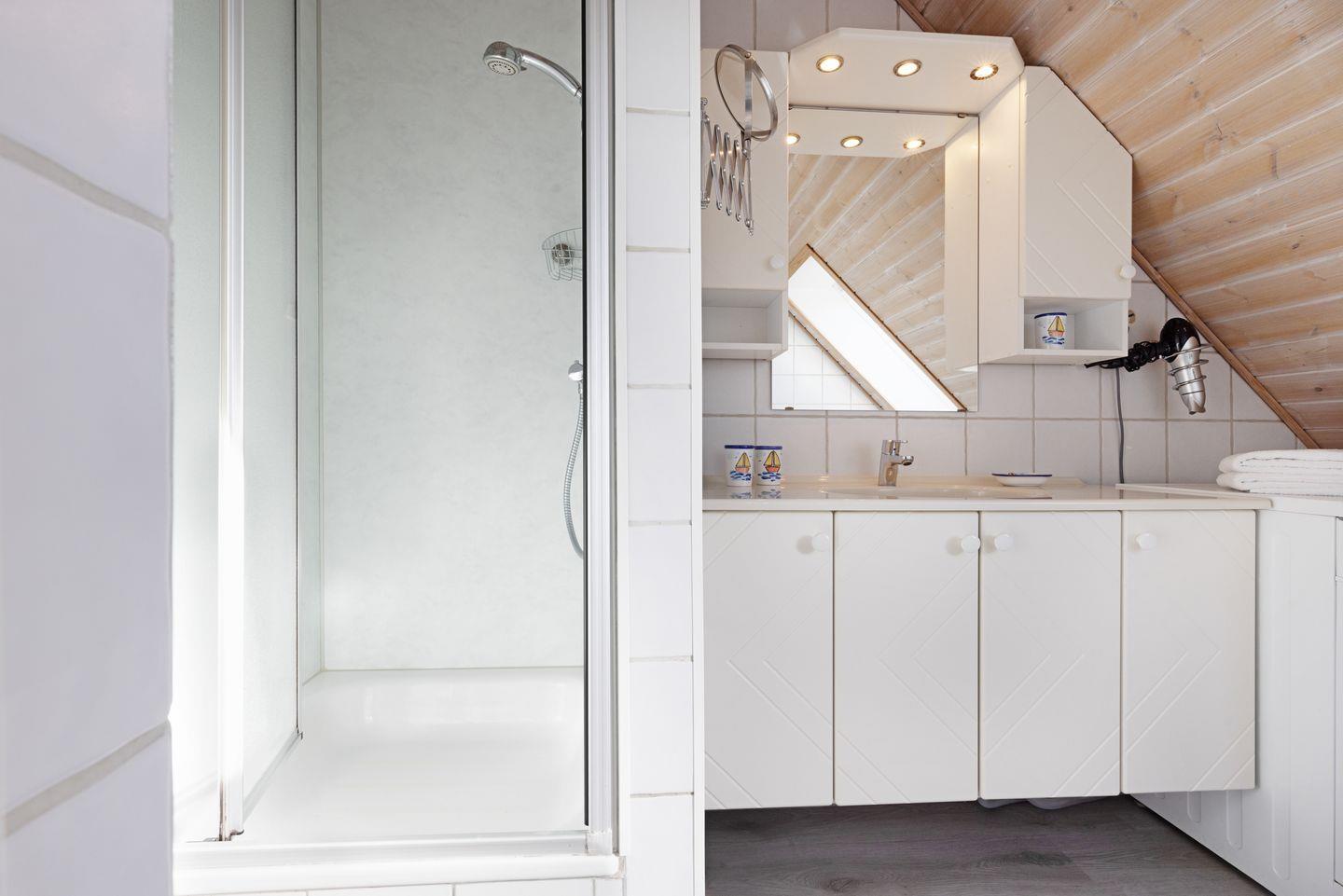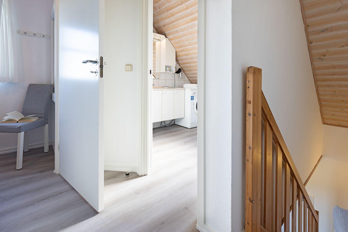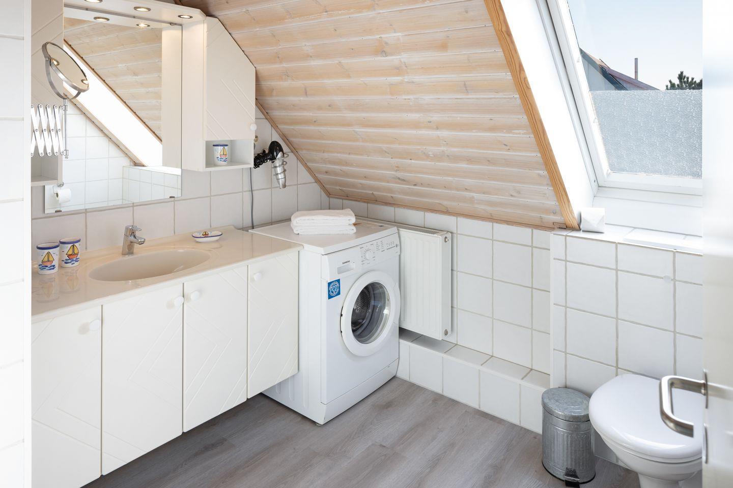 Im 1. Stock befindet sich das Schlafzimmer und das Duschbad mit Waschmaschine. Sie haben einen wunderschönen Blick von Ihrer Terrasse auf die unbebaute Ferne.