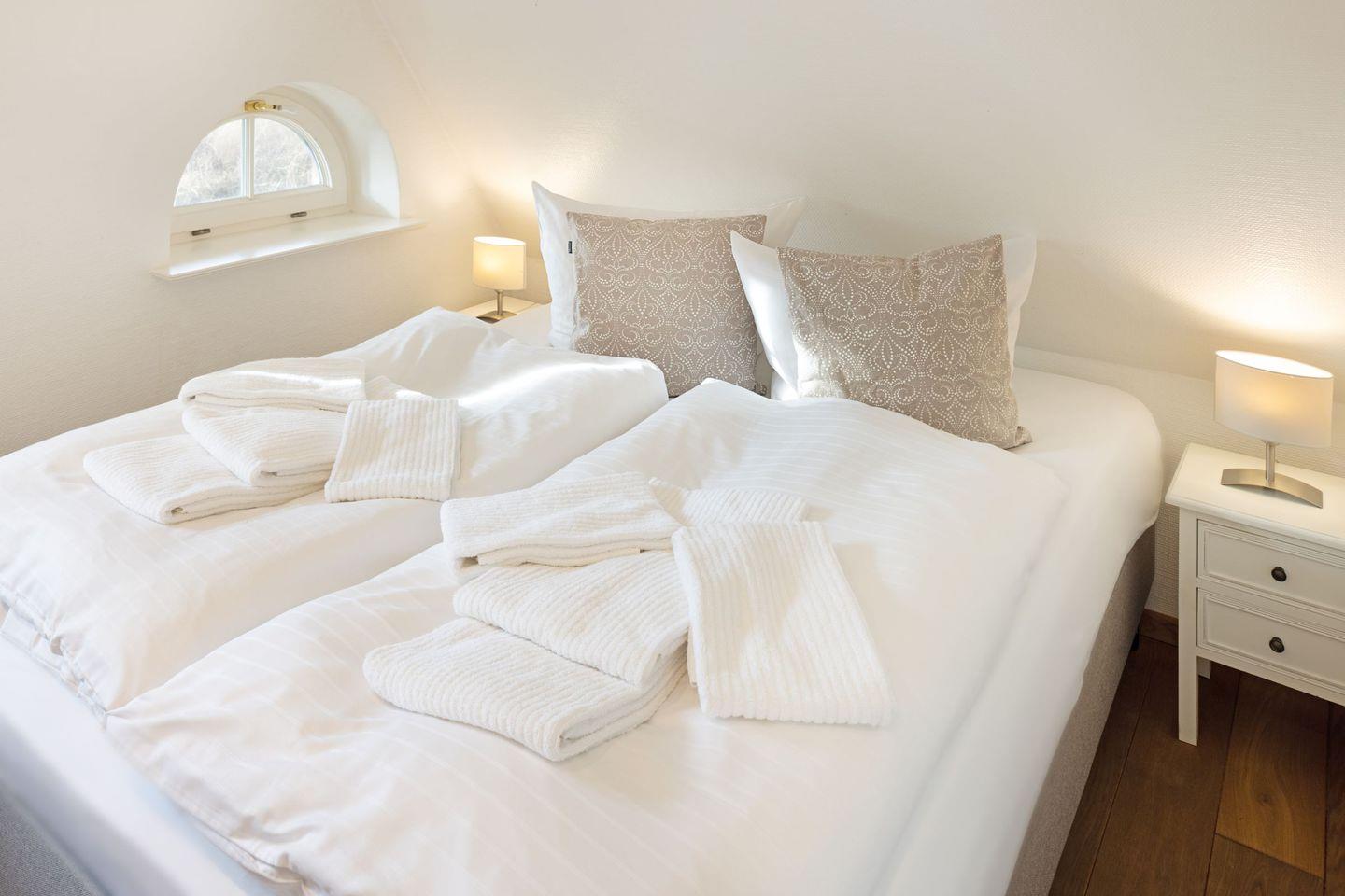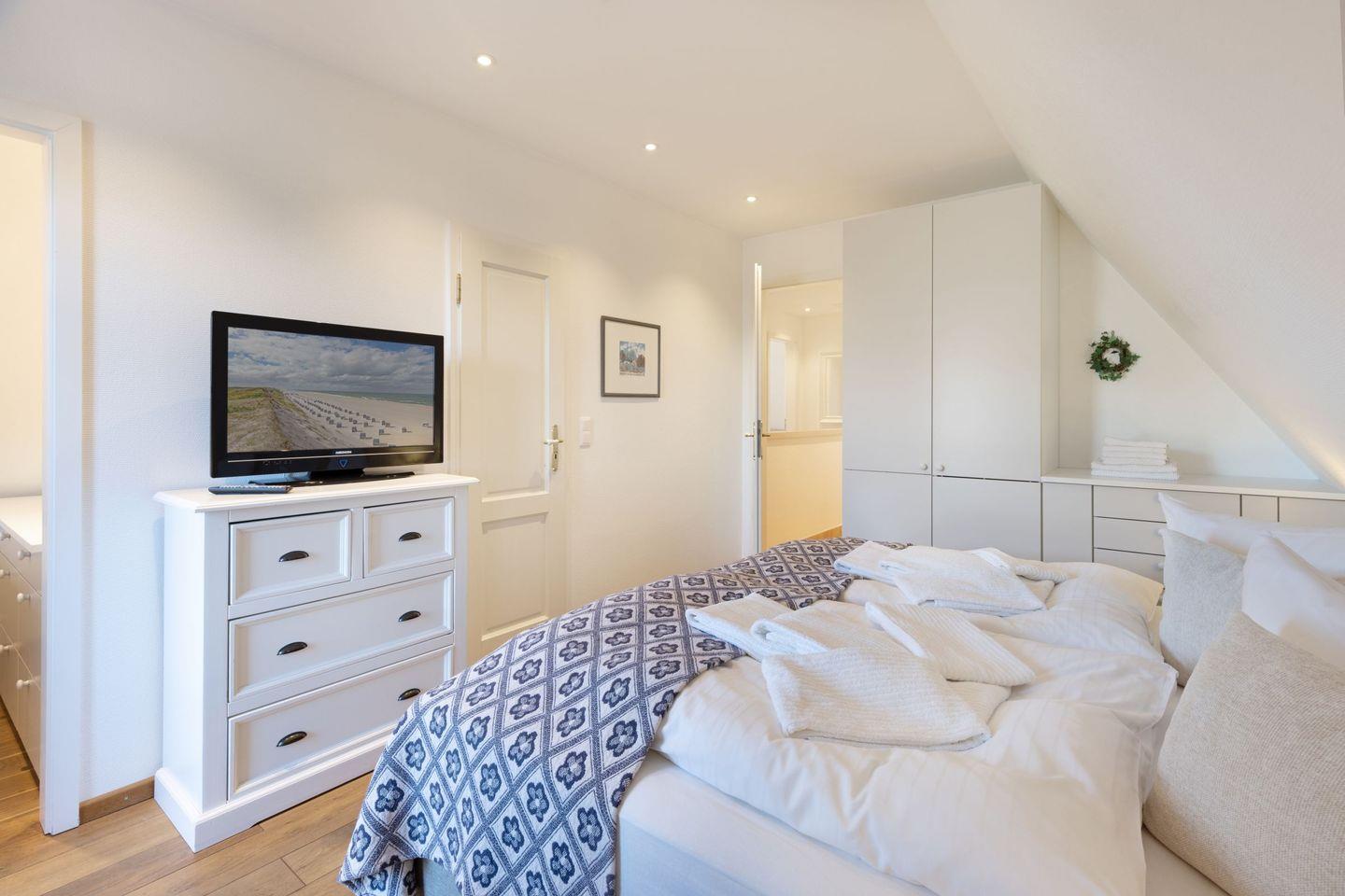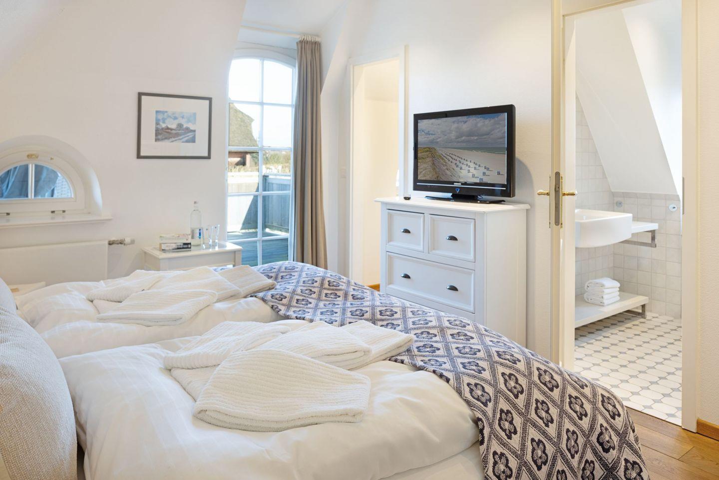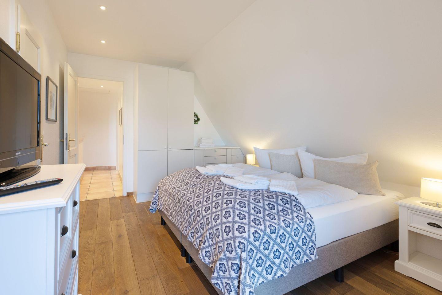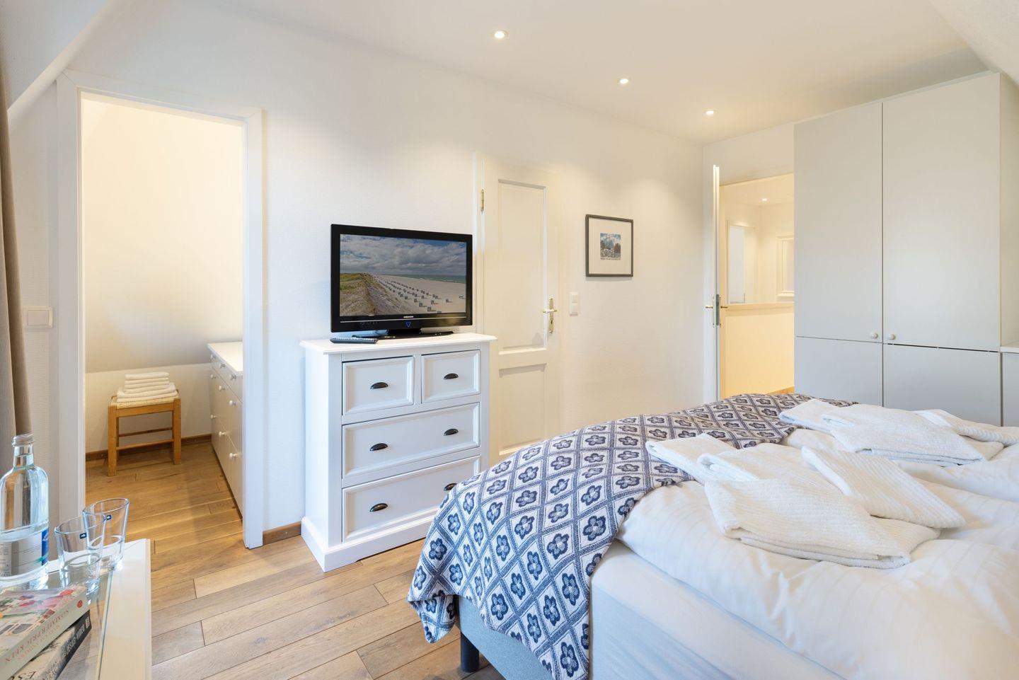 Im Obergeschoss befinden sich Ihre Schlafzimmer. Alle Schlafzimmer sind mit Bad en Suite. Das große Schlafzimmer im ersten Stock hat eine zusätzliche Sonnenterrasse mit Strandkorb.