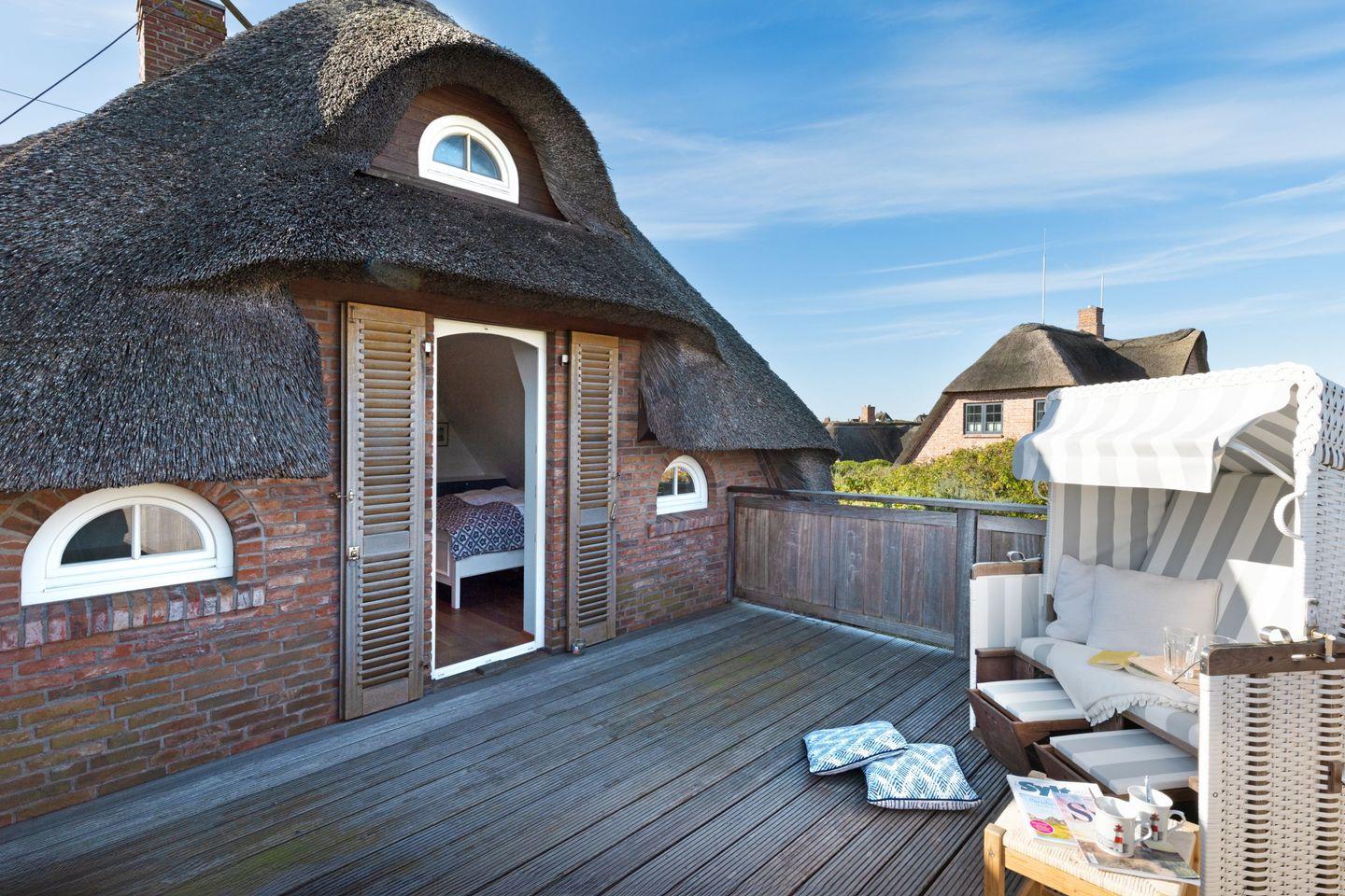 Exklusives reetgedecktes Ferienhaus nahe dem Strand mit Meerblick, Terrasse und Doppelgarage für bis zu sechs Personen.