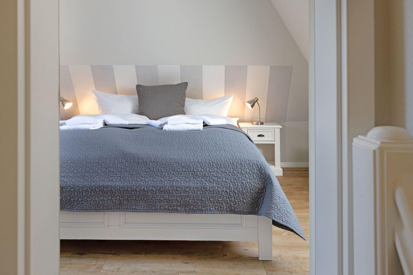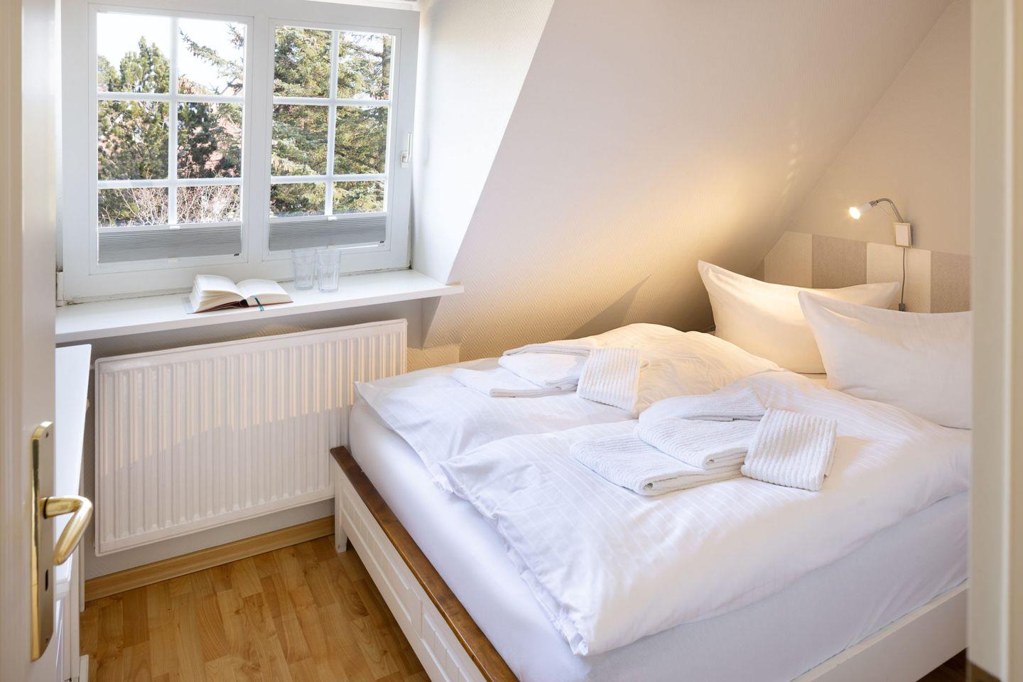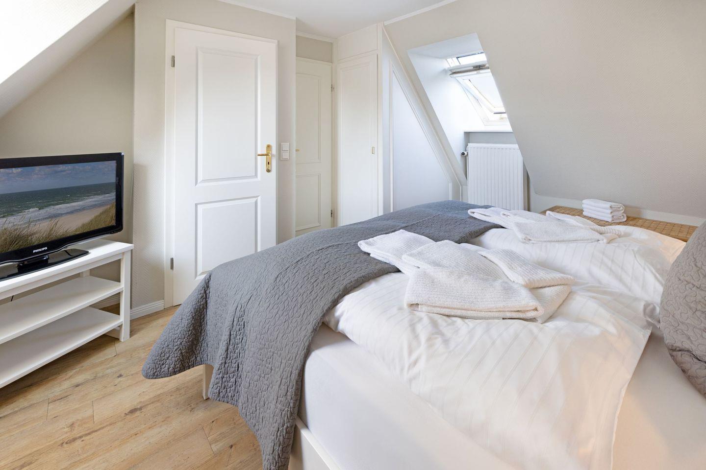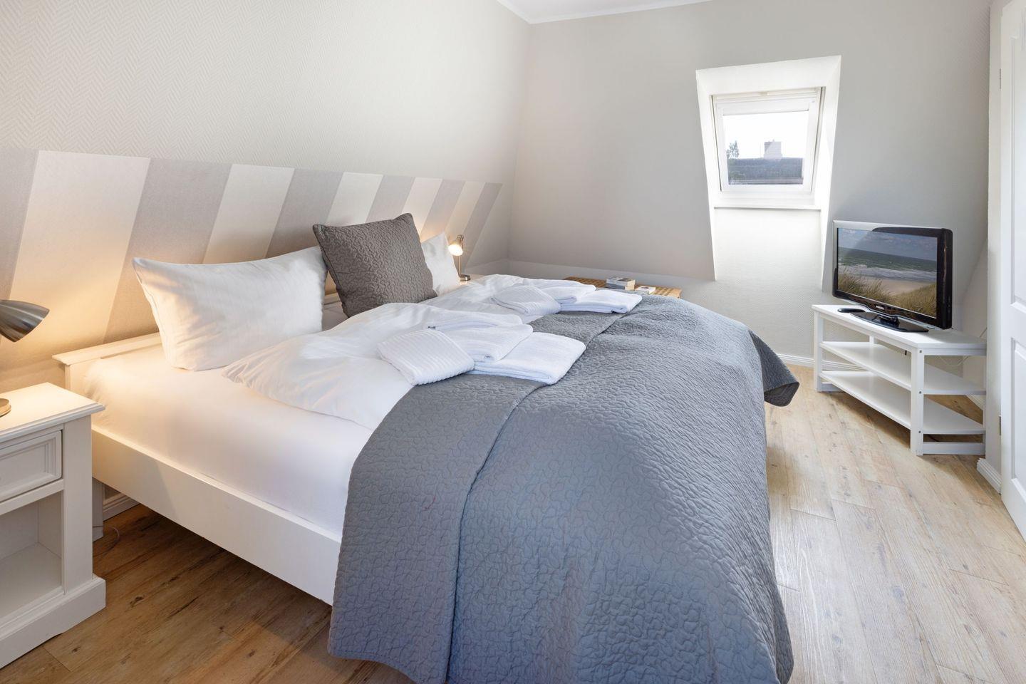 Das Appartement "Strand" (65 m²) für vier Personen liegt im Obergeschoss und bietet zwei Schlafräume im Dachgeschoss, jeweils mit Doppelbett.