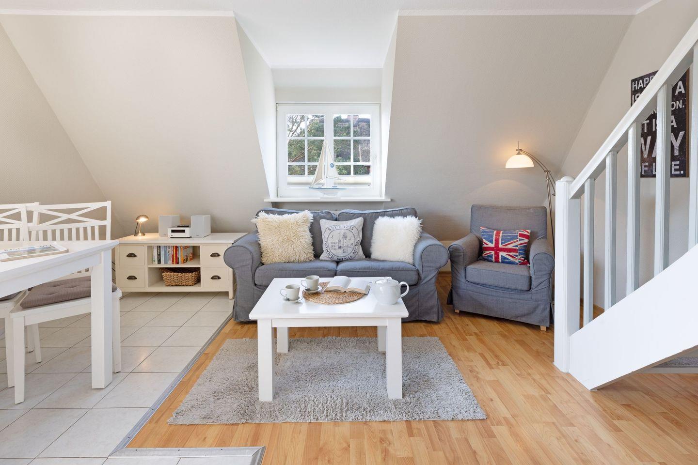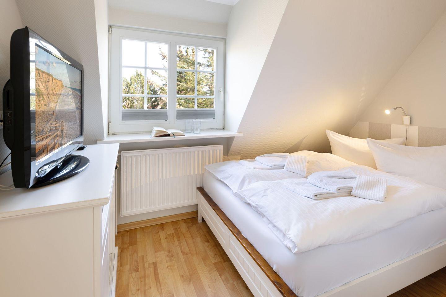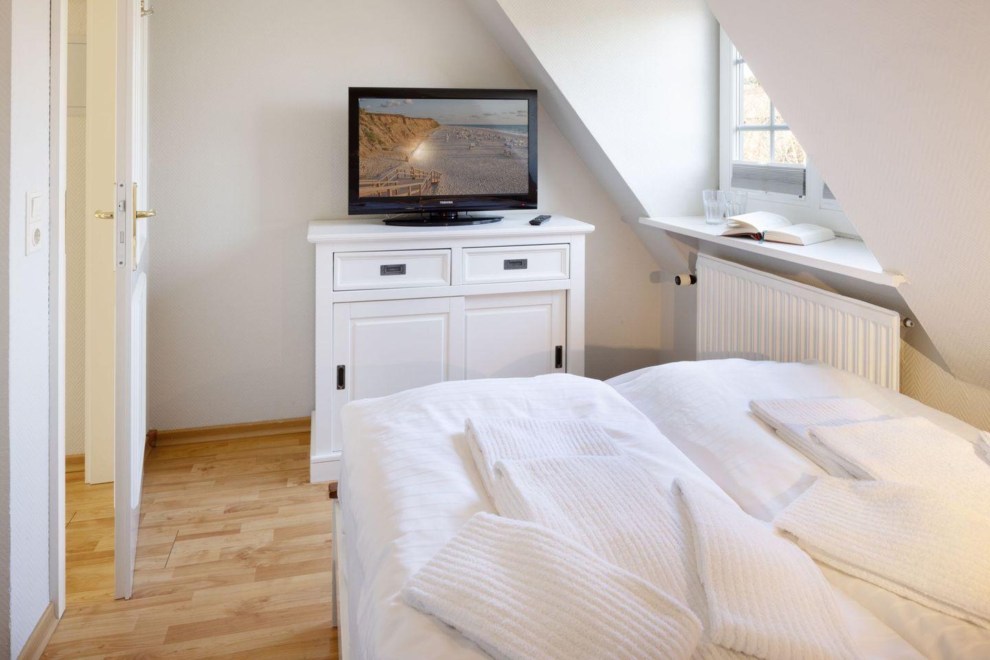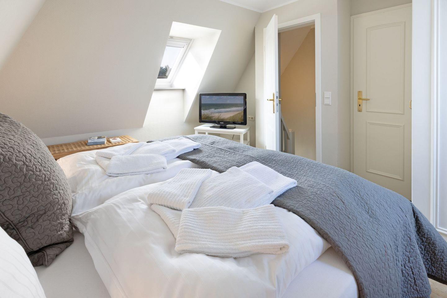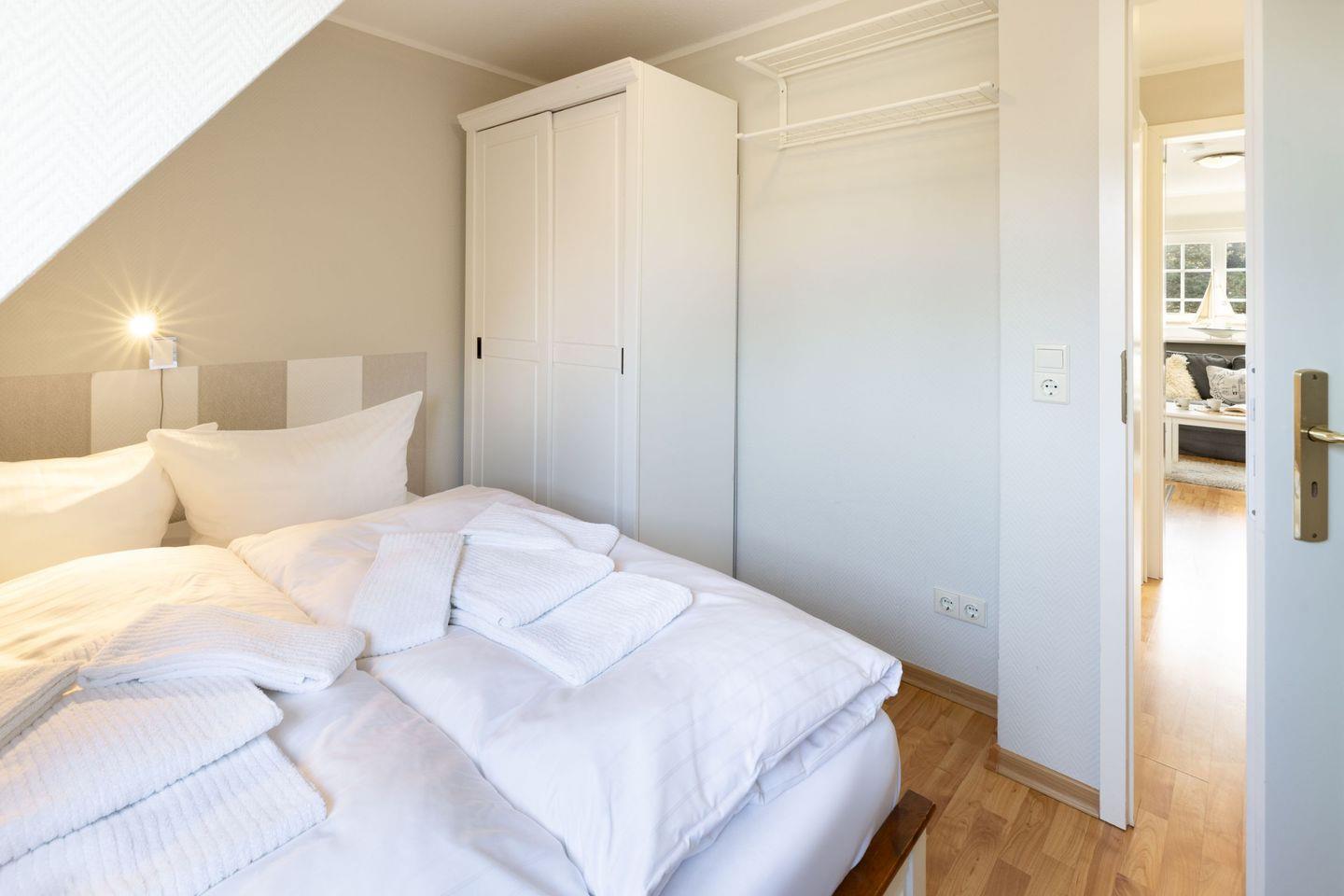 Das Appartement "Strand" (65 m²) für vier Personen liegt im Obergeschoss und bietet zwei Schlafräume im Dachgeschoss, jeweils mit Doppelbett.