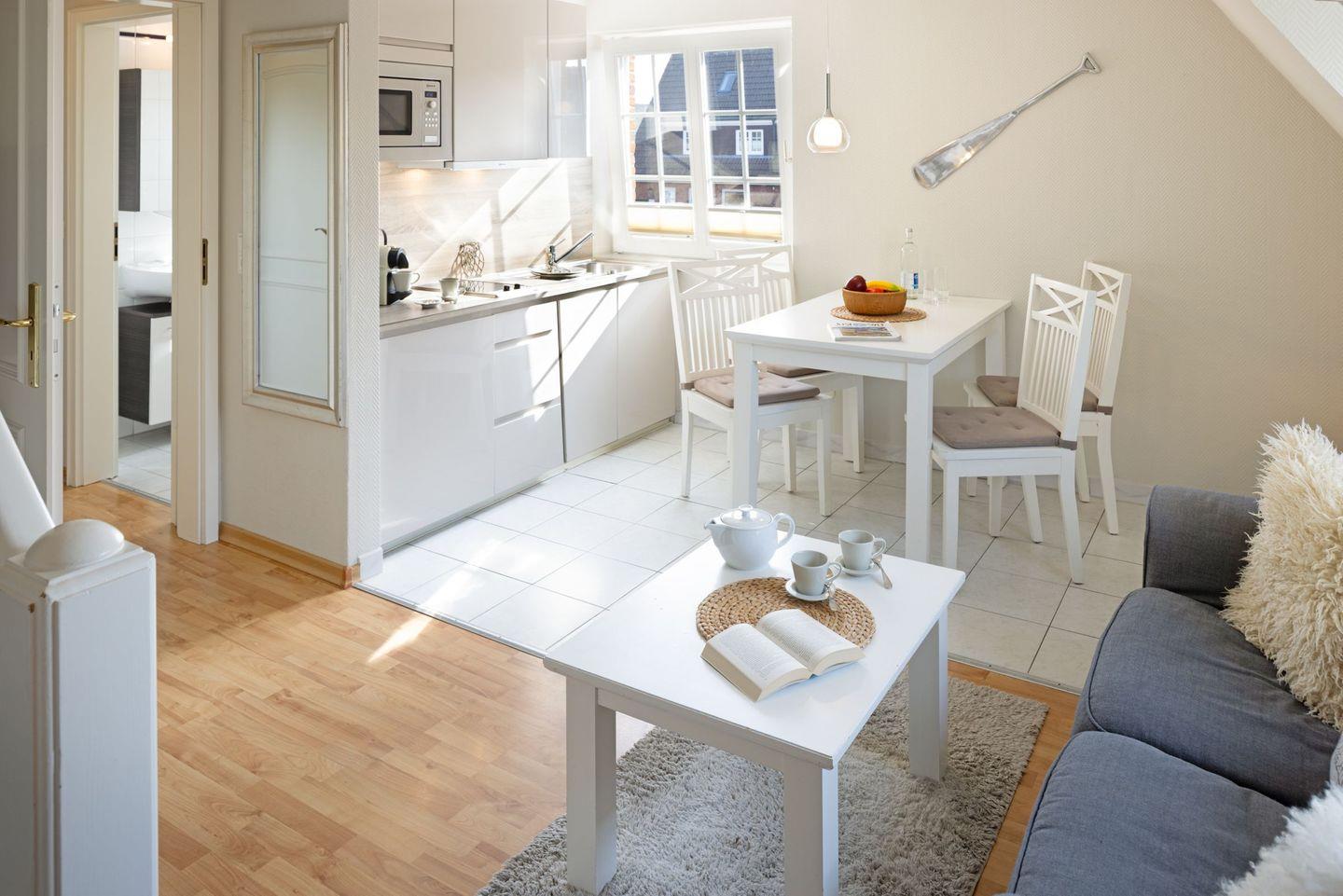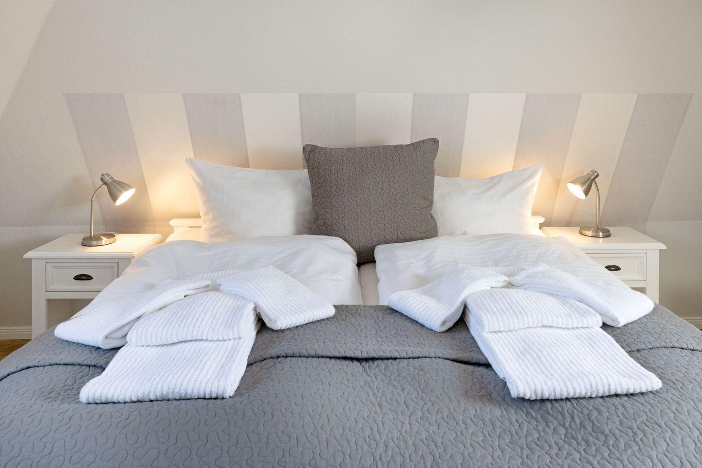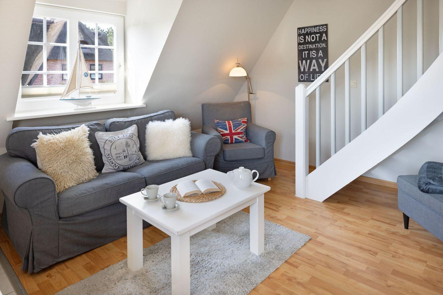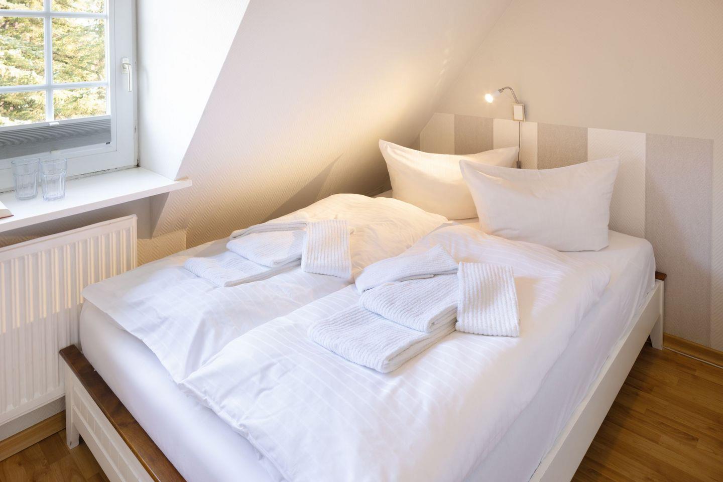 Das Appartement "Strand" (65 m²) für vier Personen liegt im Obergeschoss und bietet zwei Schlafräume im Dachgeschoss, jeweils mit Doppelbett.