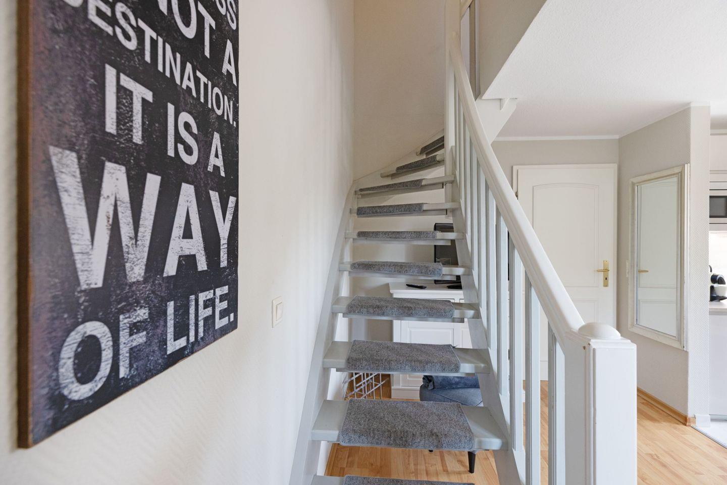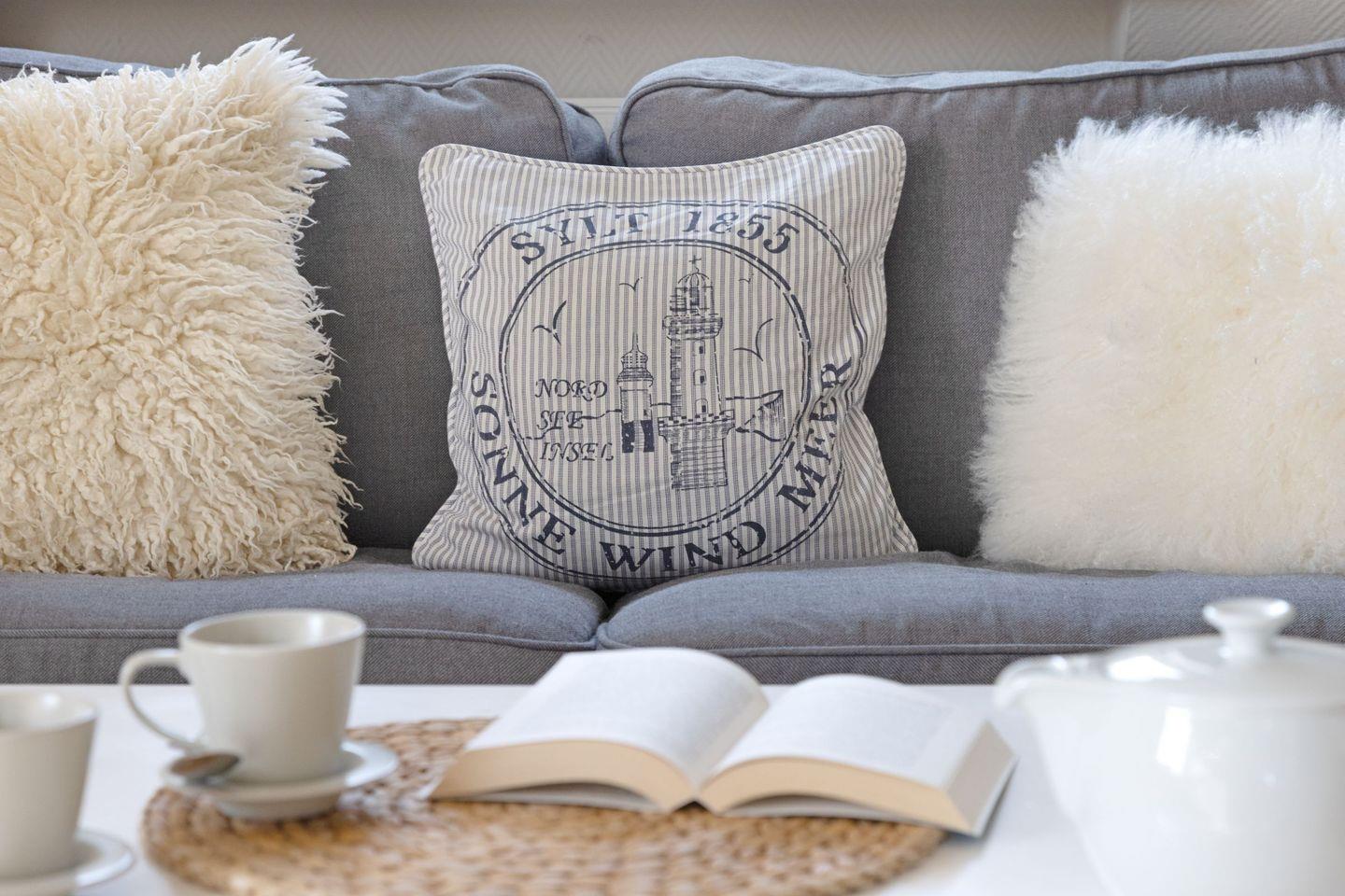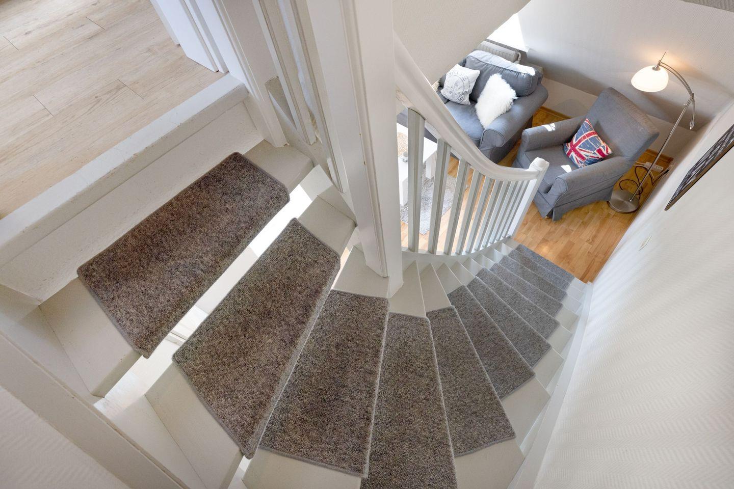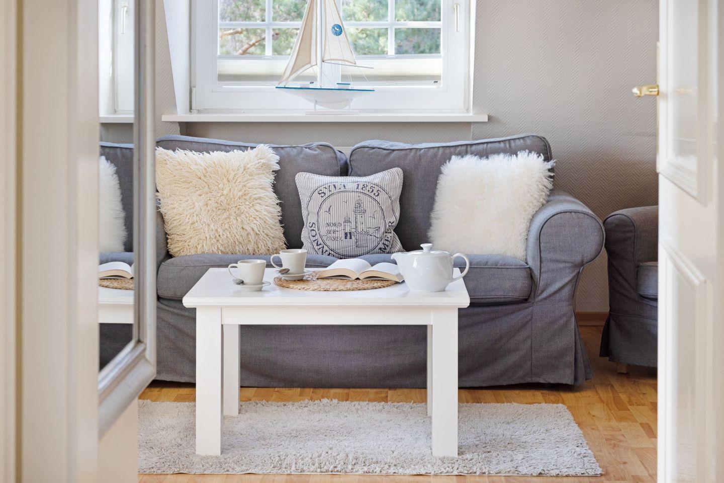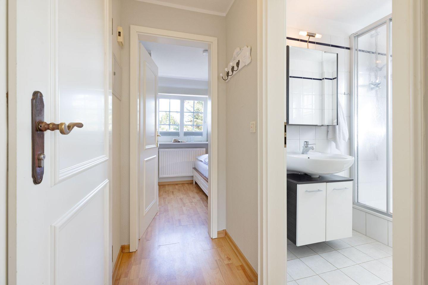 Das Appartement "Strand" (65 m²) für vier Personen liegt im Obergeschoss und bietet zwei Schlafräume im Dachgeschoss, jeweils mit Doppelbett.