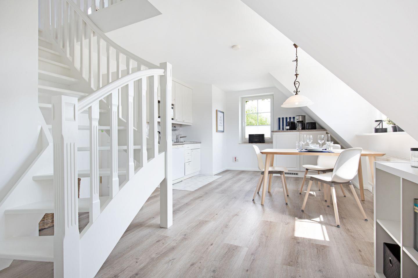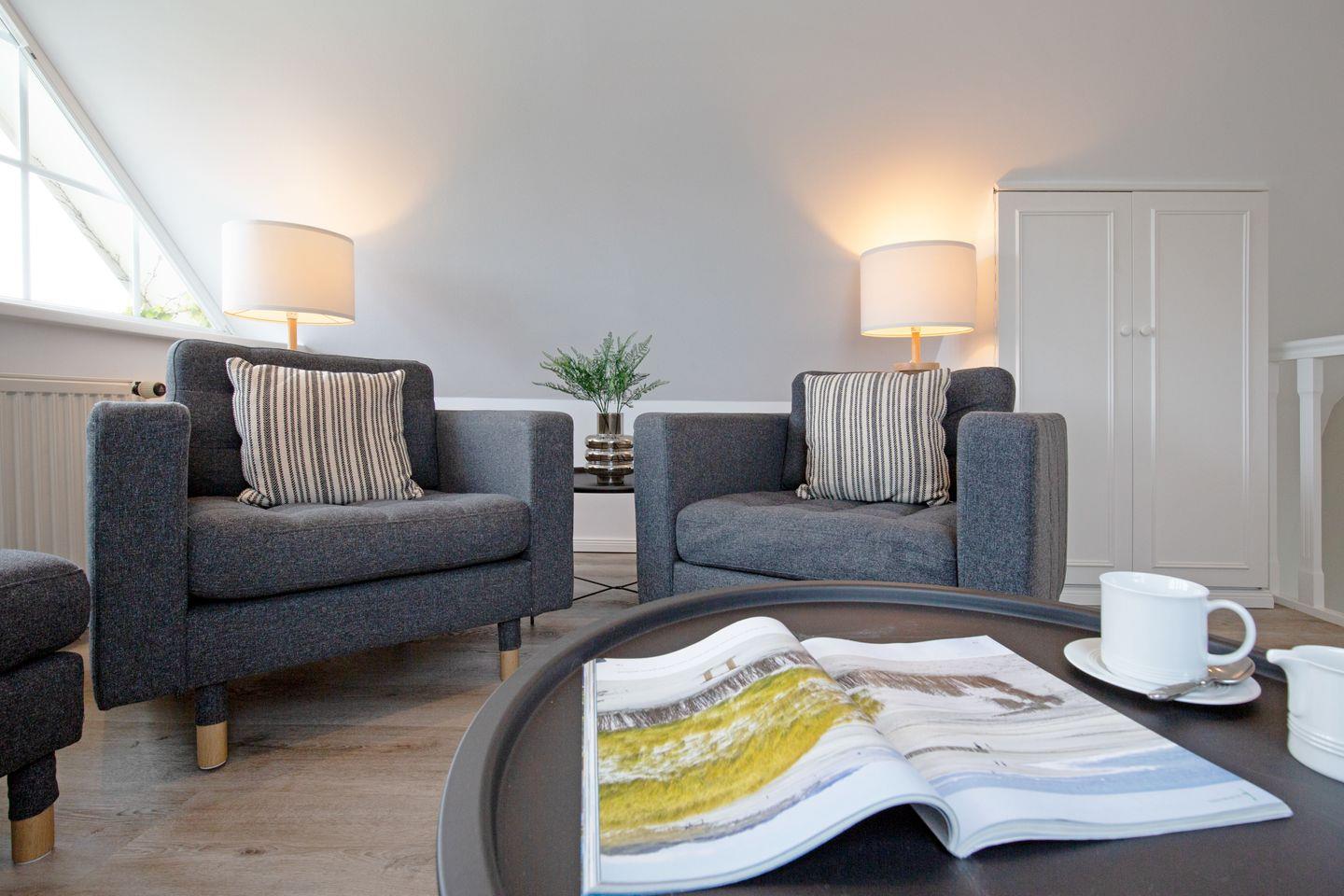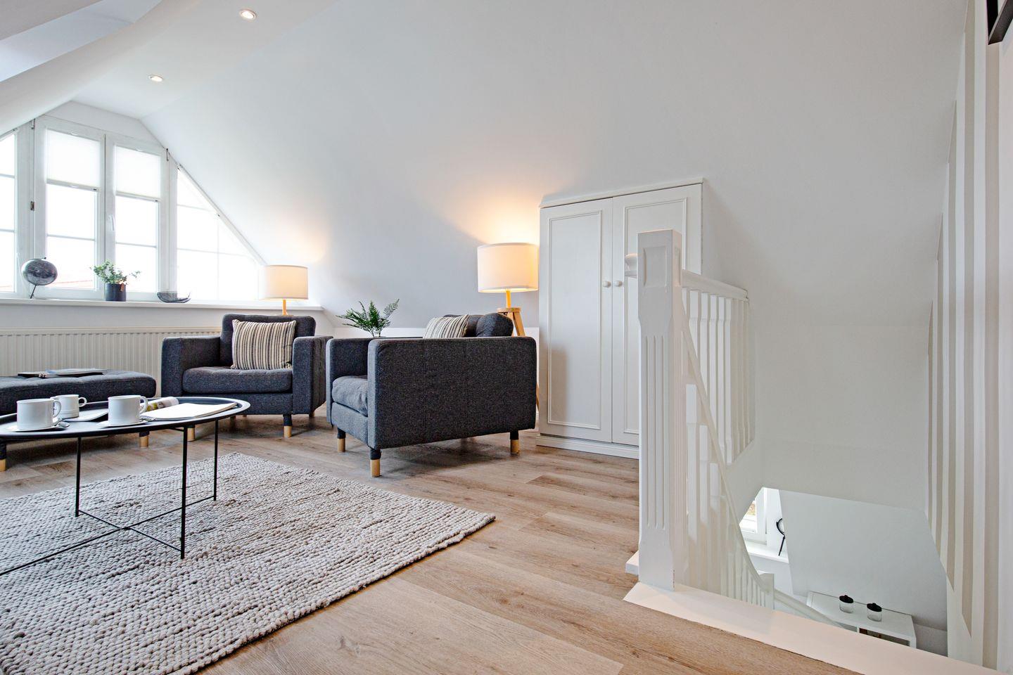 Über eine Treppe innerhalb der Wohnung kommen Sie in das Wohnzimmer mit Blick über den Königshafen und das Meer.