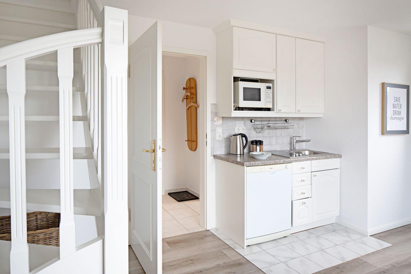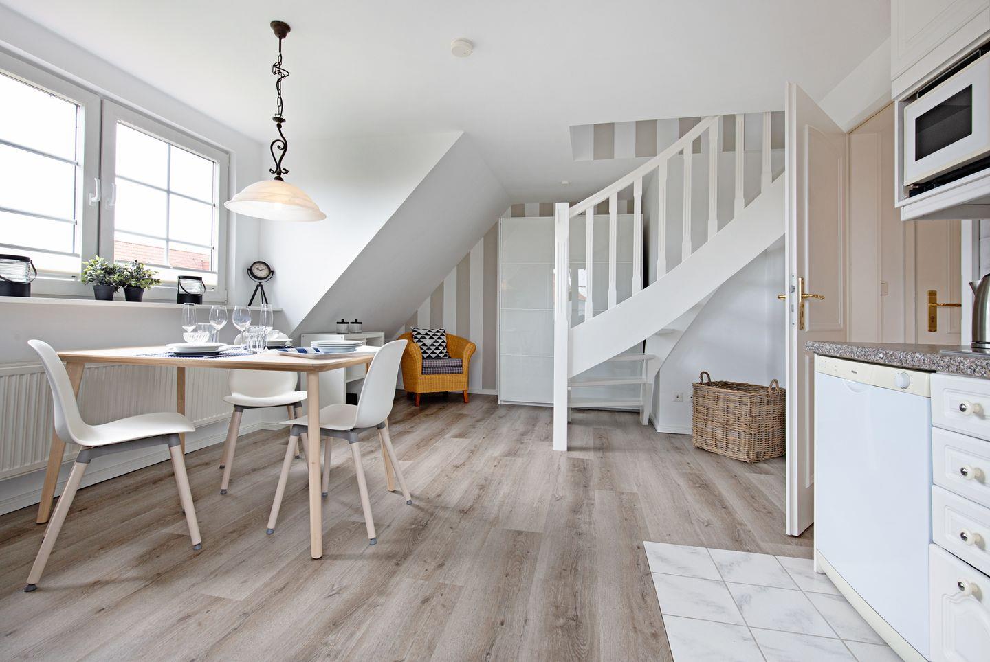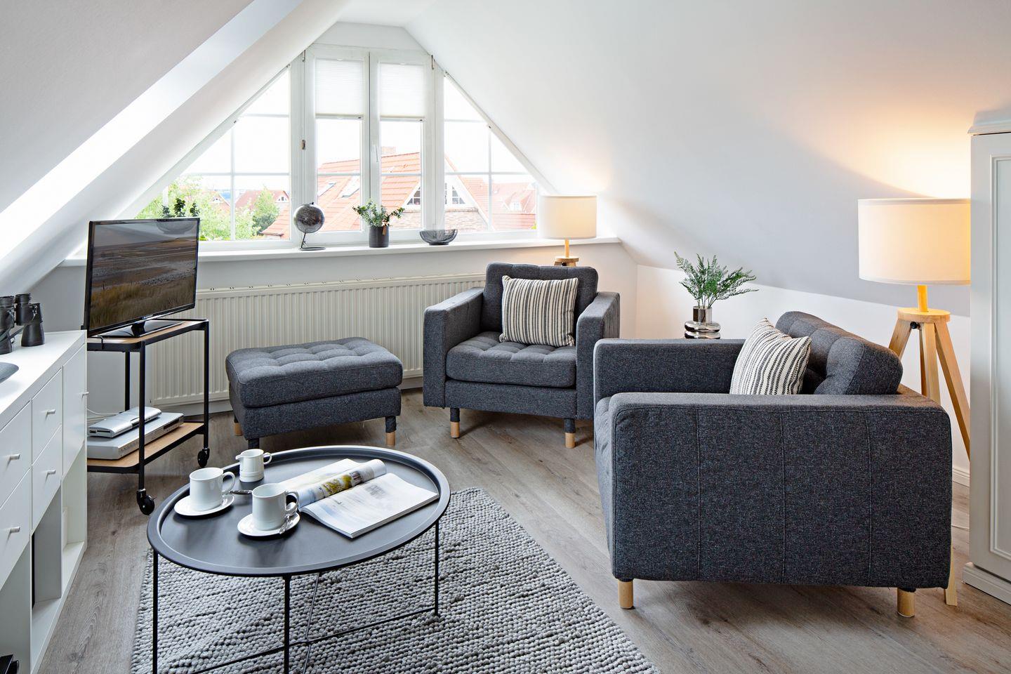 Über eine Treppe innerhalb der Wohnung kommen Sie in das Wohnzimmer mit Blick über den Königshafen und das Meer.