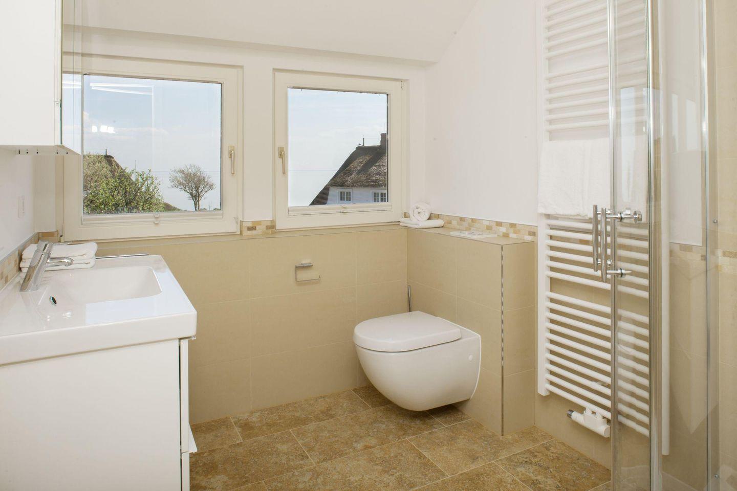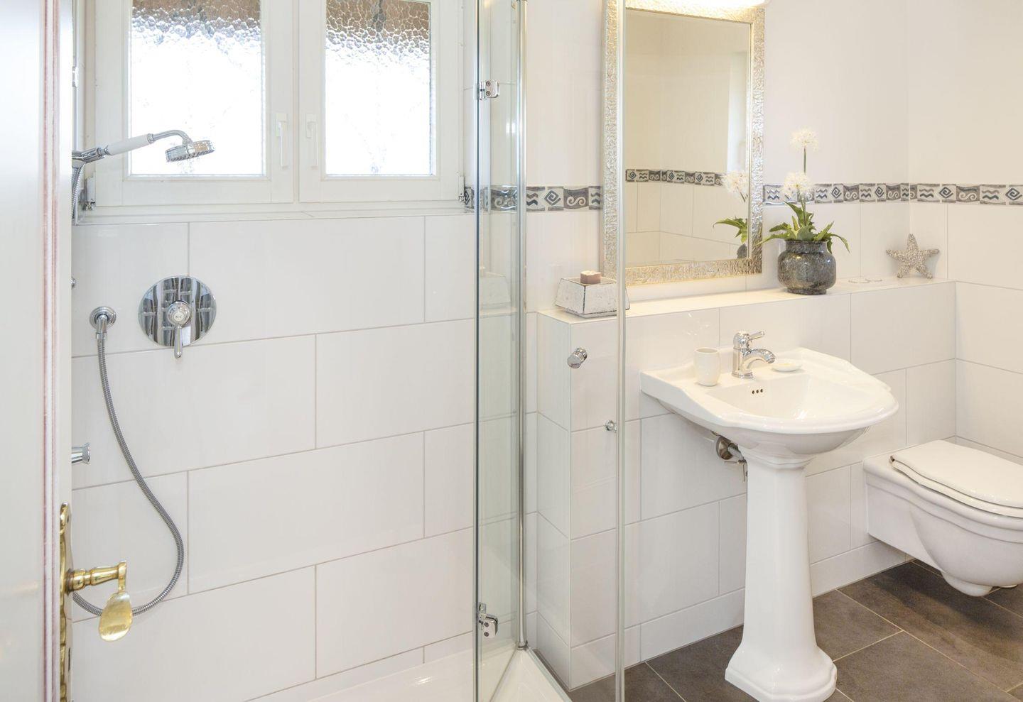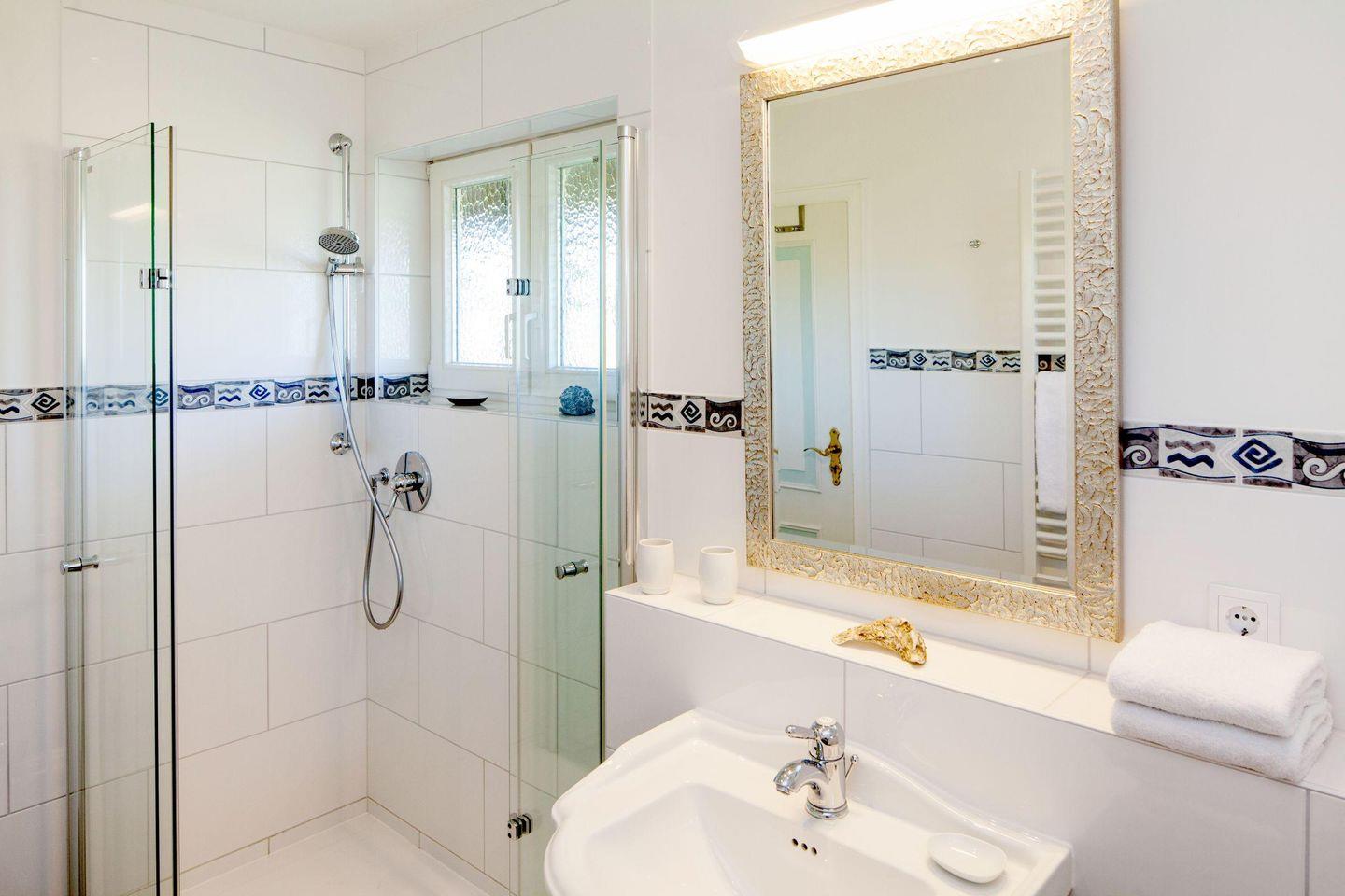 Im EG gibt es ein Schlafzimmer mit Doppelbett und ein Duschbad. Im ersten Stock befinden sich die weiteren Schlafräume (eines mit Doppelbett, eines mit Einzelbetten) und ein weiteres Duschbad mit WC. Unten im Souterrain befindet sich die Waschmaschine, Trockner und die Sauna. Ein großer Kühlschrank mit Gefriereinheit, eine Terrasse mit gemauerter Rundtischgruppe und ein zweiter Fernseher gehören ebenfalls zur Ausstattung.