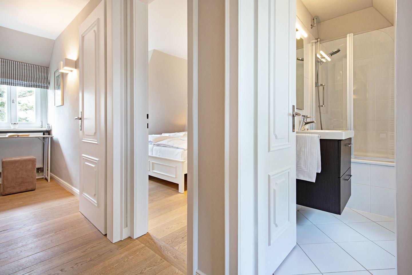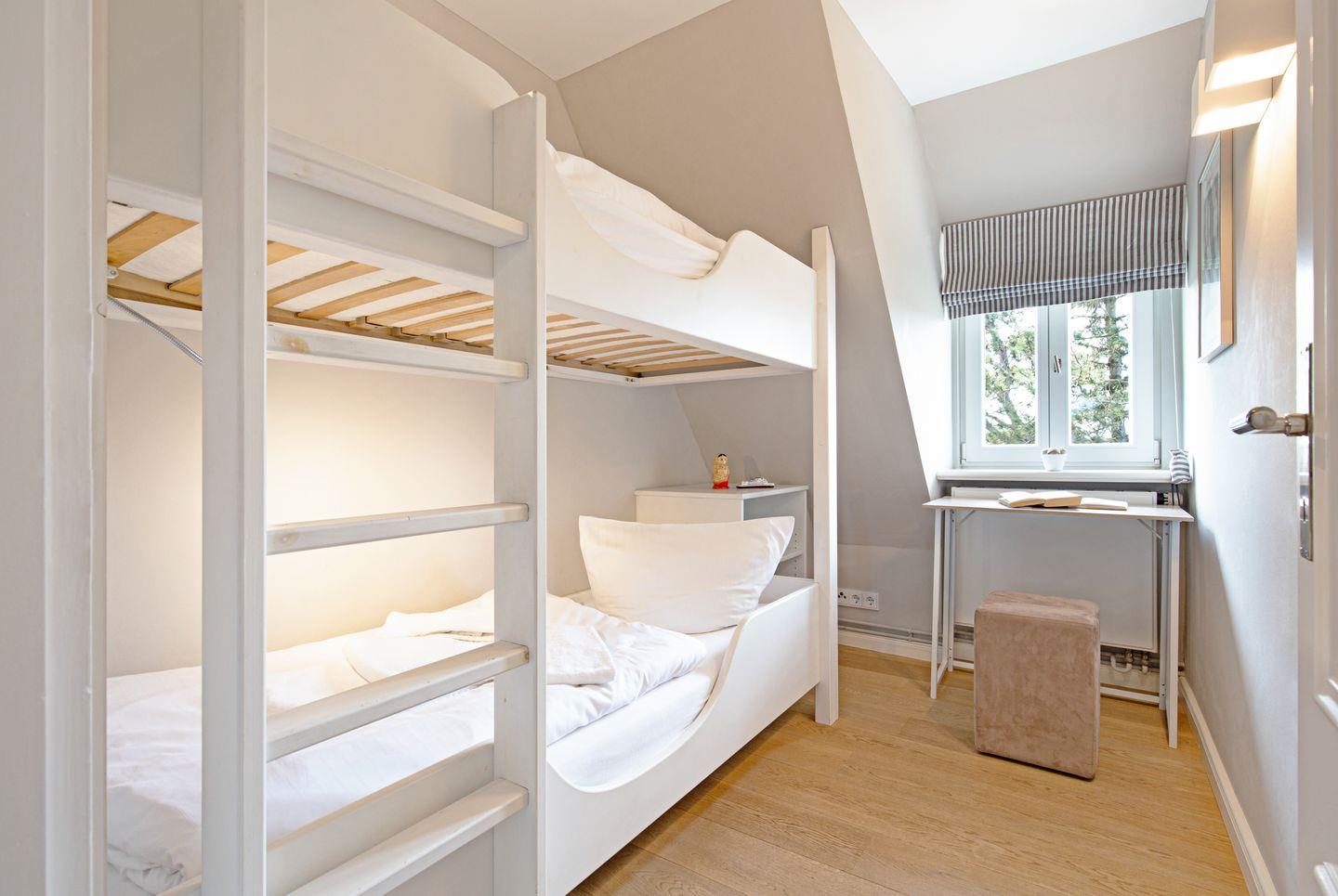 Im ersten Stock befinden sich die Schlafzimmer; eines mit Doppel- und eines mit Etagenbett und Ihr Badezimmer mit Badewanne.