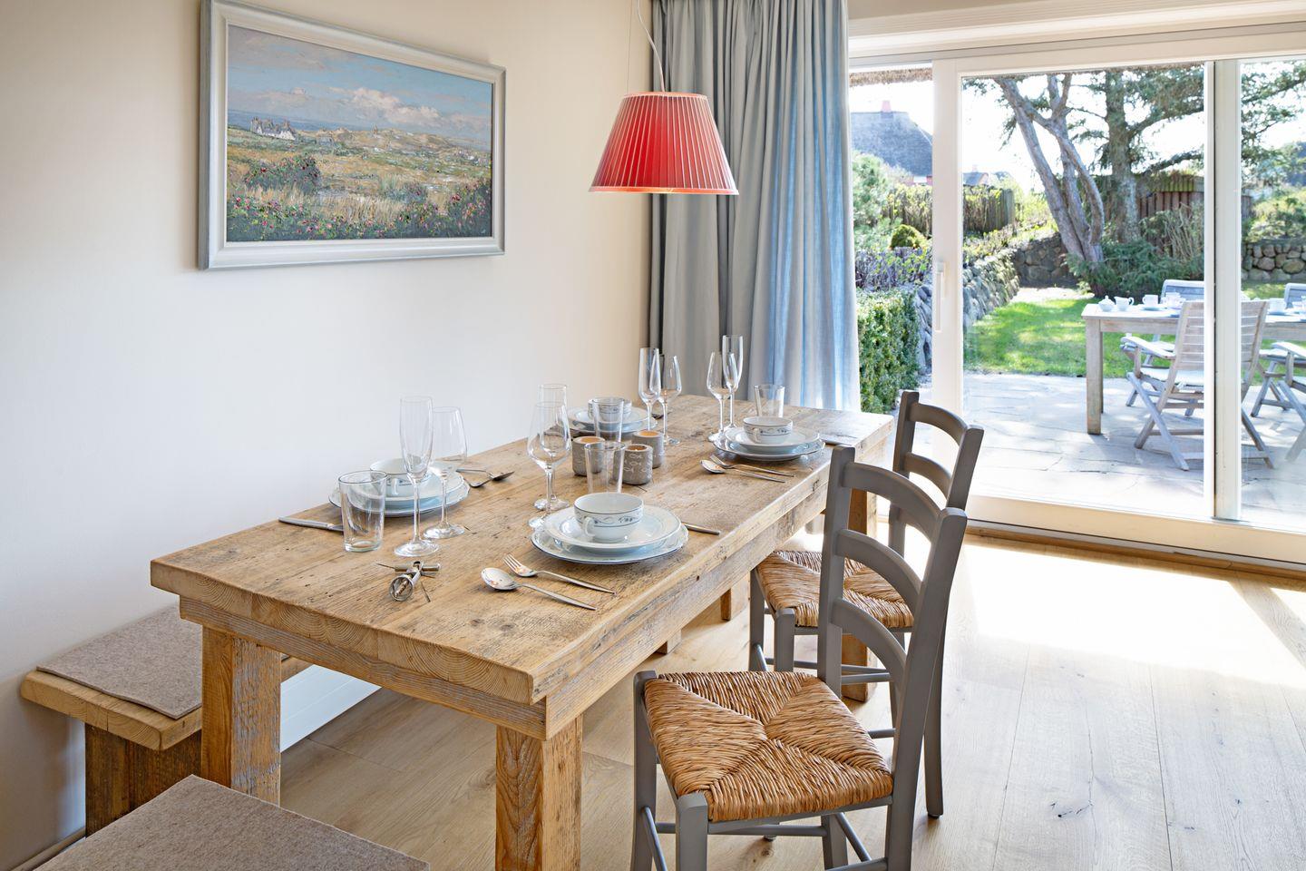 Vom Esstisch aus können Sie Ihren Blick durch den schön angelegten Garten schweifen lassen.