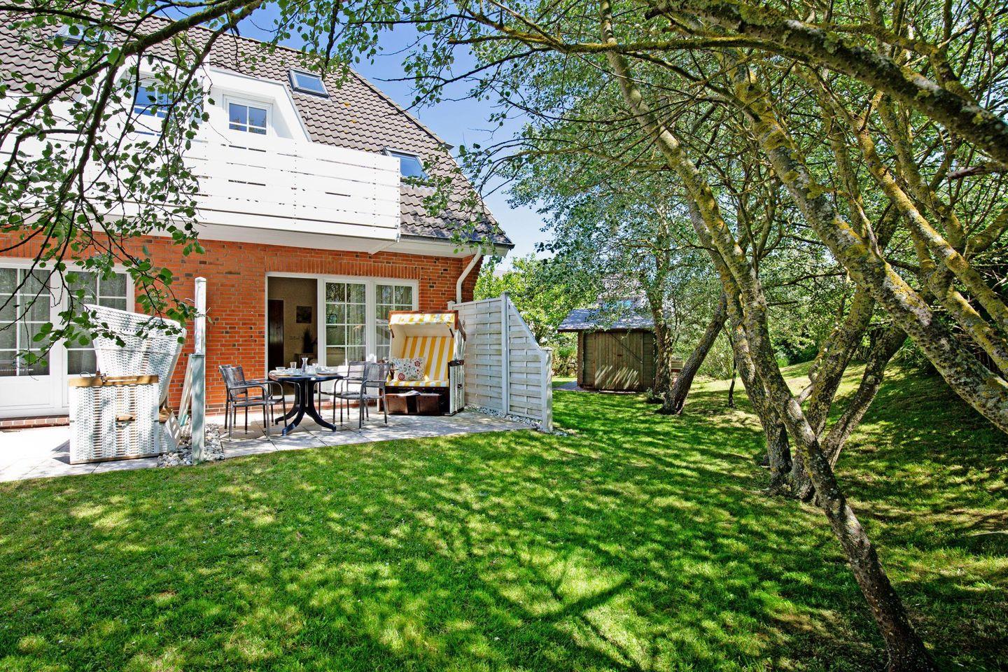 Charmantes Appartement Friesenkoje in List mit Terrasse, Strandkorb und grünem Ausblick für erholsame Urlaubstage.