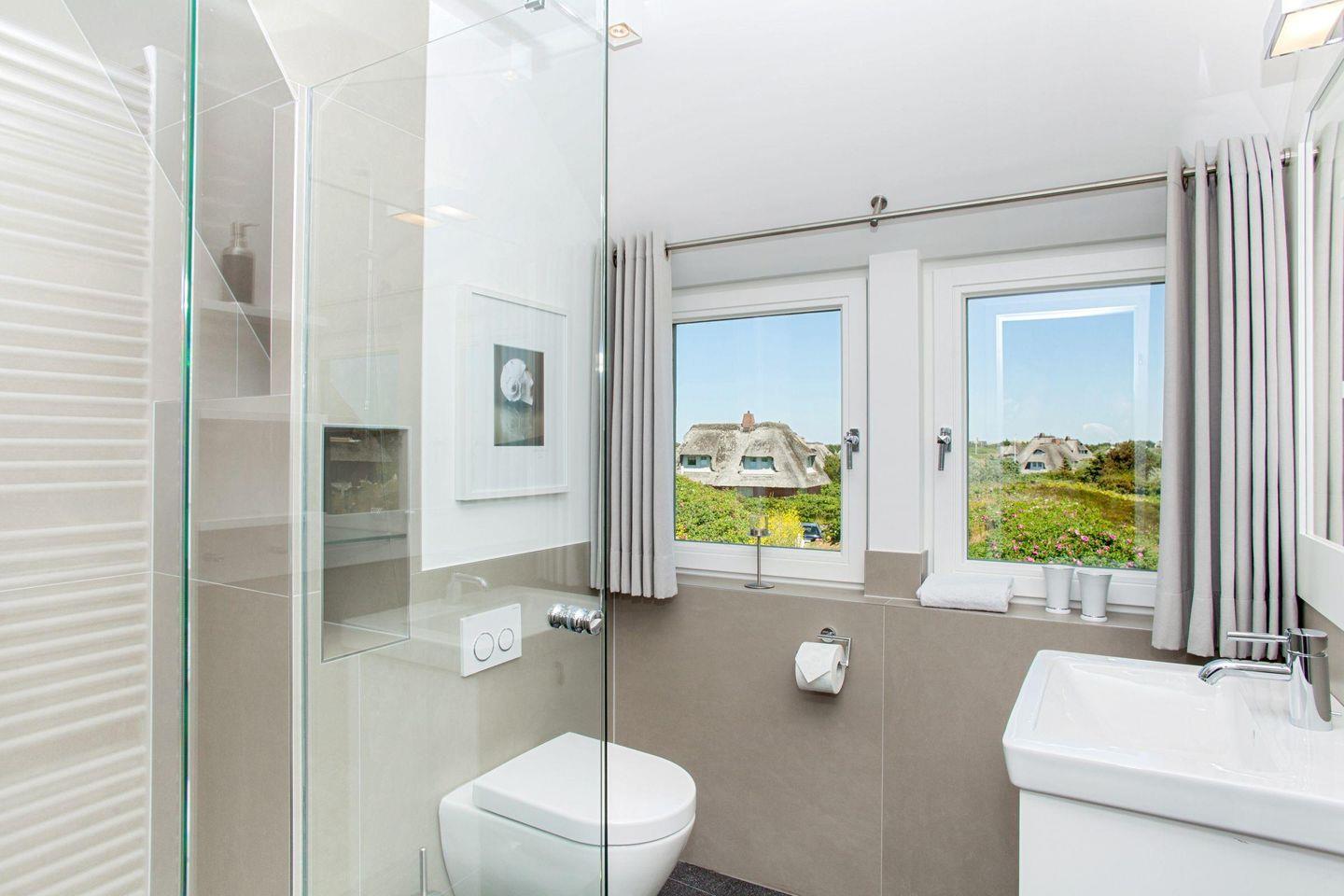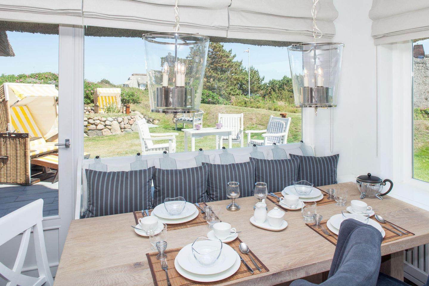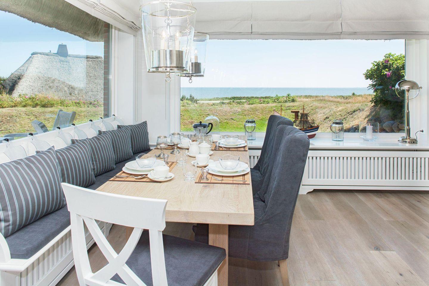 Durch die großen Panorama-Fenster können Sie Ihren Blick über das Wattenmeer schweifen lassen. Neben dem Duschbad und dem extra Gäste-WC steht Ihnen im EG eine eigene kleine Sauna zur Verfügung. Der weite Garten mit Terrasse ist mit Gartenmöbeln und zwei Strandkörben (saisonal begrenzt) ausgestattet. Mehr Meerblick geht nicht... Grillen und offenes Feuer sind im Garten und anliegendem Gelände streng verboten. Sie wohnen in einem reetgedeckten Ferienhaus.