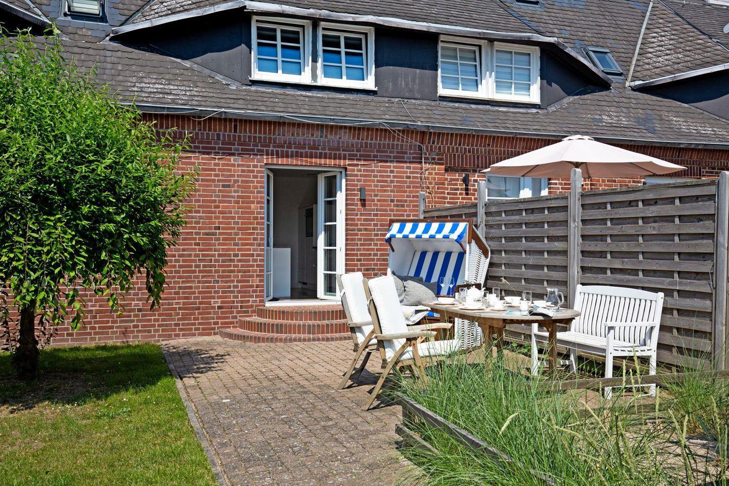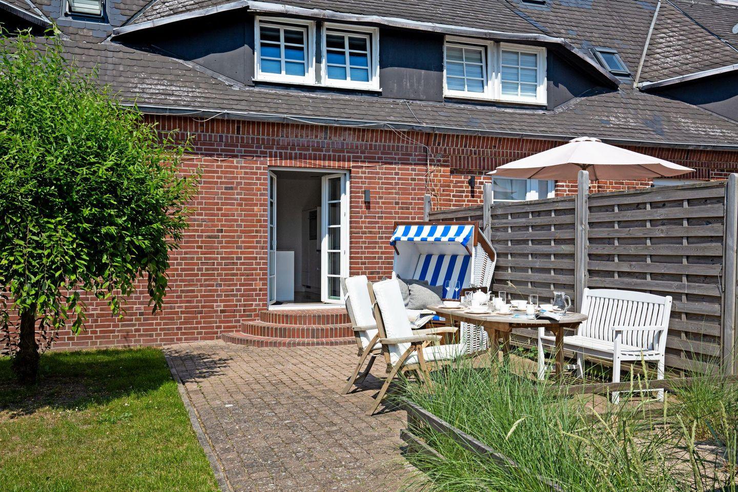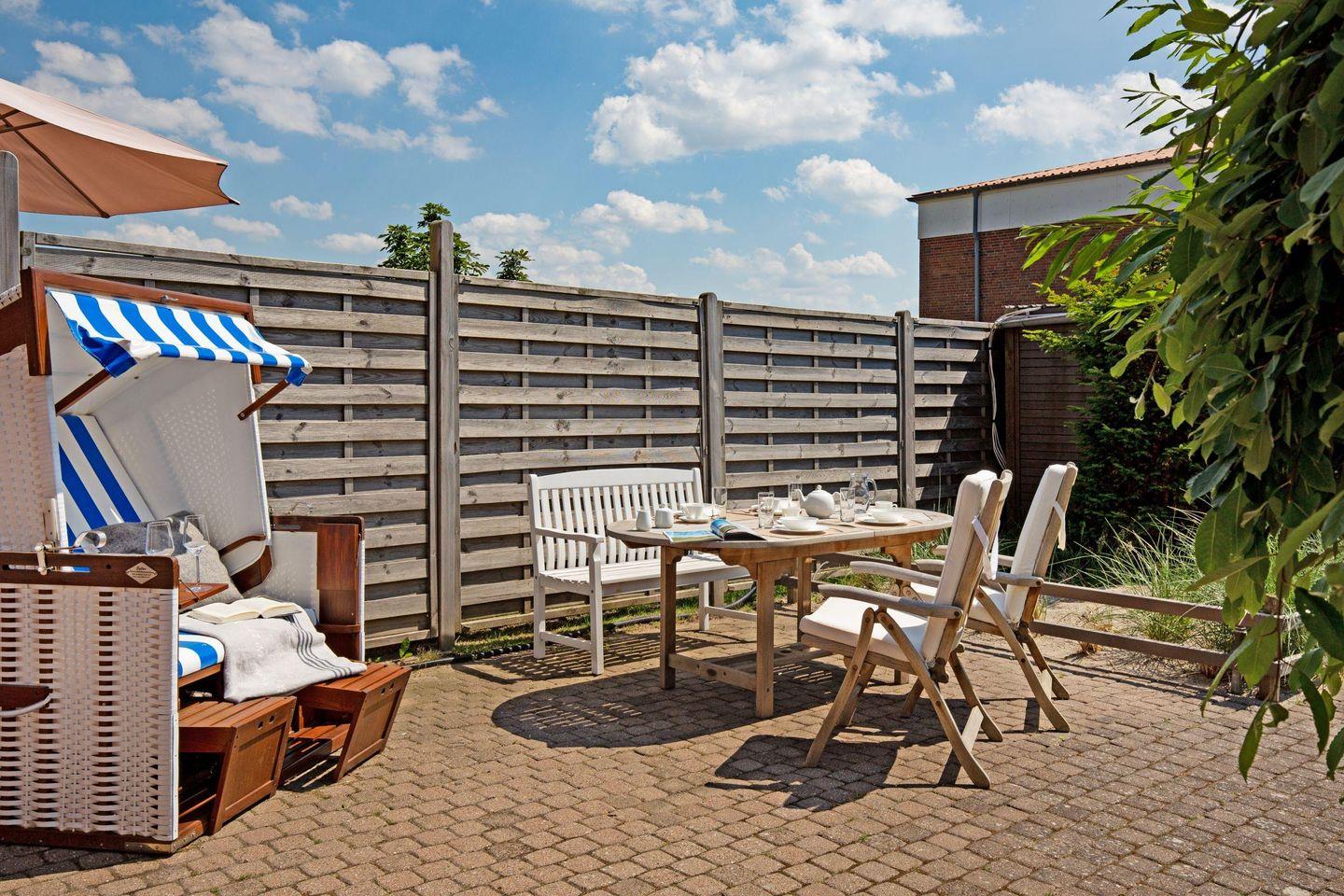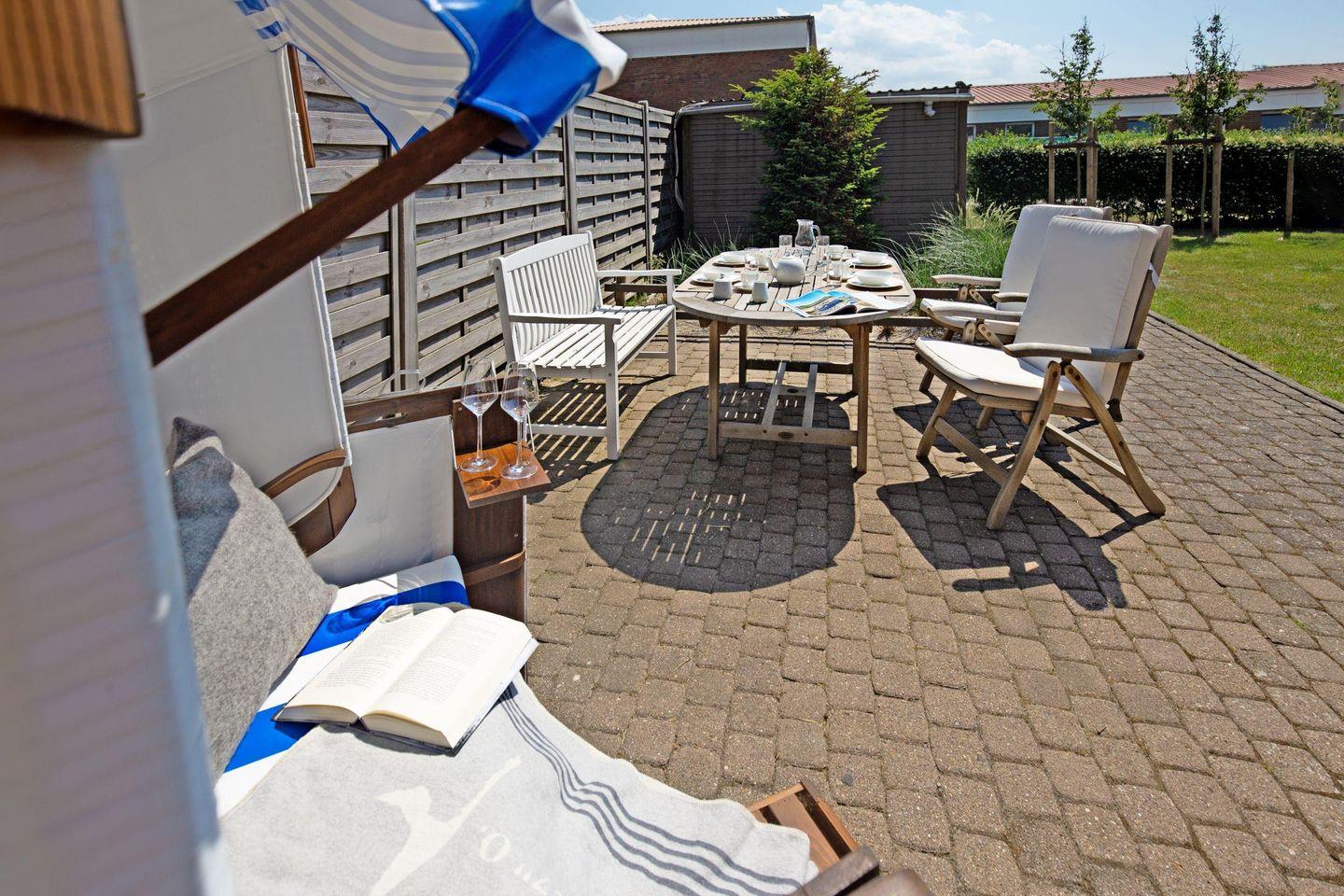 Großes familienfreundliches Ferienreihenhaus für bis zu sechs Personen mit Terrasse und Strandkorb.