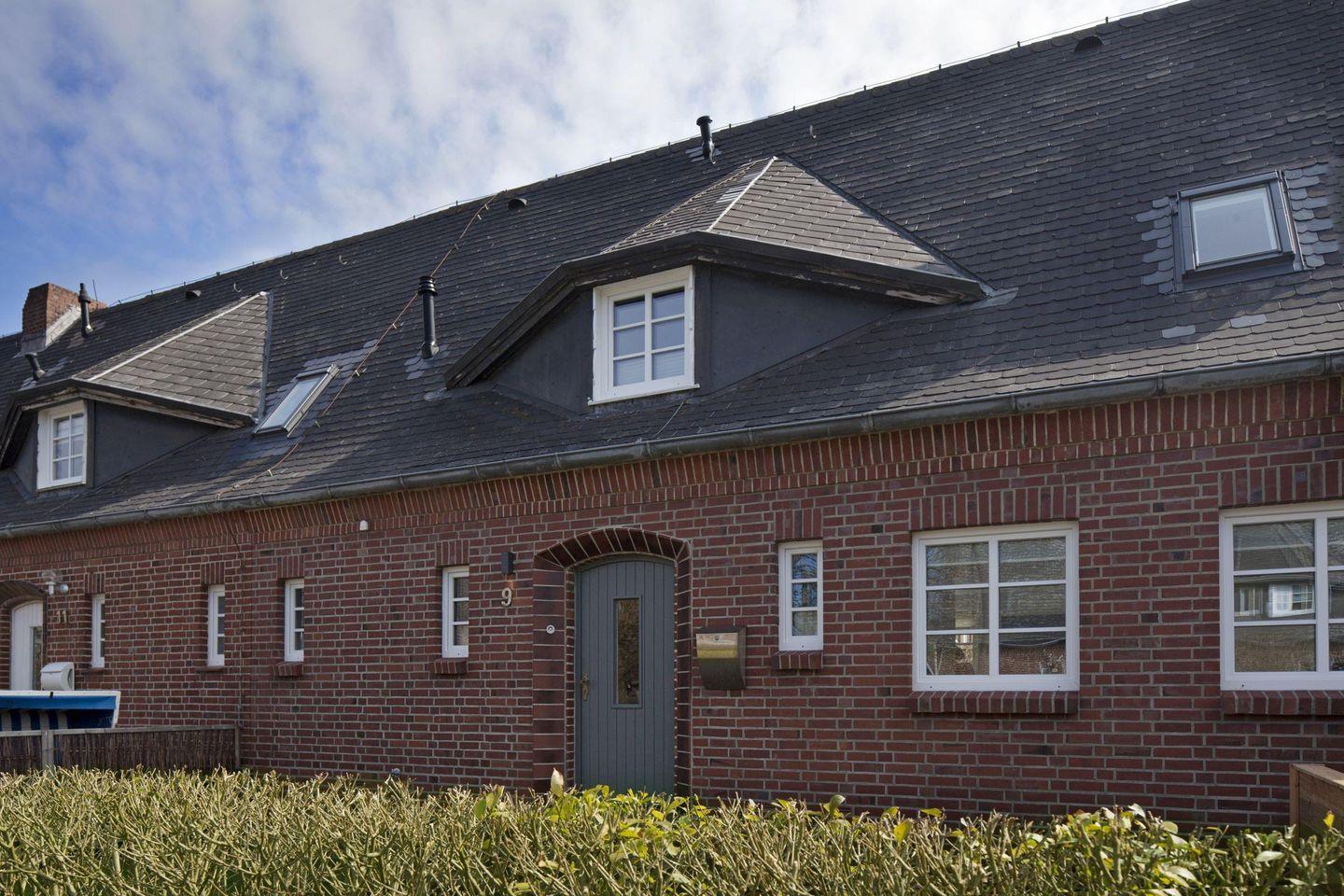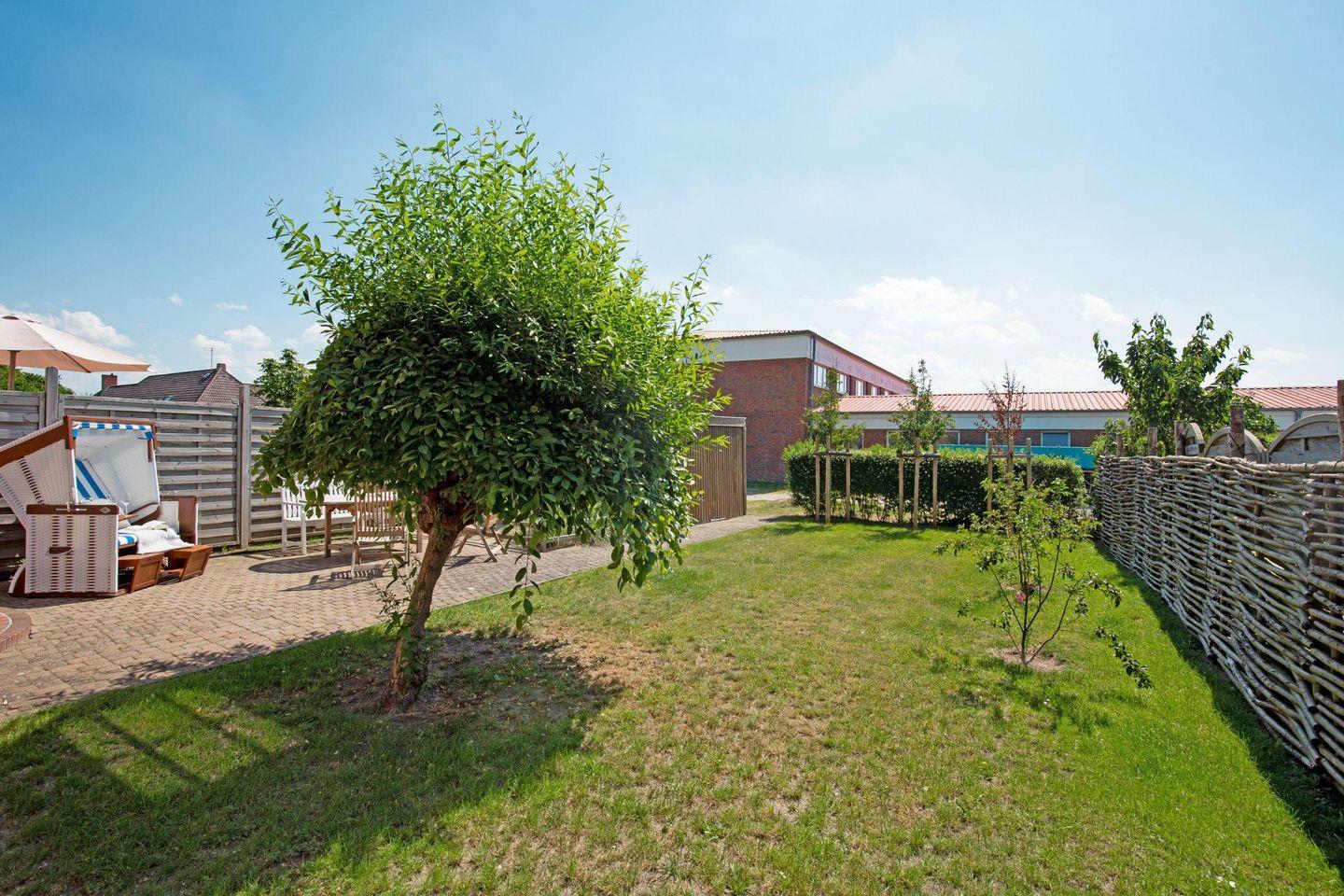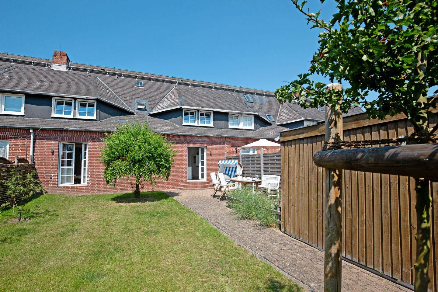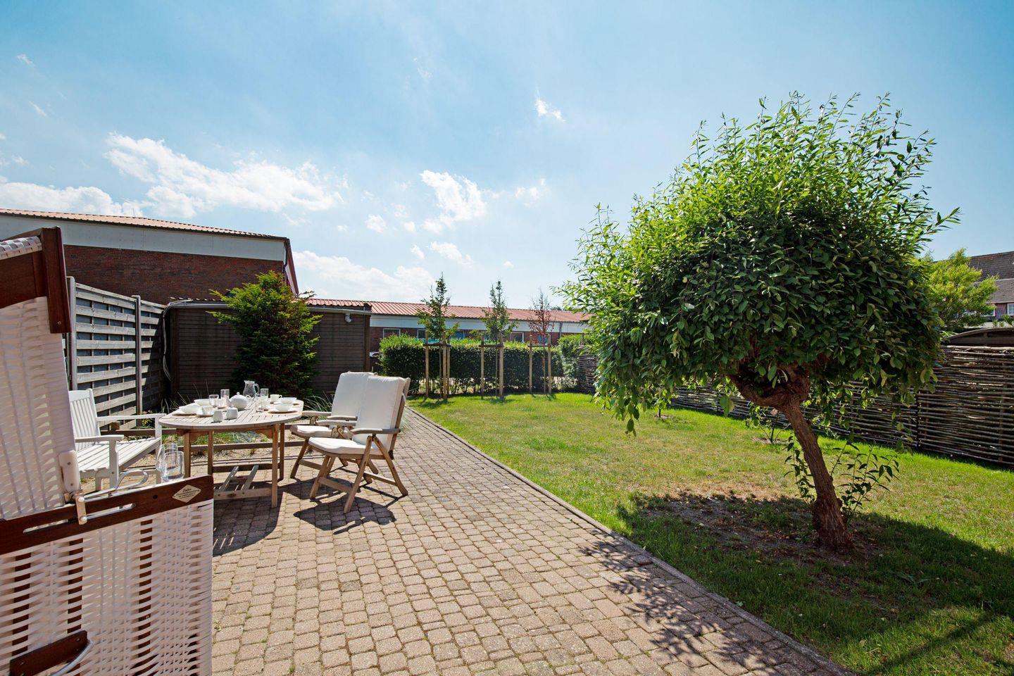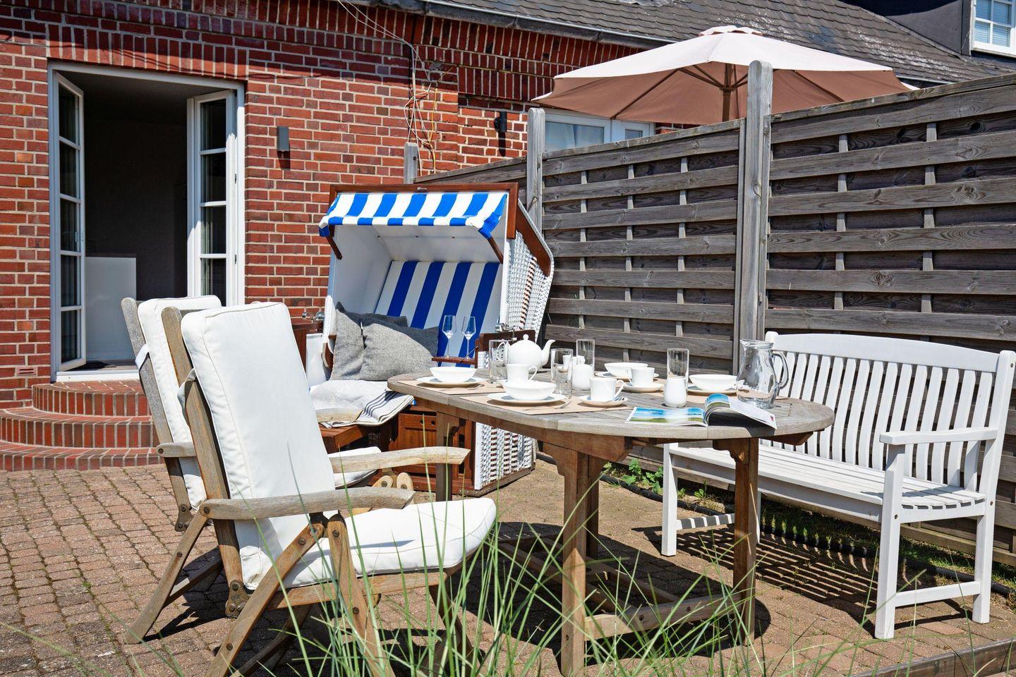 Großes familienfreundliches Ferienreihenhaus für bis zu sechs Personen mit Terrasse und Strandkorb.
