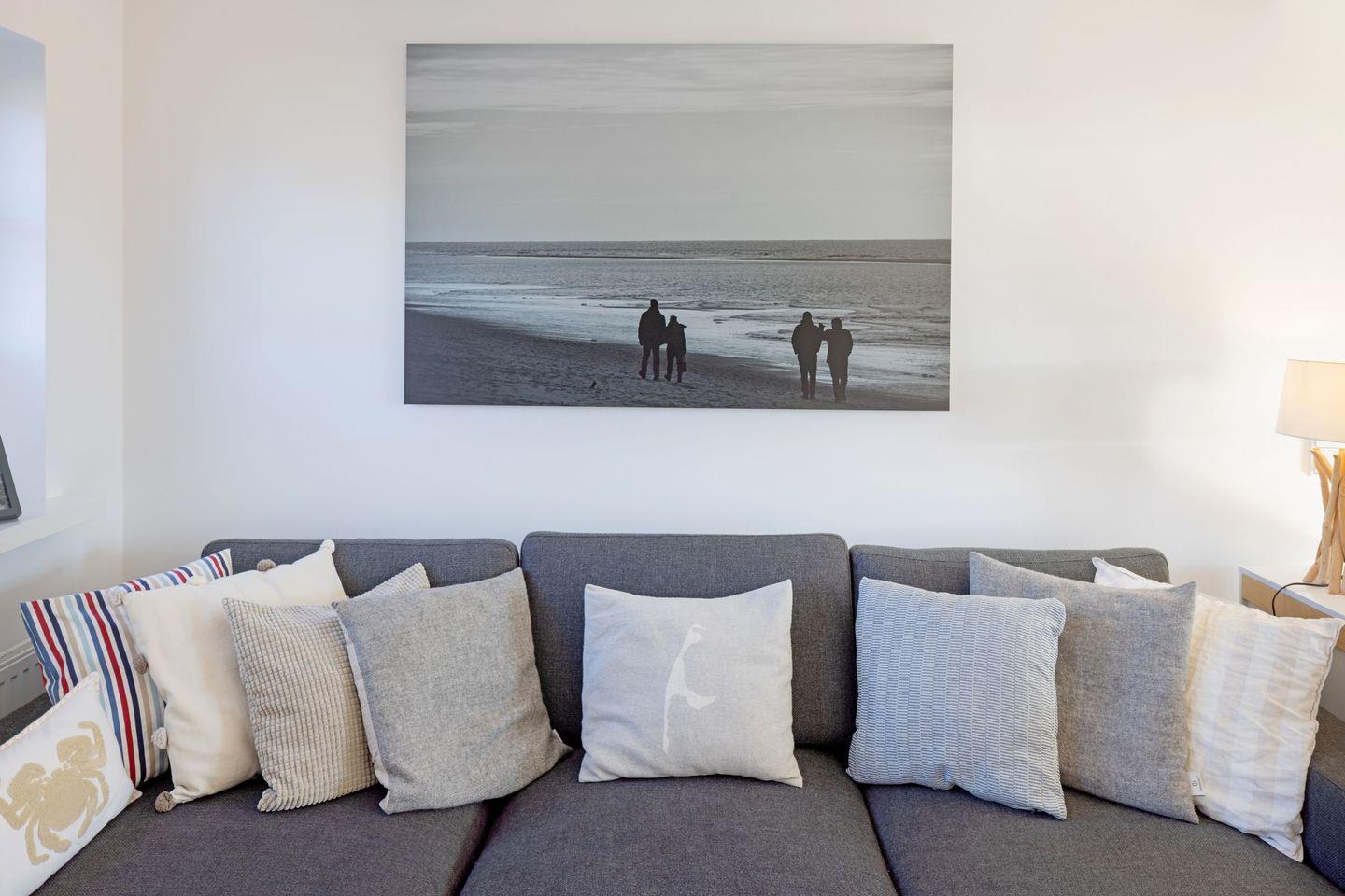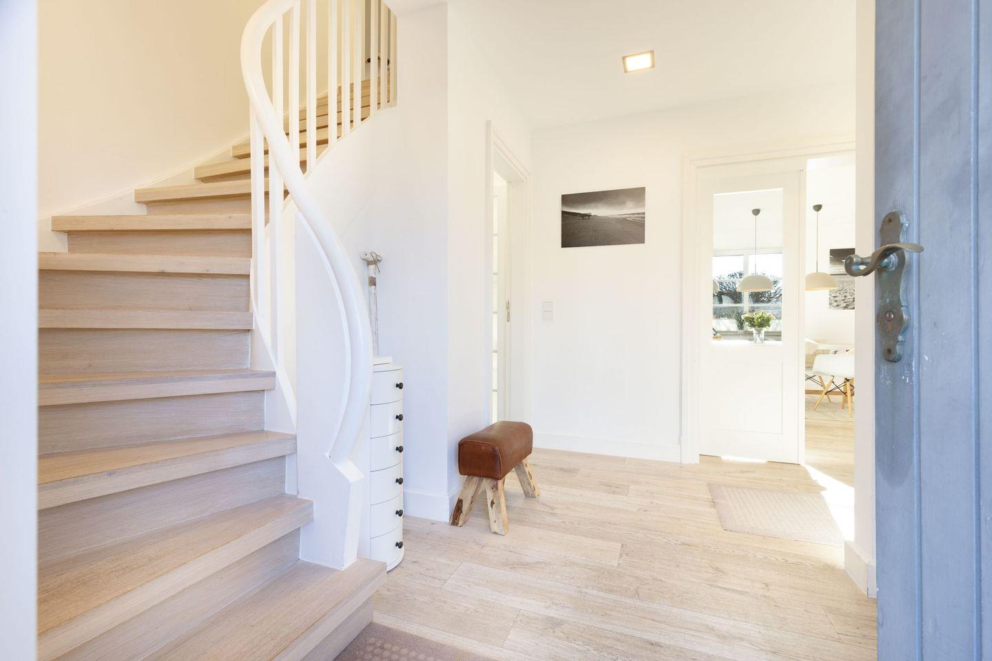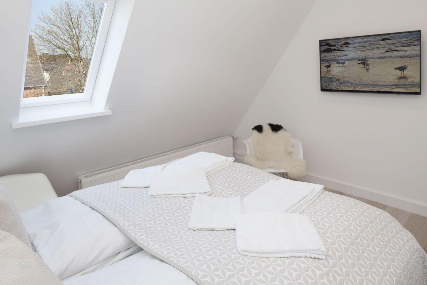 Es verfügt im 1. Stock über ein Schlafzimmer mit Doppelbett, ein Schlafzimmer mit Doppelbett und Bad en suite und einem weiteren Schlafzimmer mit Einzelbett und Etagenbett. Außerdem bietet das Bootsmanns Hüs mit ein Wannenbad, ein Duschbad und ein Gäste-WC dieses befindet sich im Erdgeschoss.