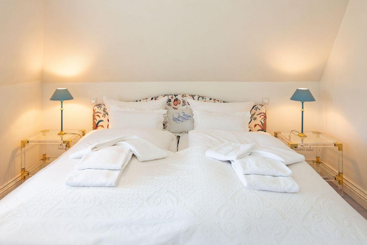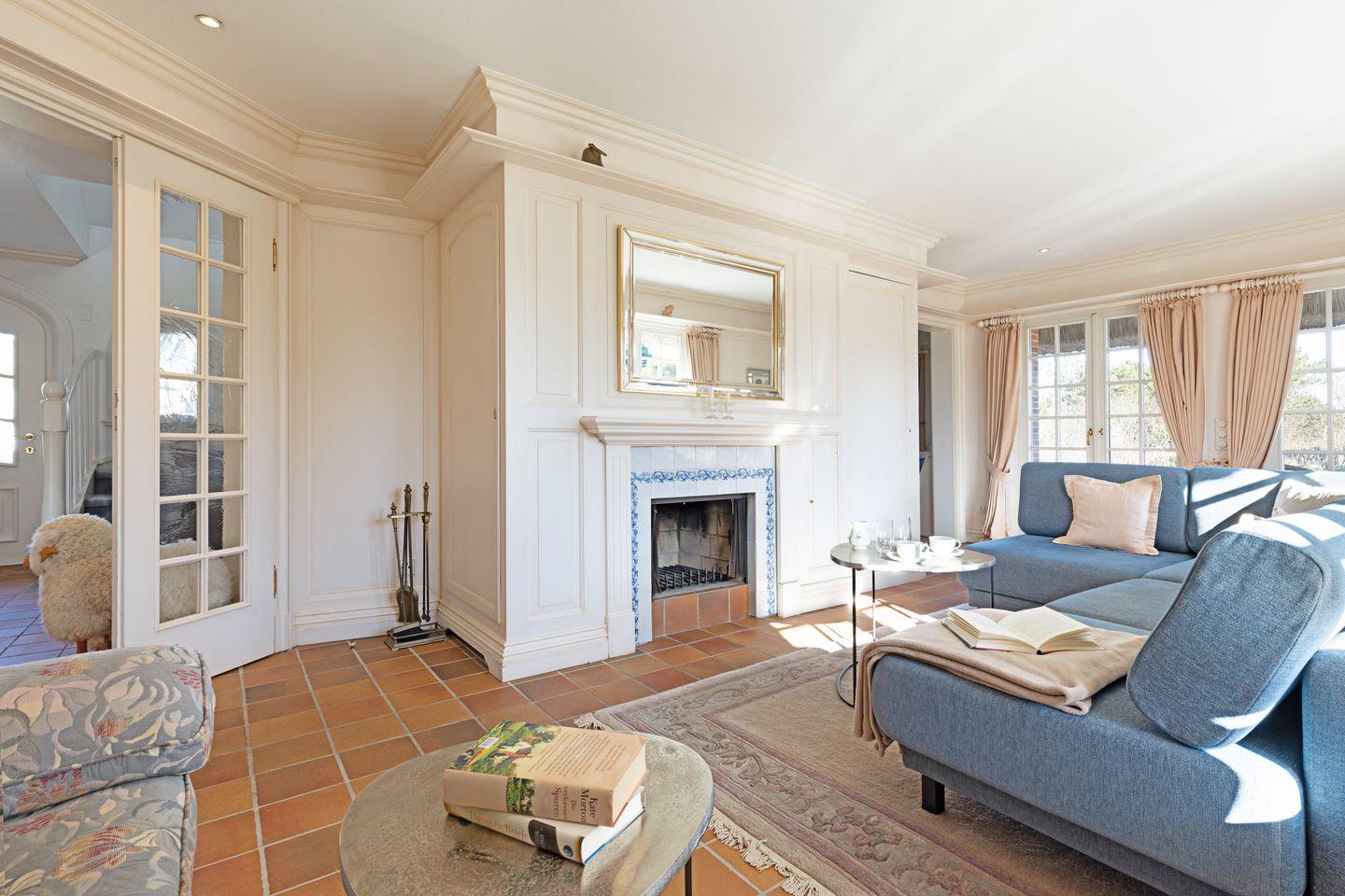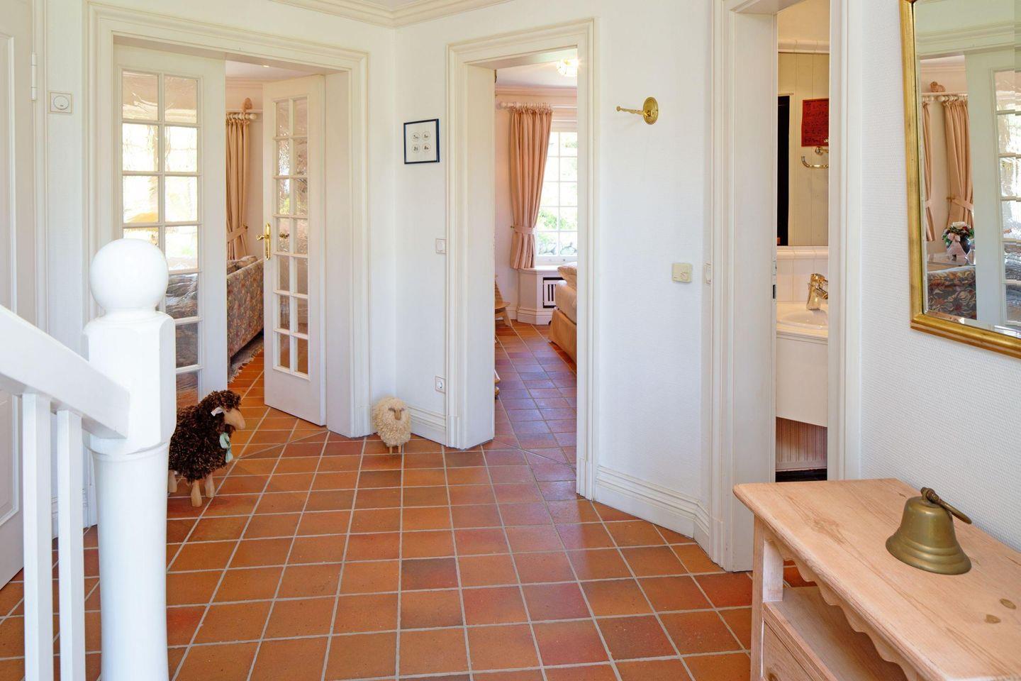 Der mit einem Holzkamin ausgestattete Wohnbereich mit offener Küche lädt zum gemeinsamen Verweilen ein. Im EG befindet sich ein Schlafzimmer mit Doppelbett und Bad. Zwei weitere Schlafzimmer mit jeweils einem Doppelbett und zwei Bädern befinden sich in der ersten Etage. Genießen Sie die eigene Sauna im Haus.