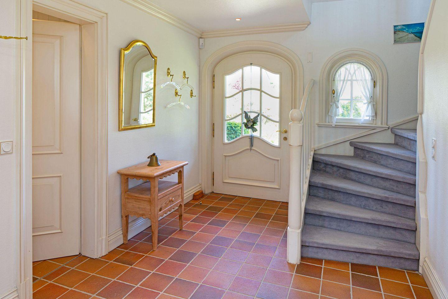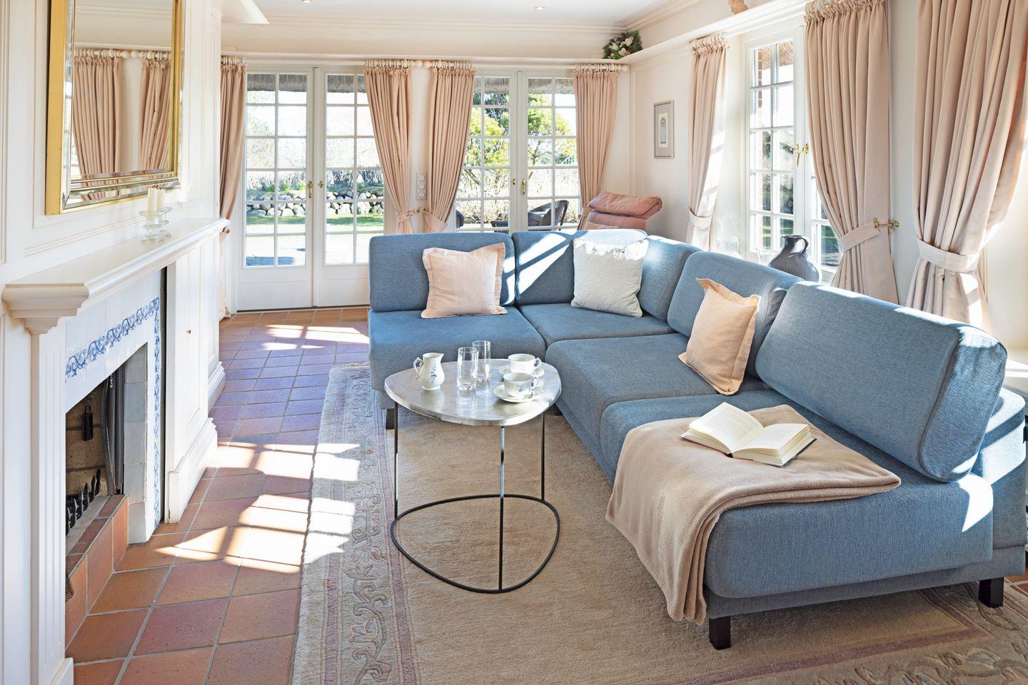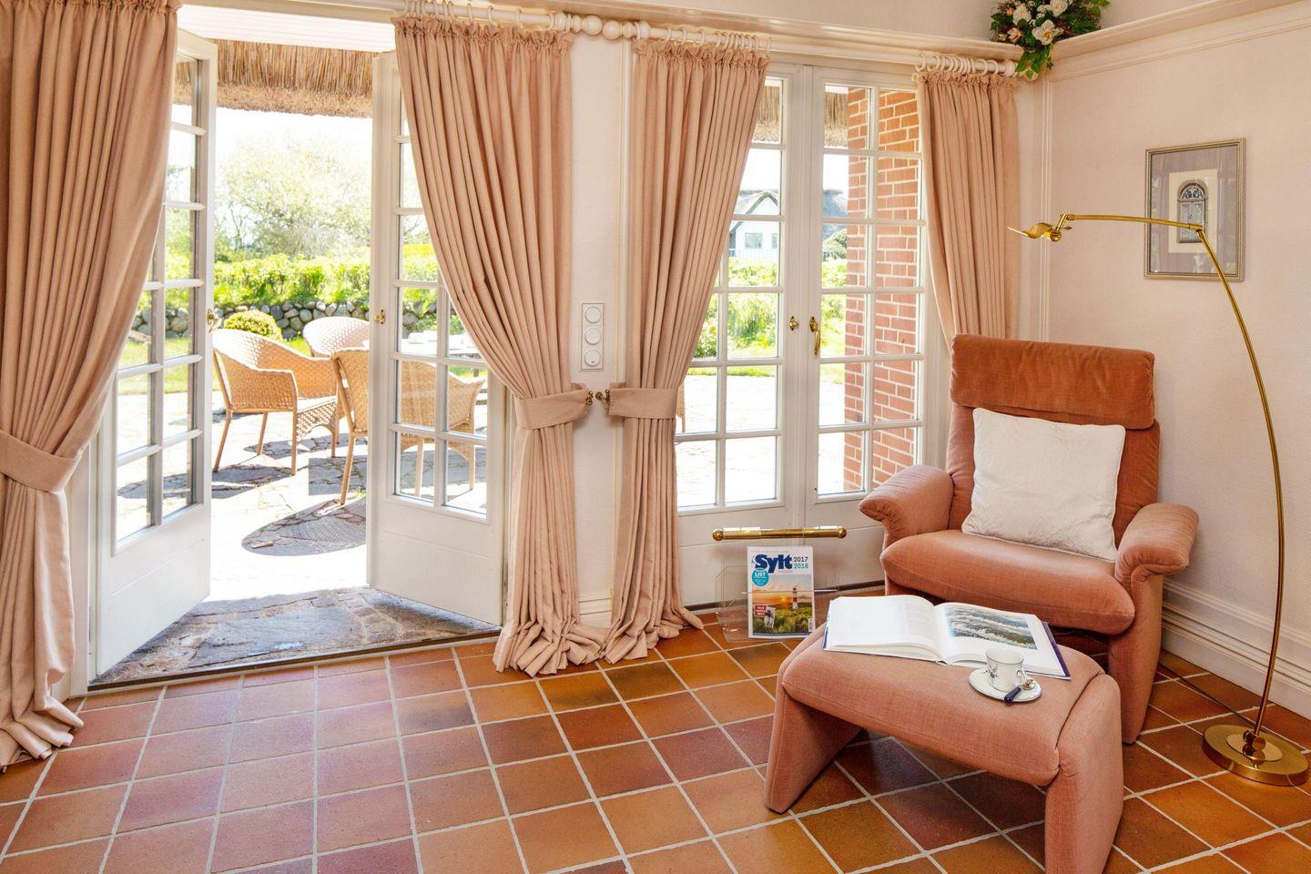Vom Wohnzimmer aus gelangen Sie in den großen Garten mit Terrasse, Strandkorb und Gartenmöbeln.