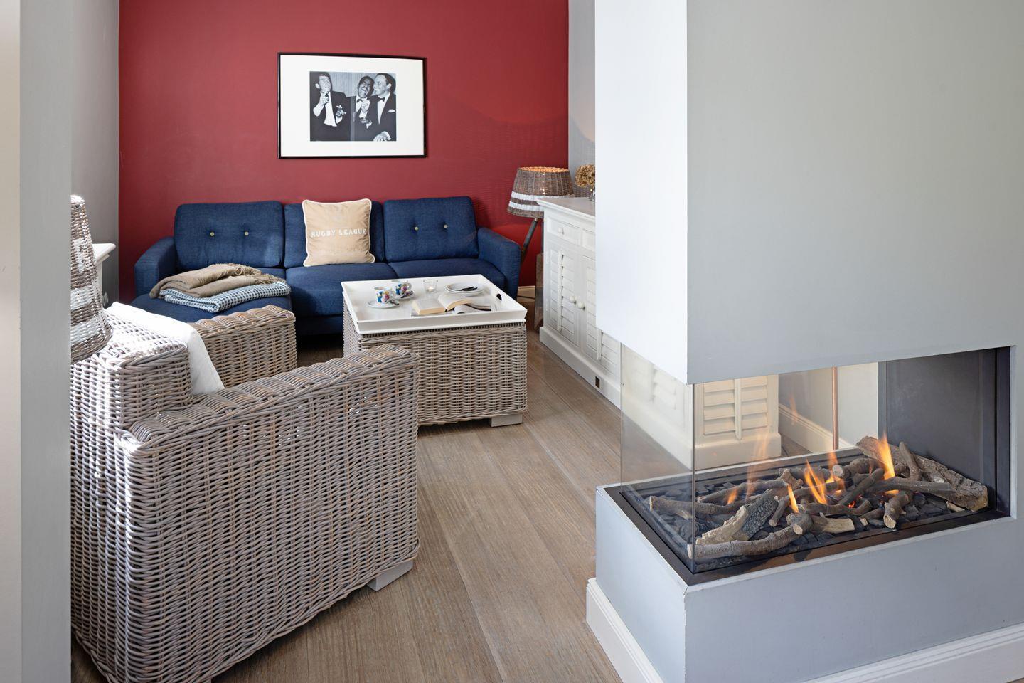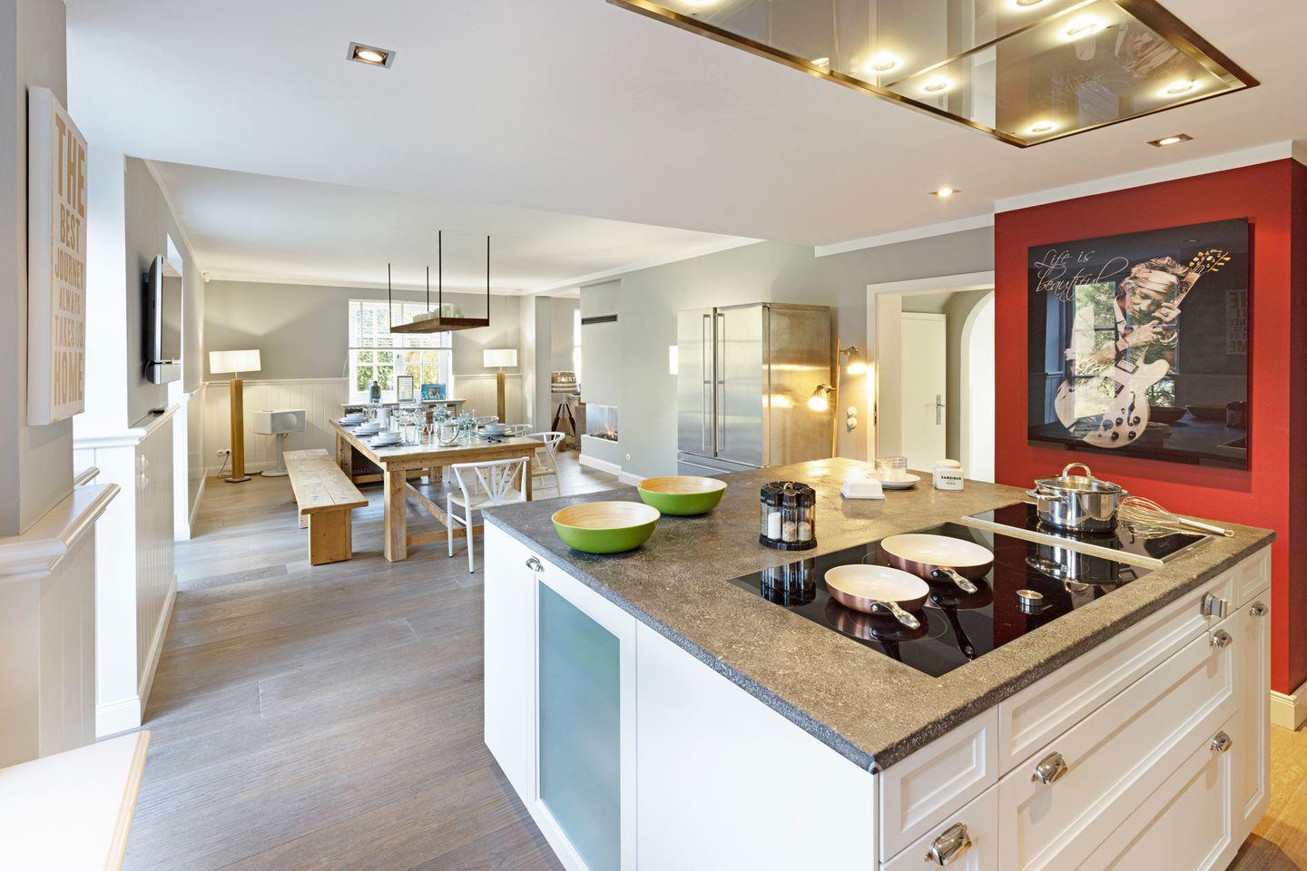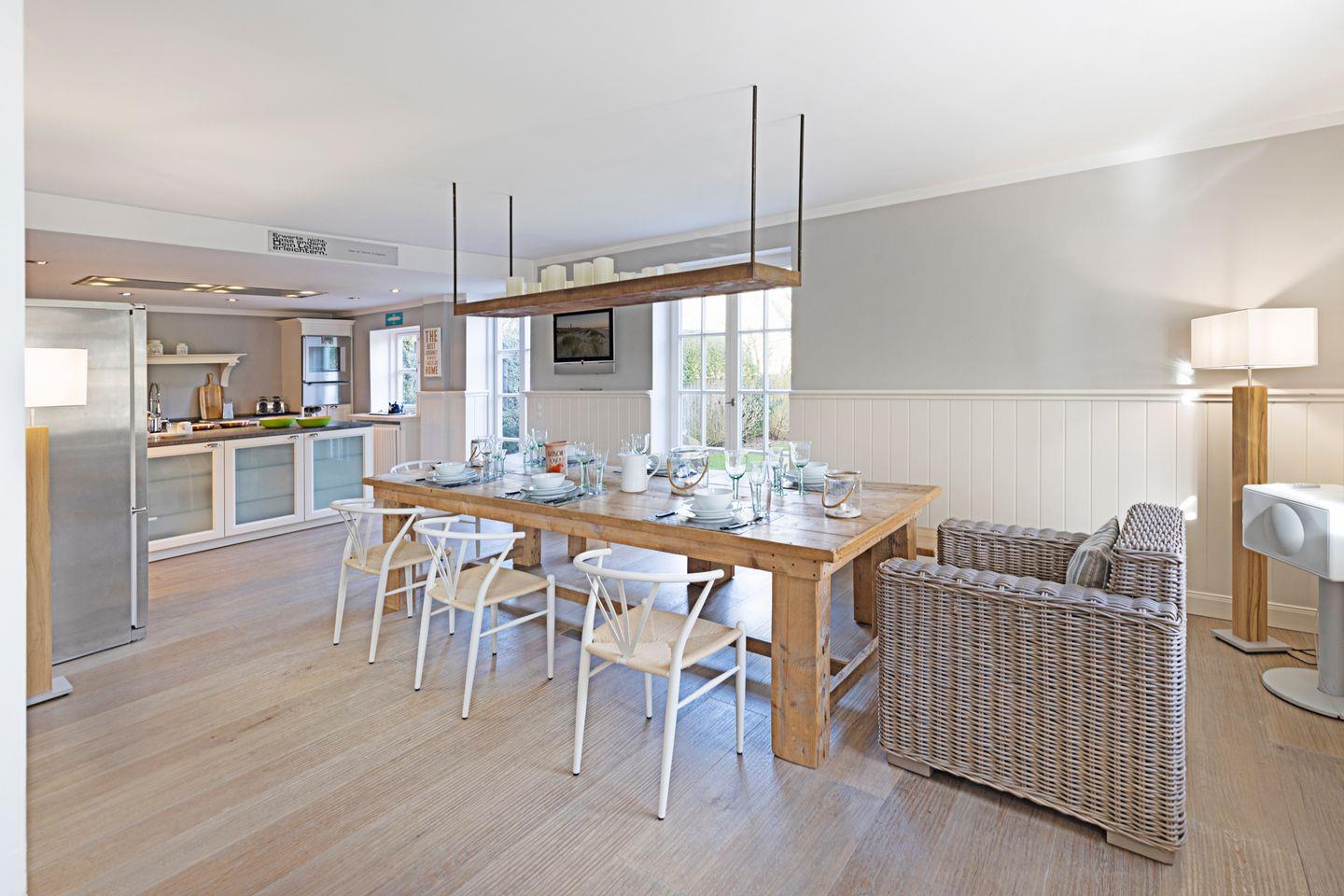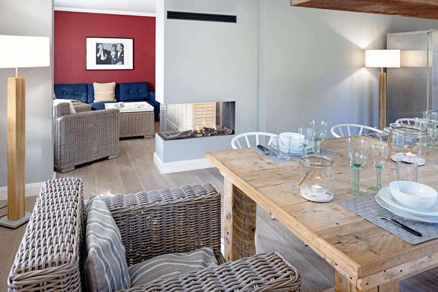 Der zentrale, von drei Seiten einsehbare Kamin, trennt den gemütlichen Lounge-Bereich vom Essbereich mit seinem urigen Esstisch. Hier schließt sich eine große offene Küche mit Kochinsel an und lädt zum gemeinsamen Kochen und Essen ein. Von hier gelangt man auch in den Garten mit schöner Terrasse.