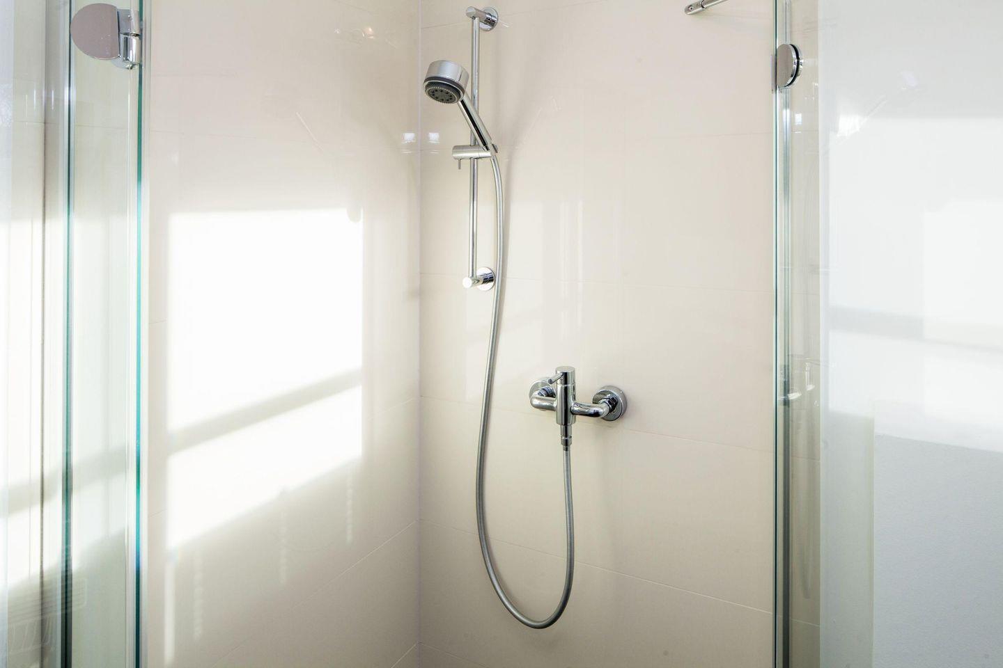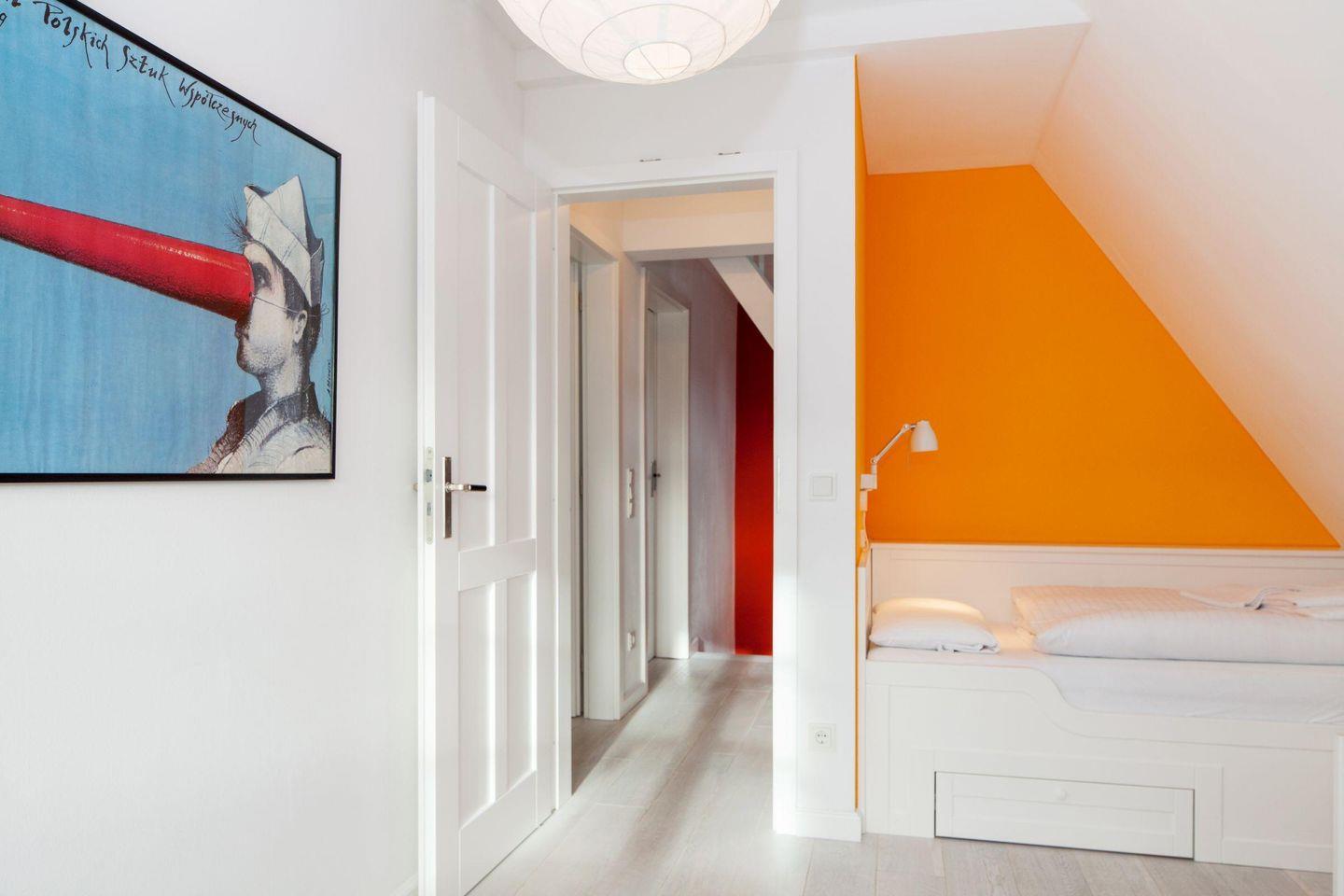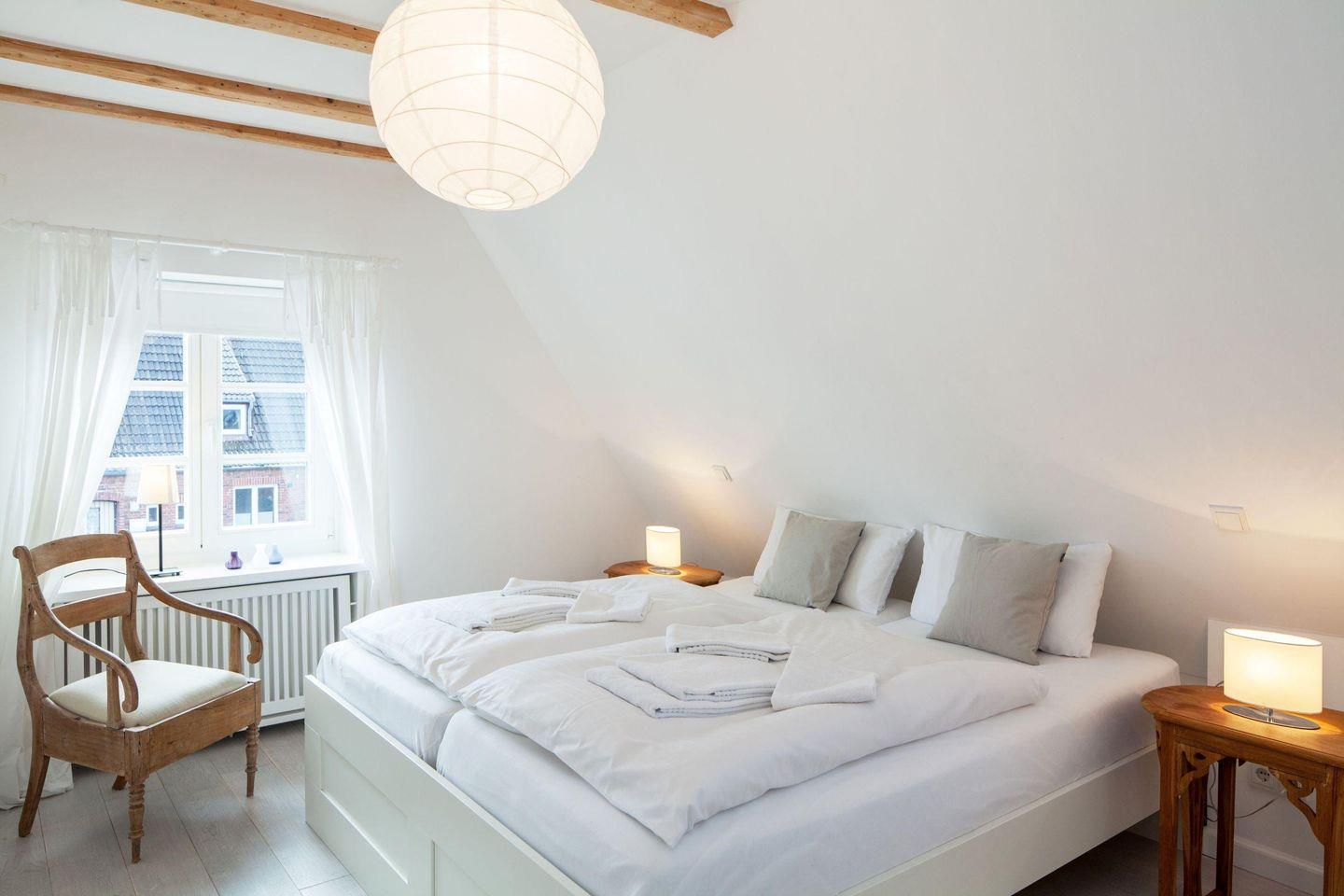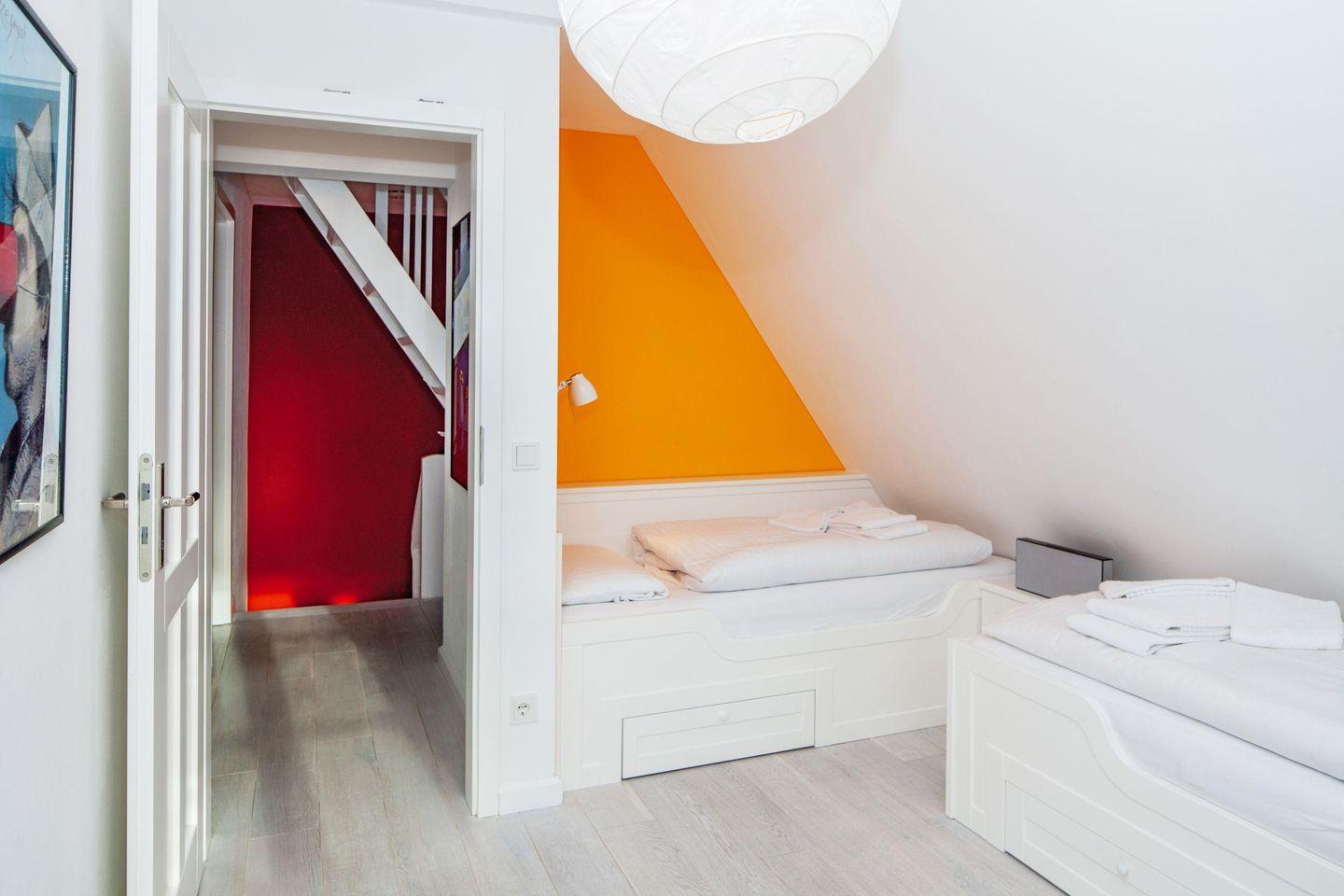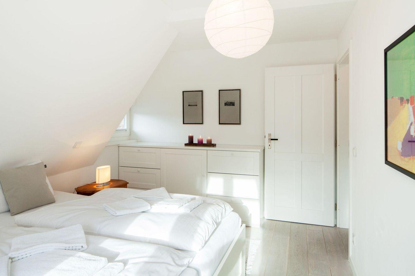 Sie betreten das Haus über einen kleinen Flur mit großzügiger Garderobe. Links gelangen Sie in das Haupthaus, rechts in den Wintergarten-Anbau. Im gesamten Haus sorgen weiß gekalkte Eichendielen für eine helle, freundliche Atmosphäre. Über eine helle Holztreppe gelangen Sie in den ersten Stock, wo sich ein Schlafzimmer mit Doppelbett, ein Kinderzimmer mit zwei Einzelbetten und ein Badezimmer mit großer Dusche, zwei Waschbecken, WC, Bidet und Fußbodenheizung befinden. Ein weiteres Doppelbett steht im Wintergarten-Anbau im Erdgeschoss zur Verfügung.