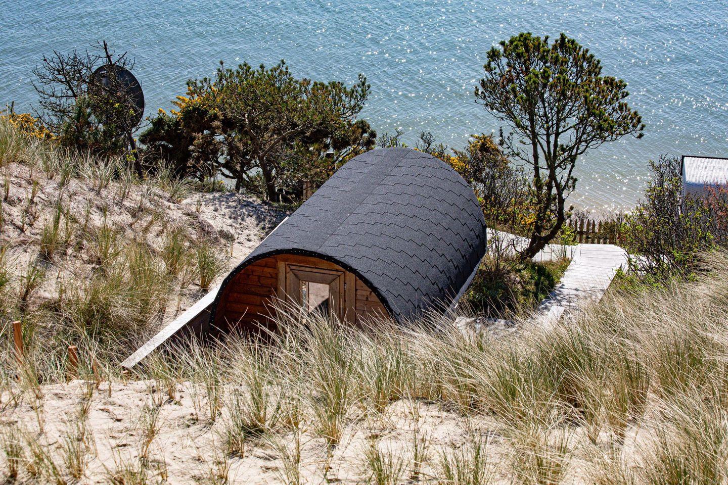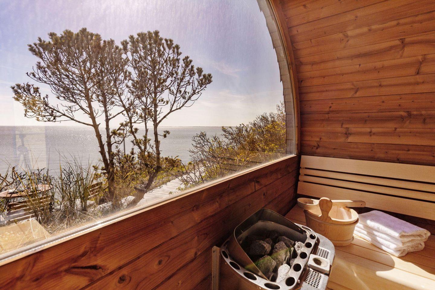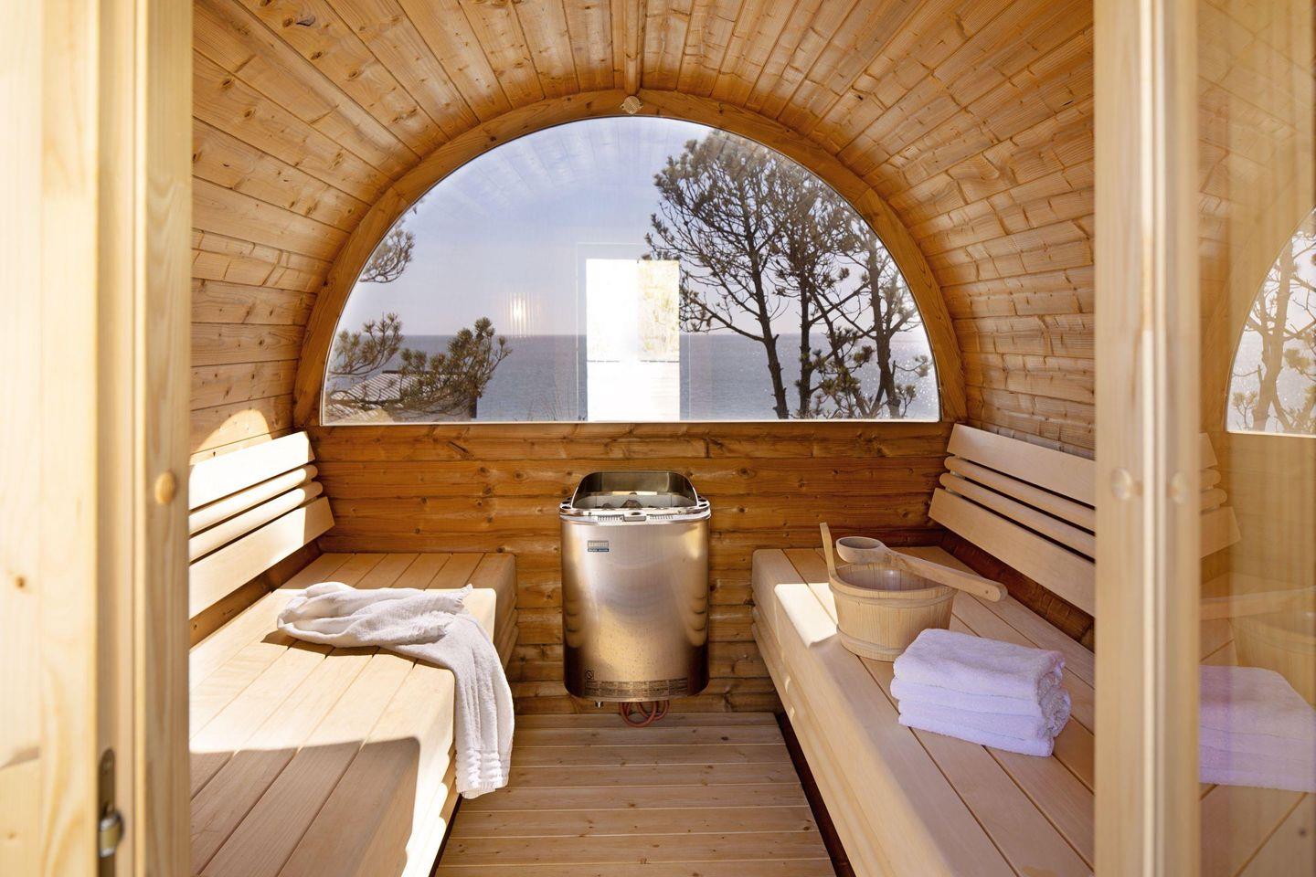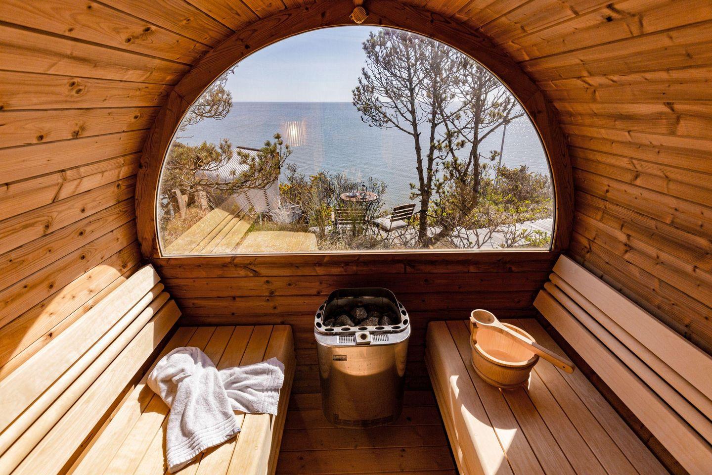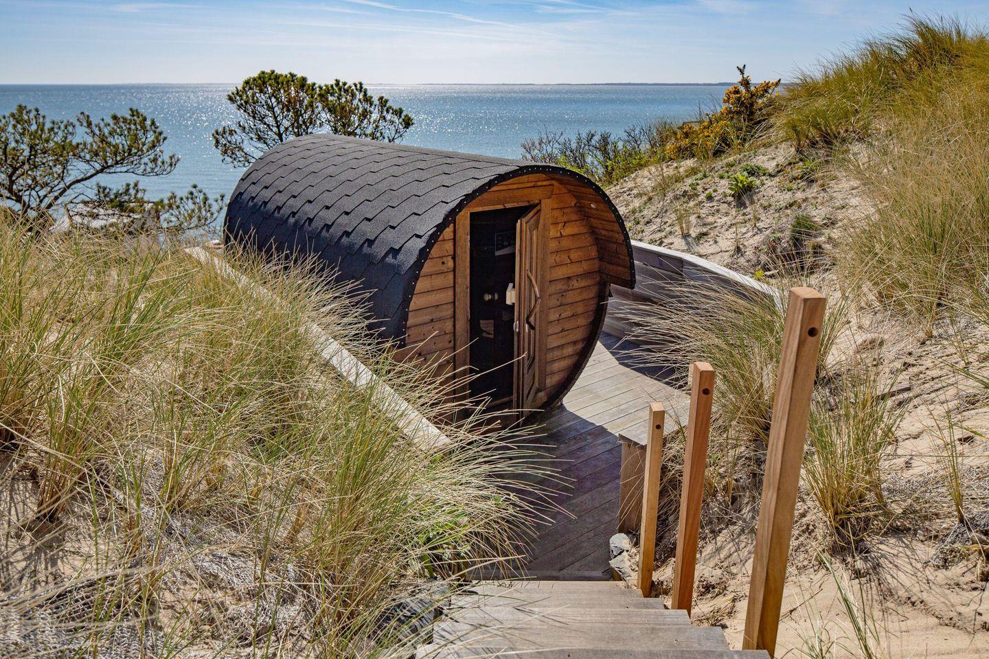 Im Garten befindet sich eine Faß-Sauna zu Ihrer alleinigen Nutzung mit Blick auf das Meer und ein Terrassenplatz.