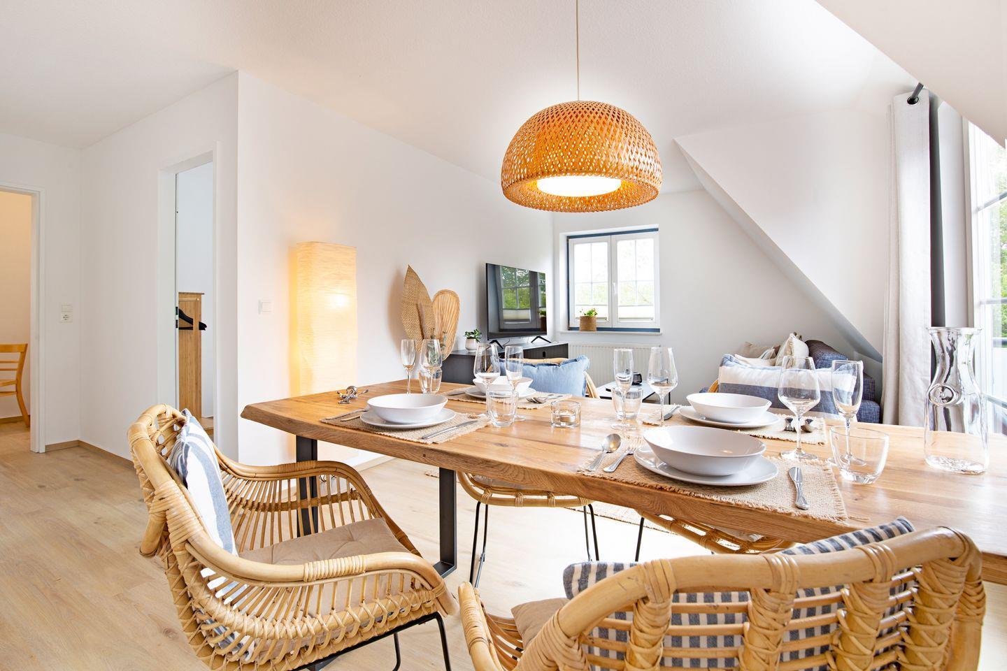 offen gestalteten Wohnbereich mit gemütlicher Sofaecke und Essplatz – ideal für entspannte