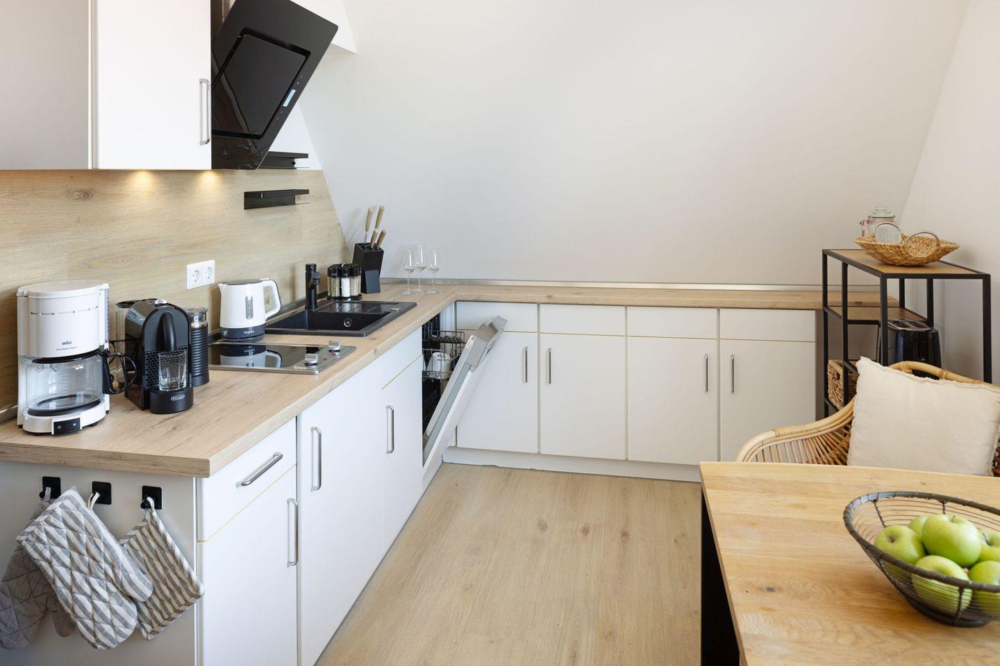 ausgestattete Küche verfügt über Spülmaschine, Kühlschrank mit Gefrierfach, Herd, Mikrowelle,