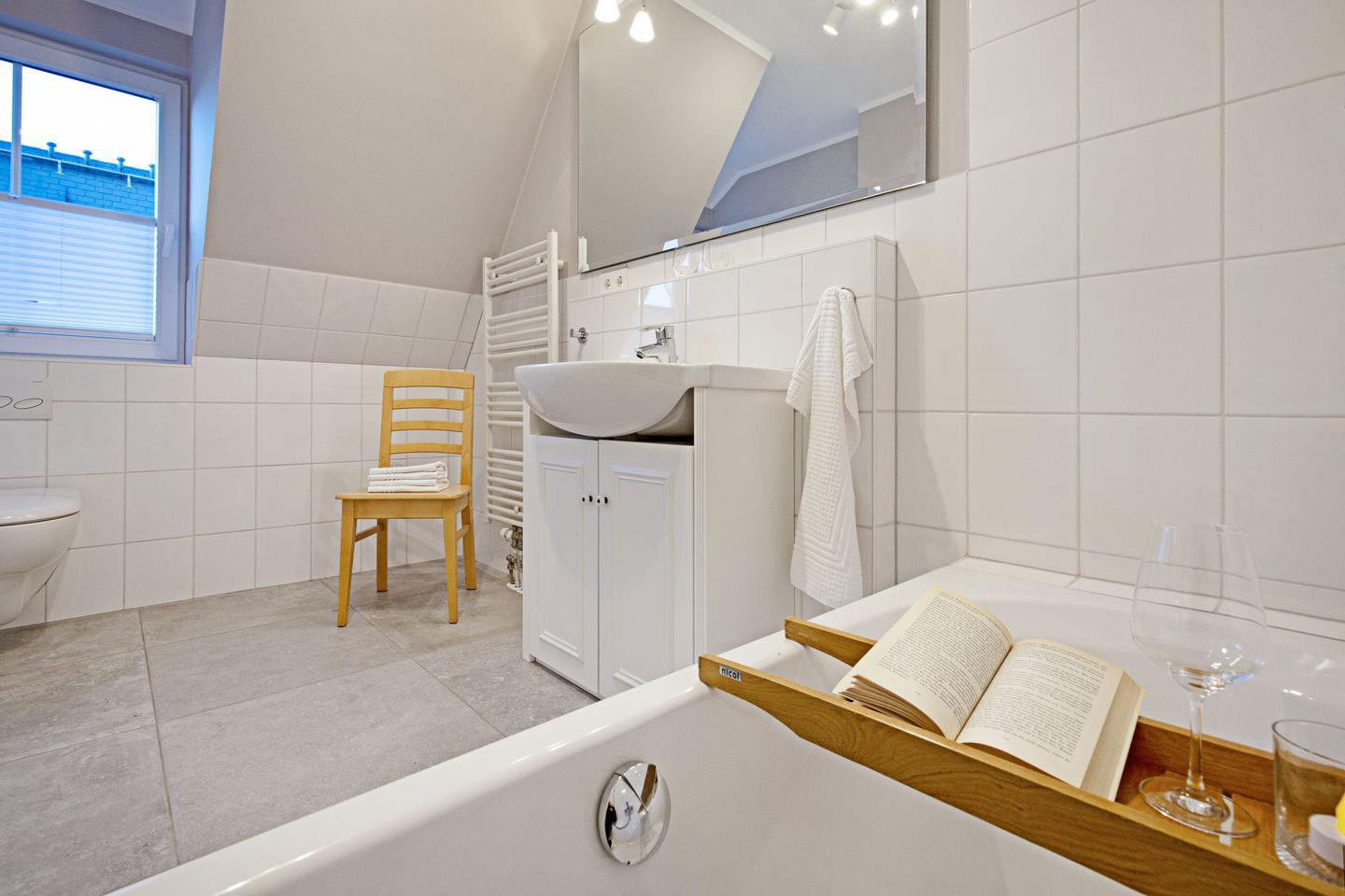 Vom Wohnbereich aus erreichen Sie Ihren sonnendurchfluteten Garten mit Terrasse und Gartenmöbeln. Im ersten Stock befindet sich ein Schlafzimmer mit Doppelbett und TV-Gerät sowie das Badezimmer mit Duschbadewanne.